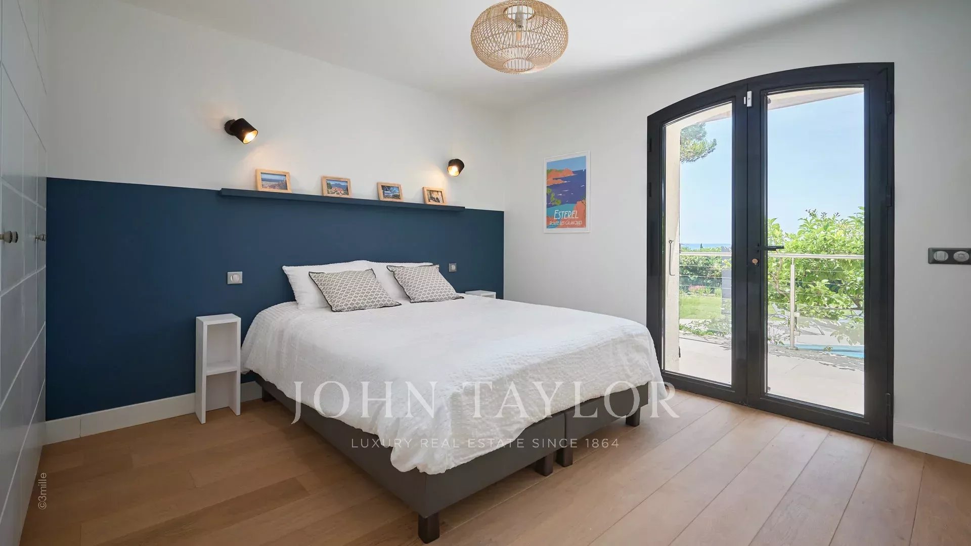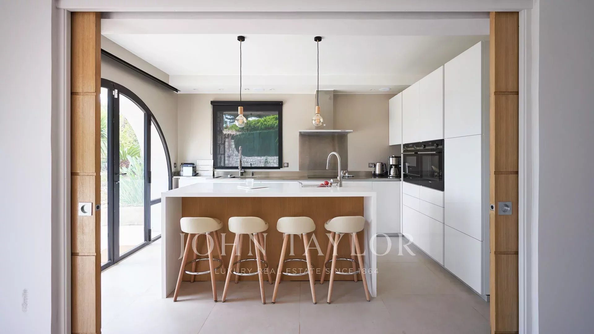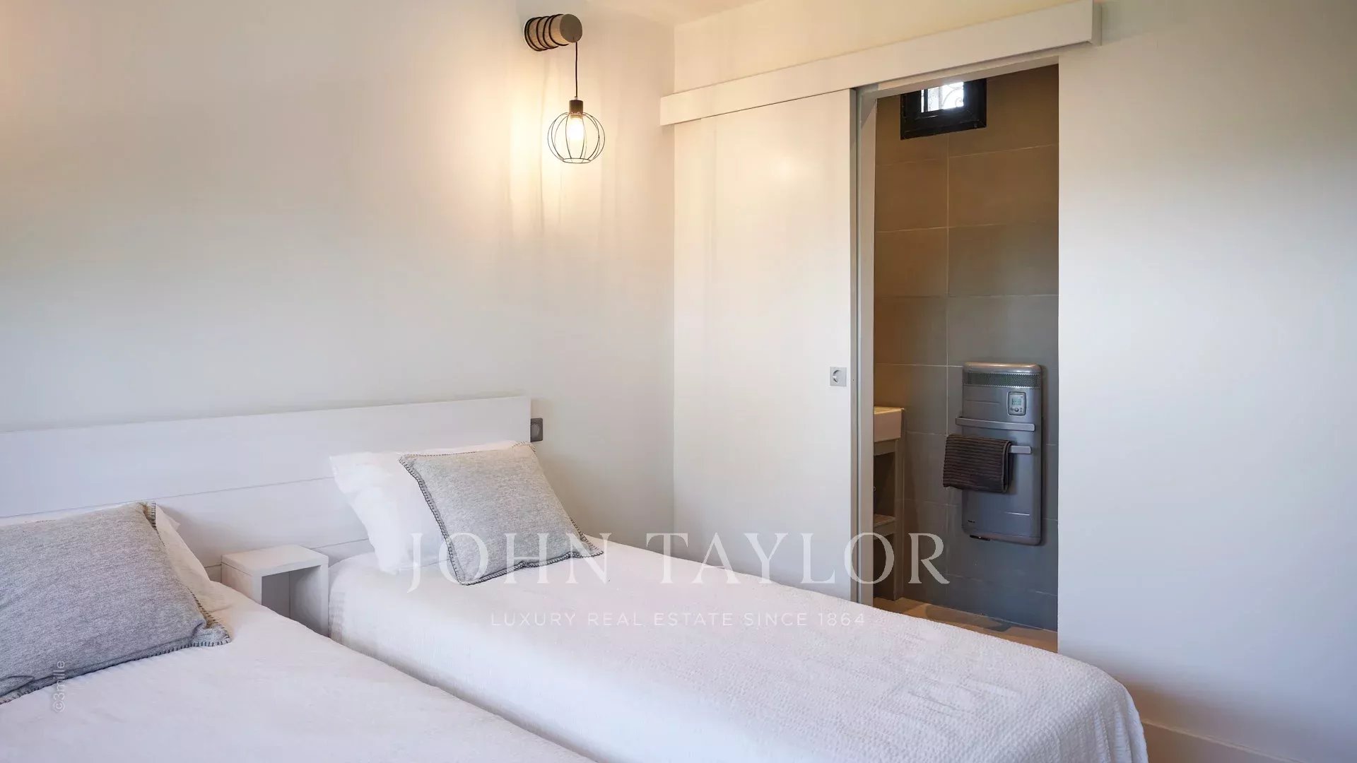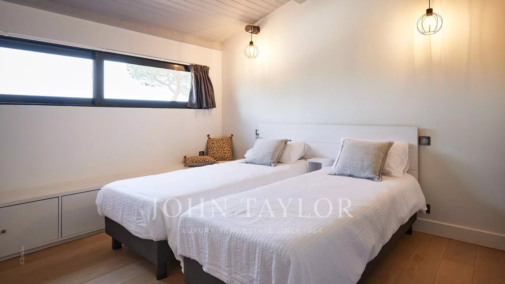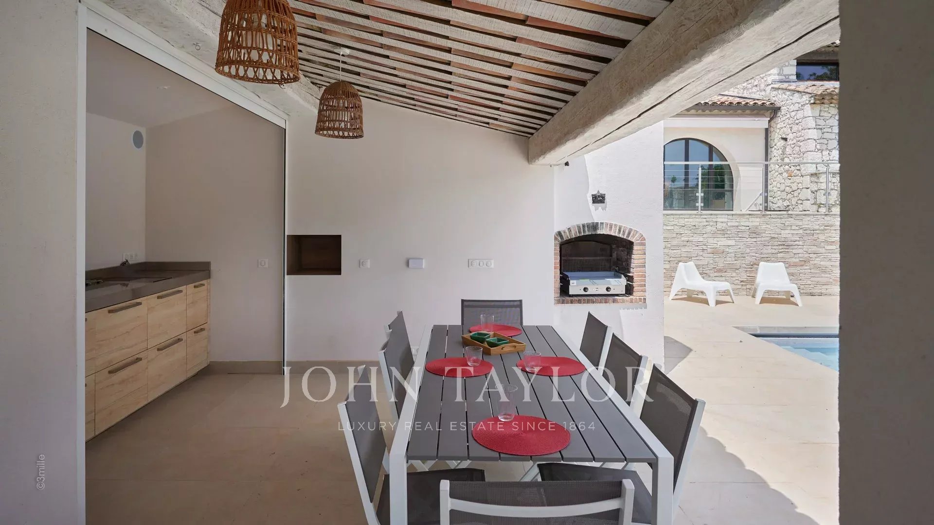 Sur les hauteurs de Golfe-Juan, à 10 minutes en voiture de ses plages et restaurants, dans un quartier résidentiel, belle villa provençale entièrement rénovée et climatisée offrant 300 m2 habitables, sur trois niveaux, au cœur d’un terrain plat de 3 000 m2. Petite vue mer.