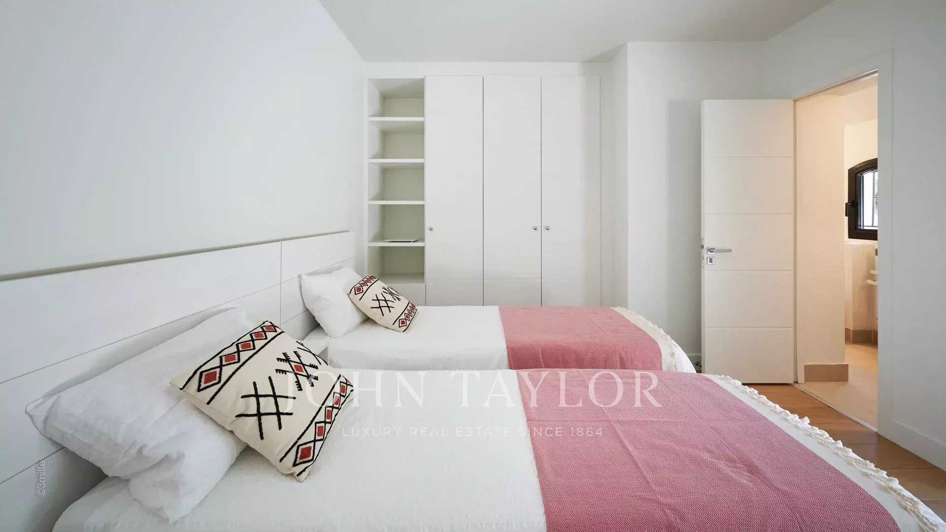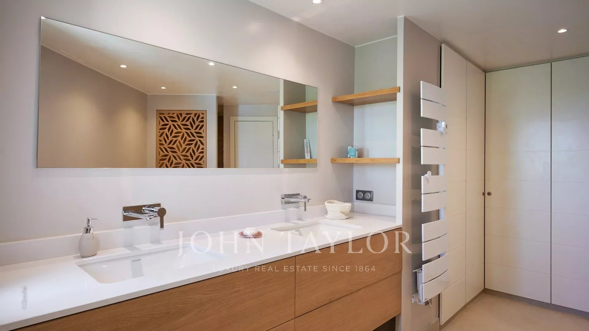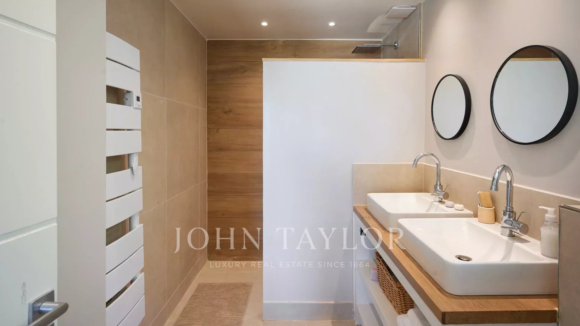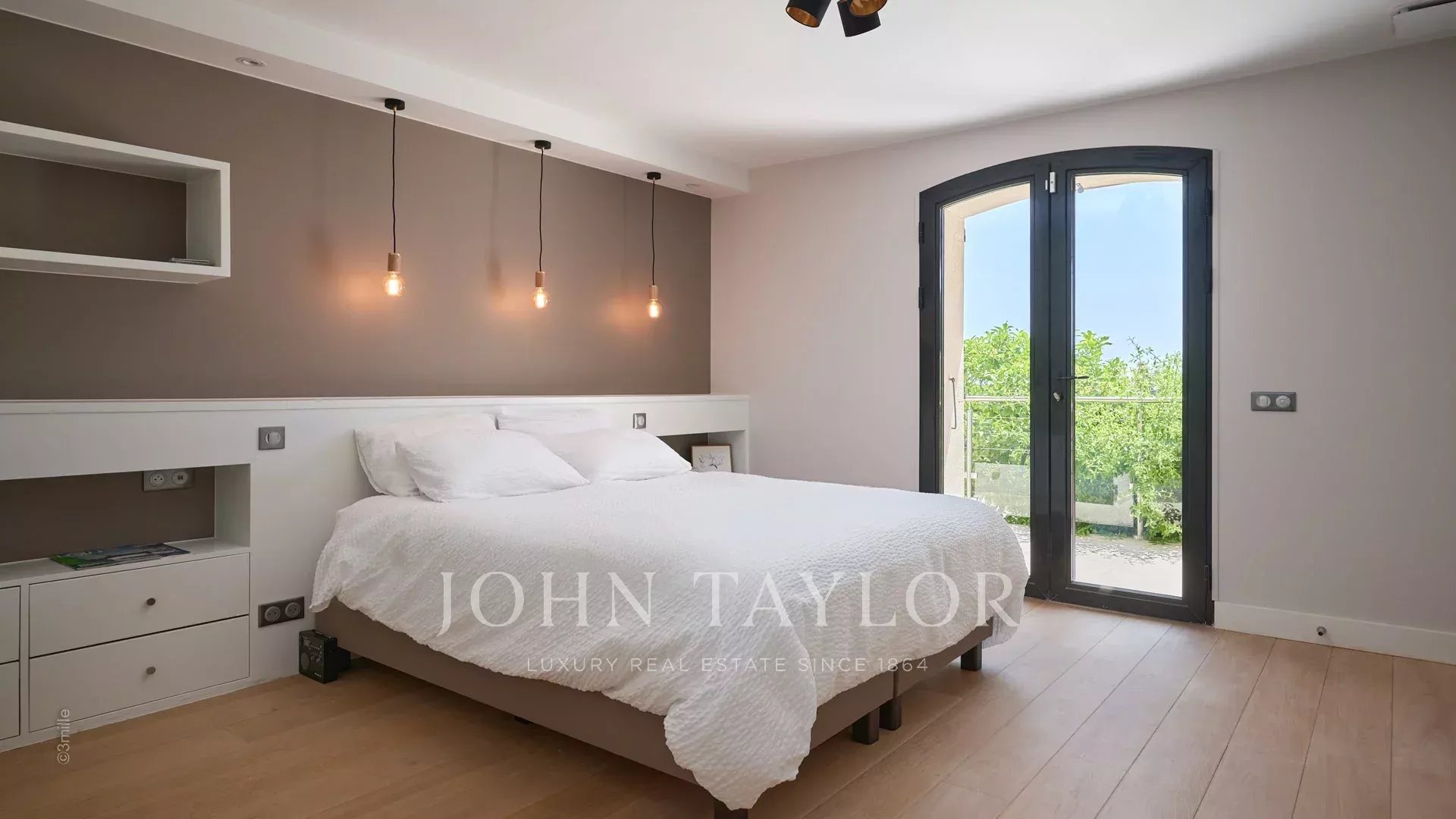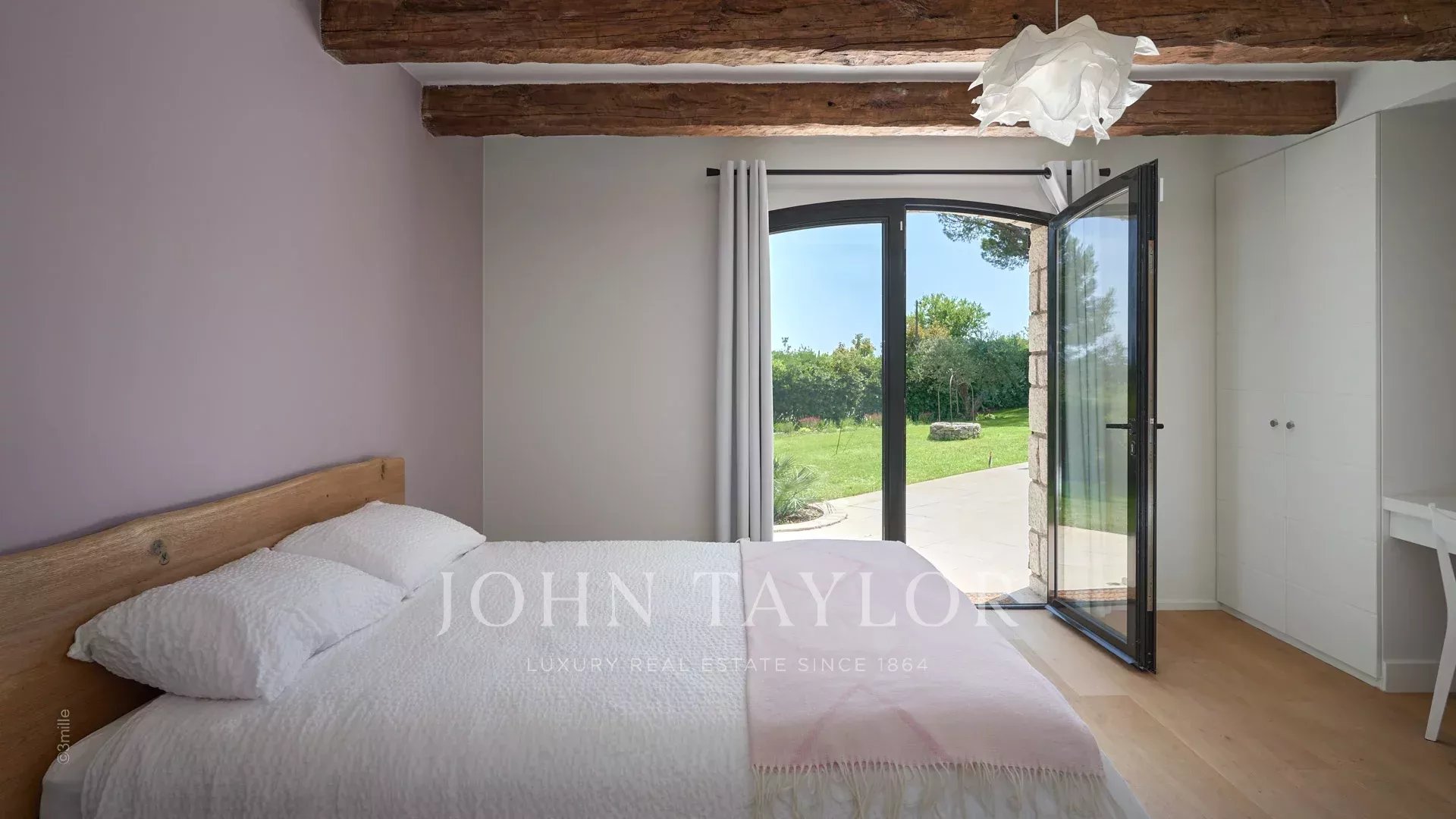 Sur les hauteurs de Golfe-Juan, à 10 minutes en voiture de ses plages et restaurants, dans un quartier résidentiel, belle villa provençale entièrement rénovée et climatisée offrant 300 m2 habitables, sur trois niveaux, au cœur d’un terrain plat de 3 000 m2. Petite vue mer.