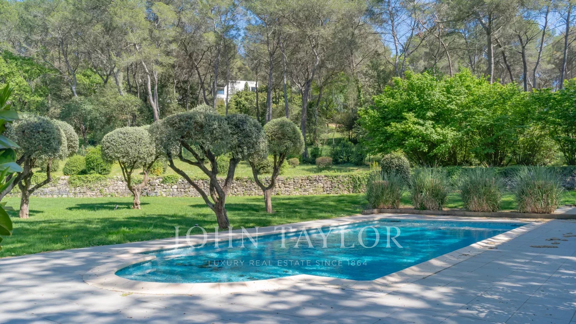 Une piscine entourée de verdure.