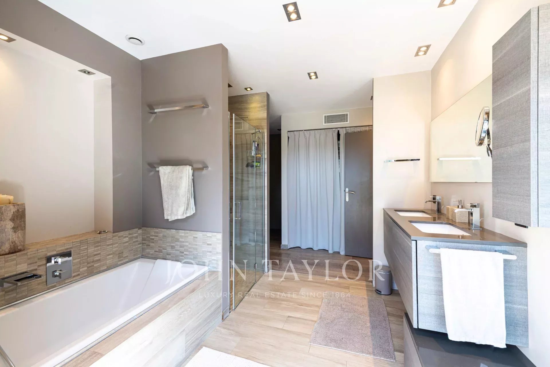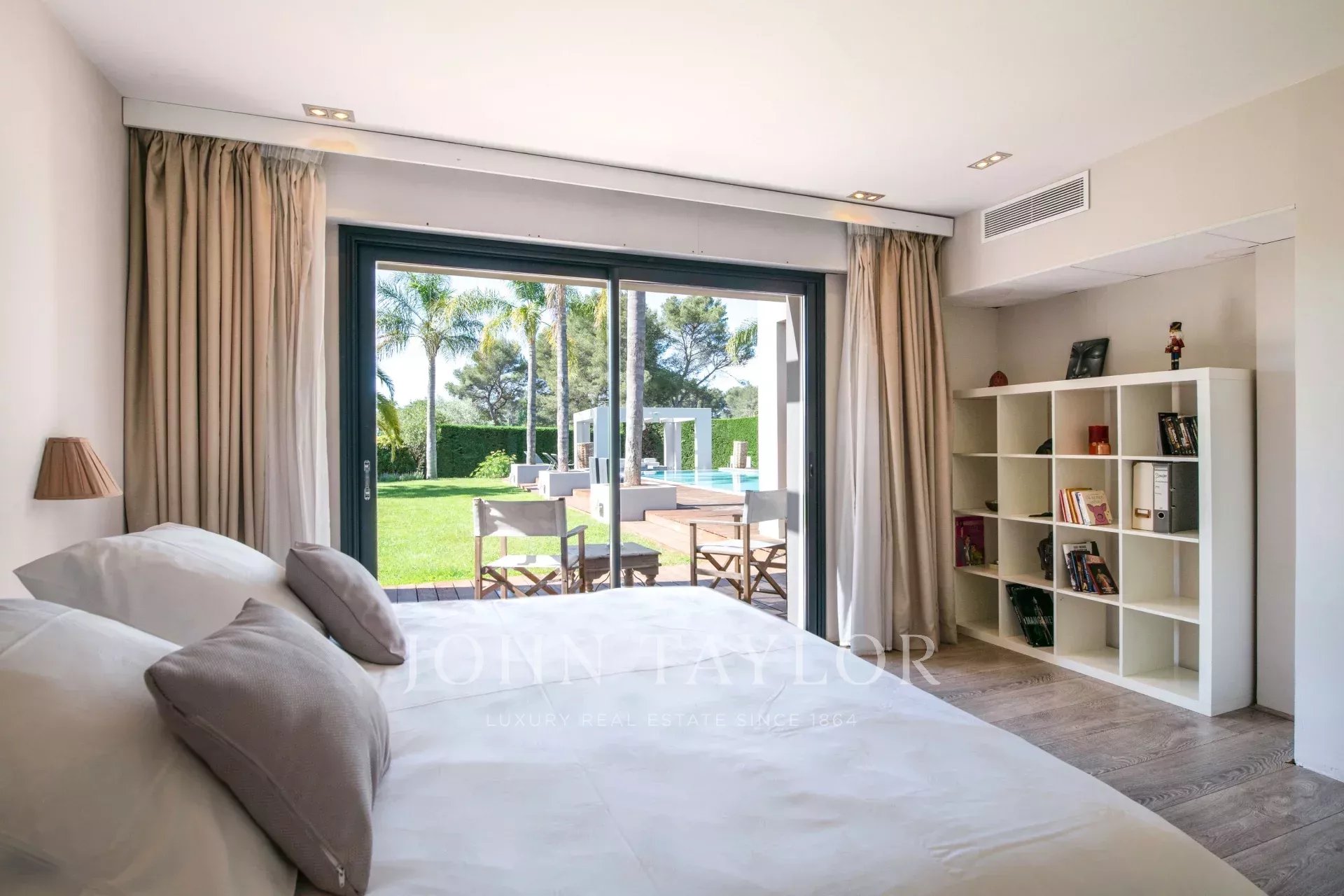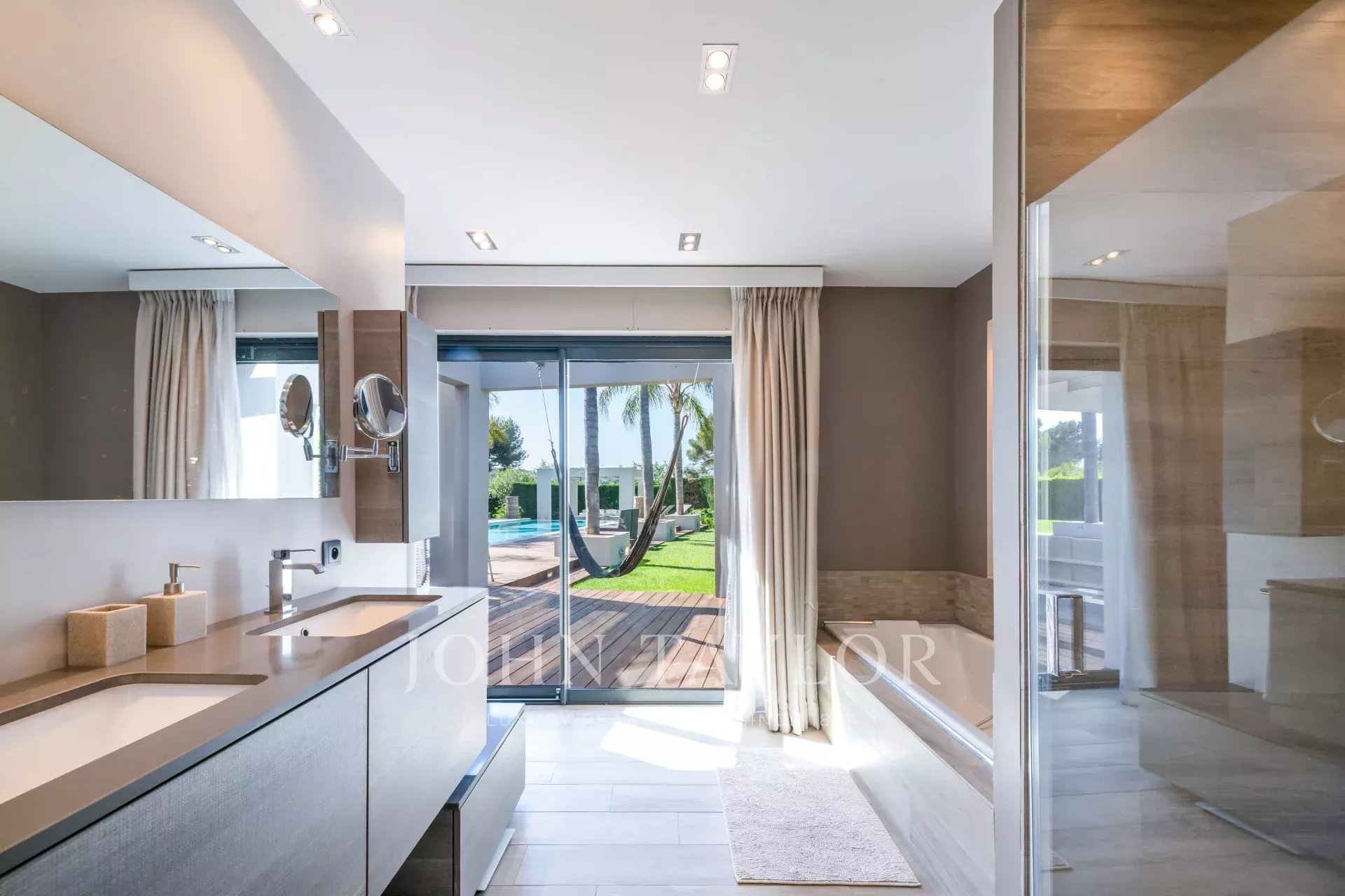 Suite Parentale (40 m²) : lit double (180x200cm), dressing, salle de bains attenante avec double vasque, baignoire, douche et WC, le tout avec vue sur le jardin et la piscine.