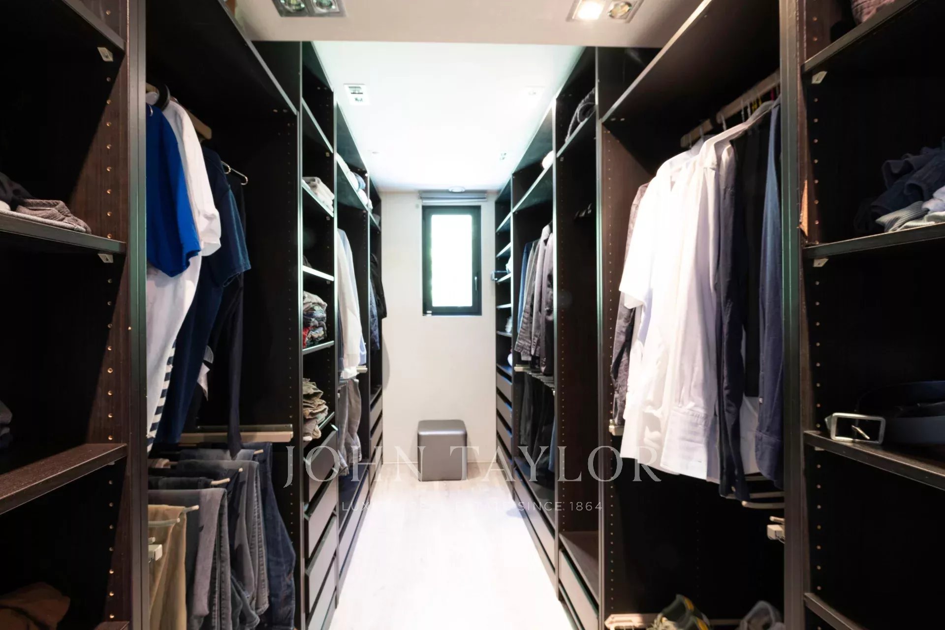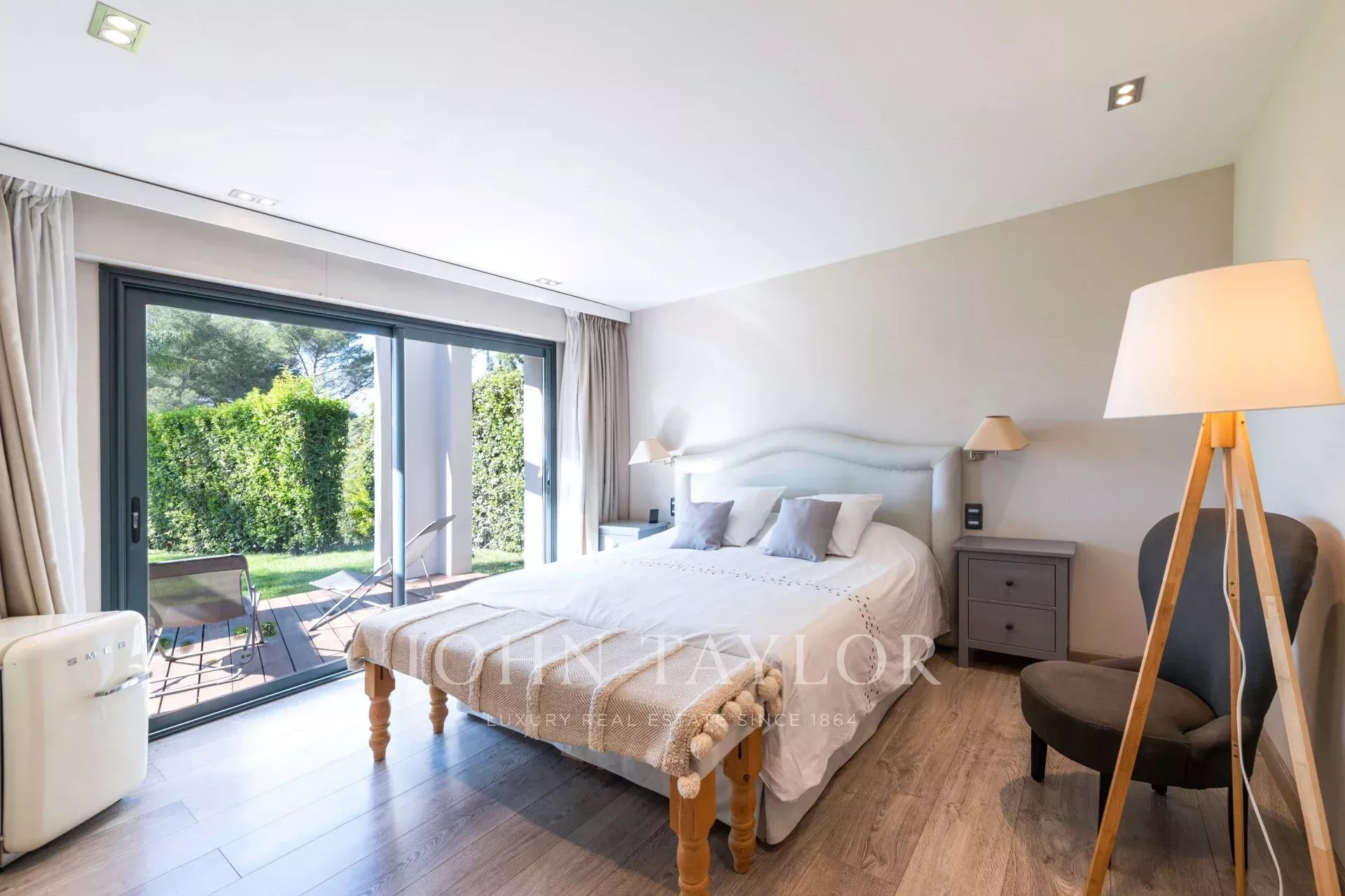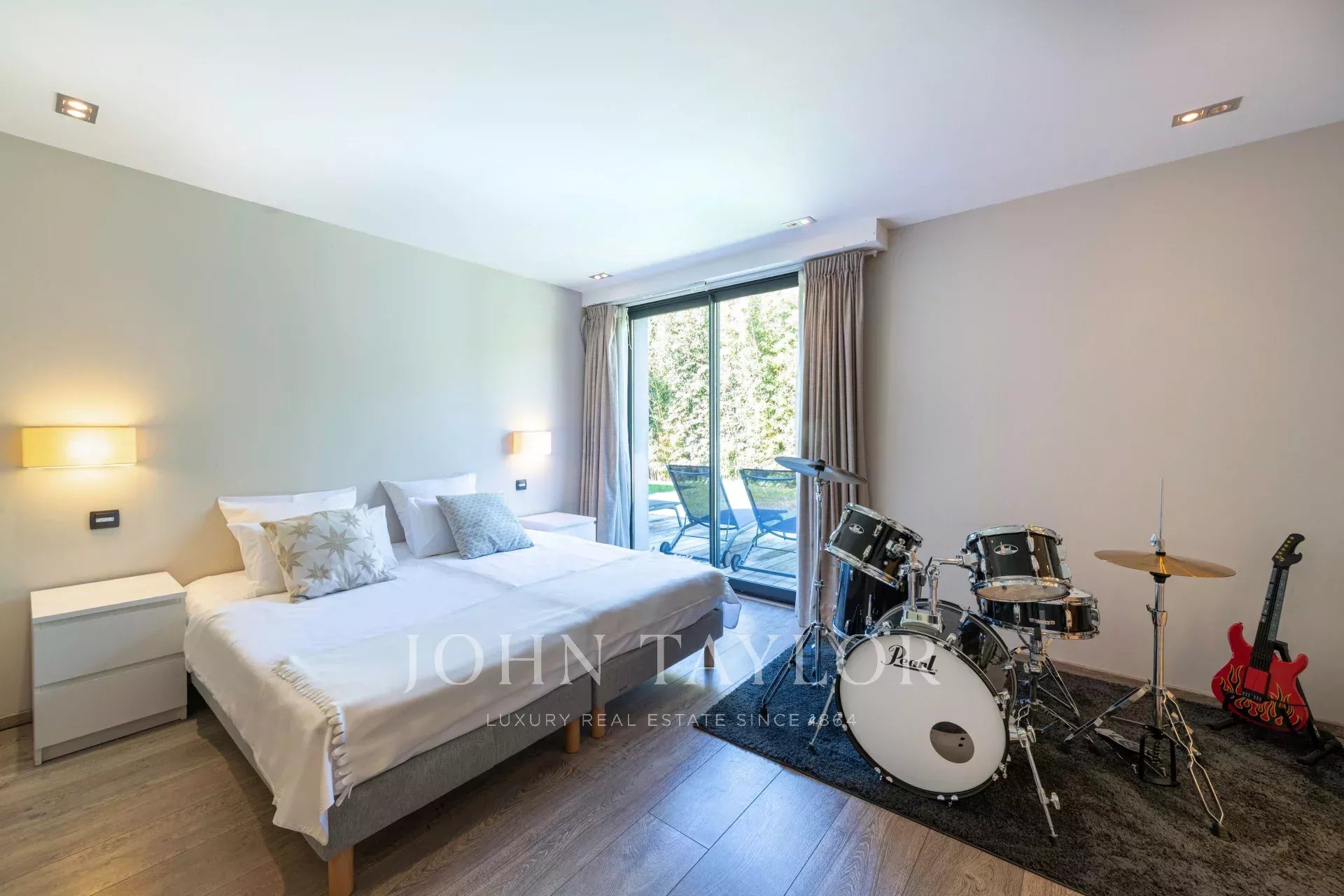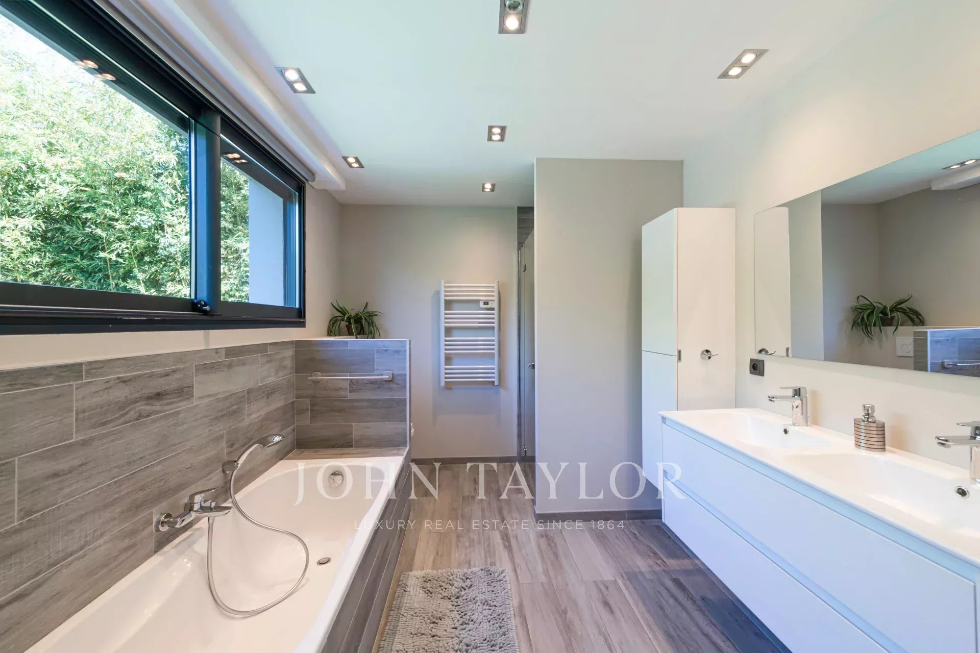 Suite Parentale (40 m²) : lit double (180x200cm), dressing, salle de bains attenante avec double vasque, baignoire, douche et WC, le tout avec vue sur le jardin et la piscine.