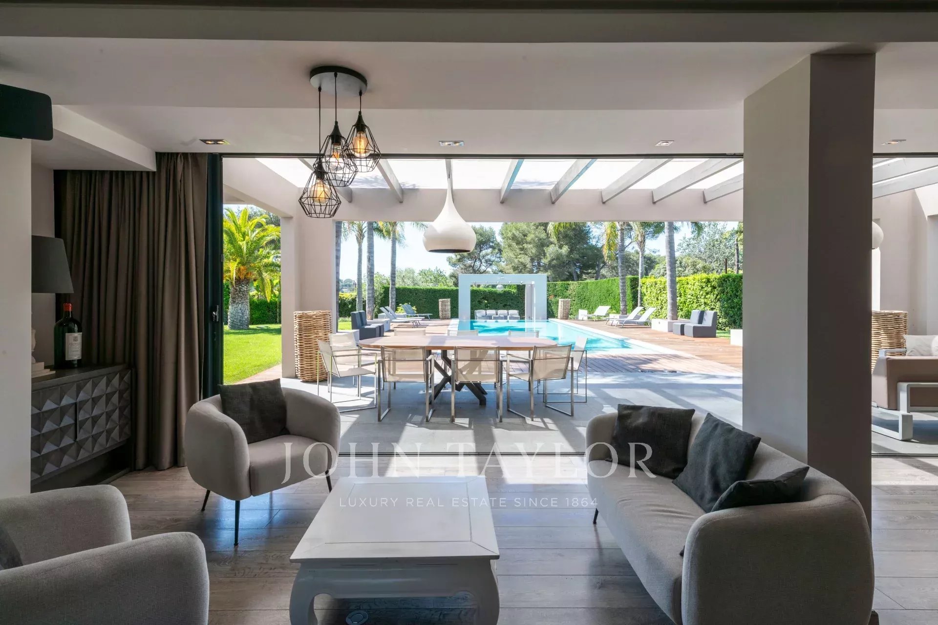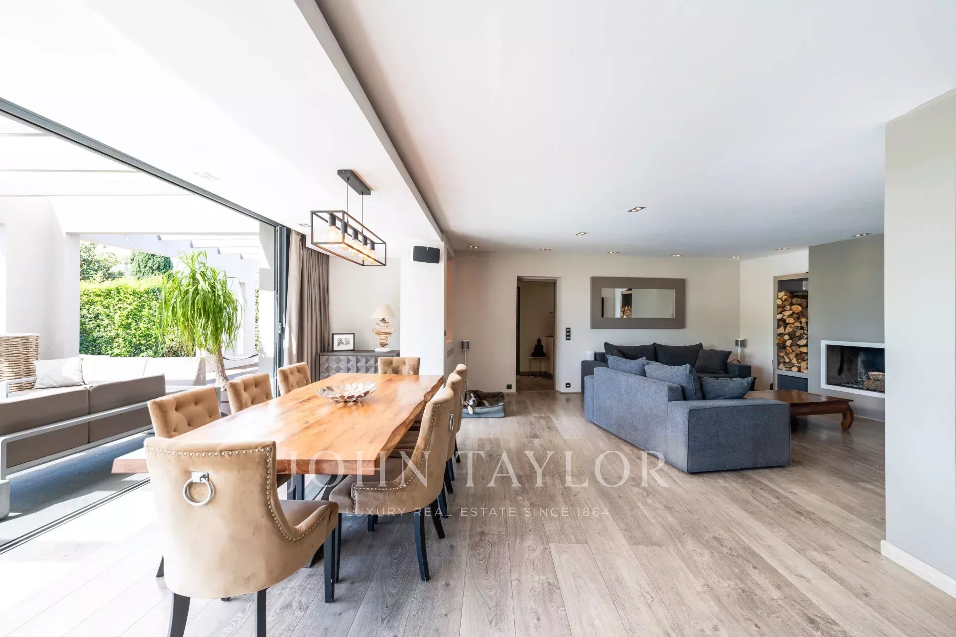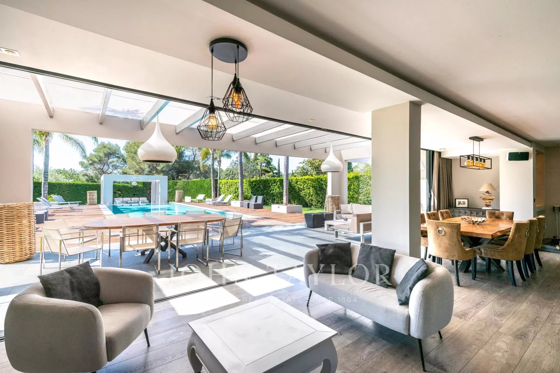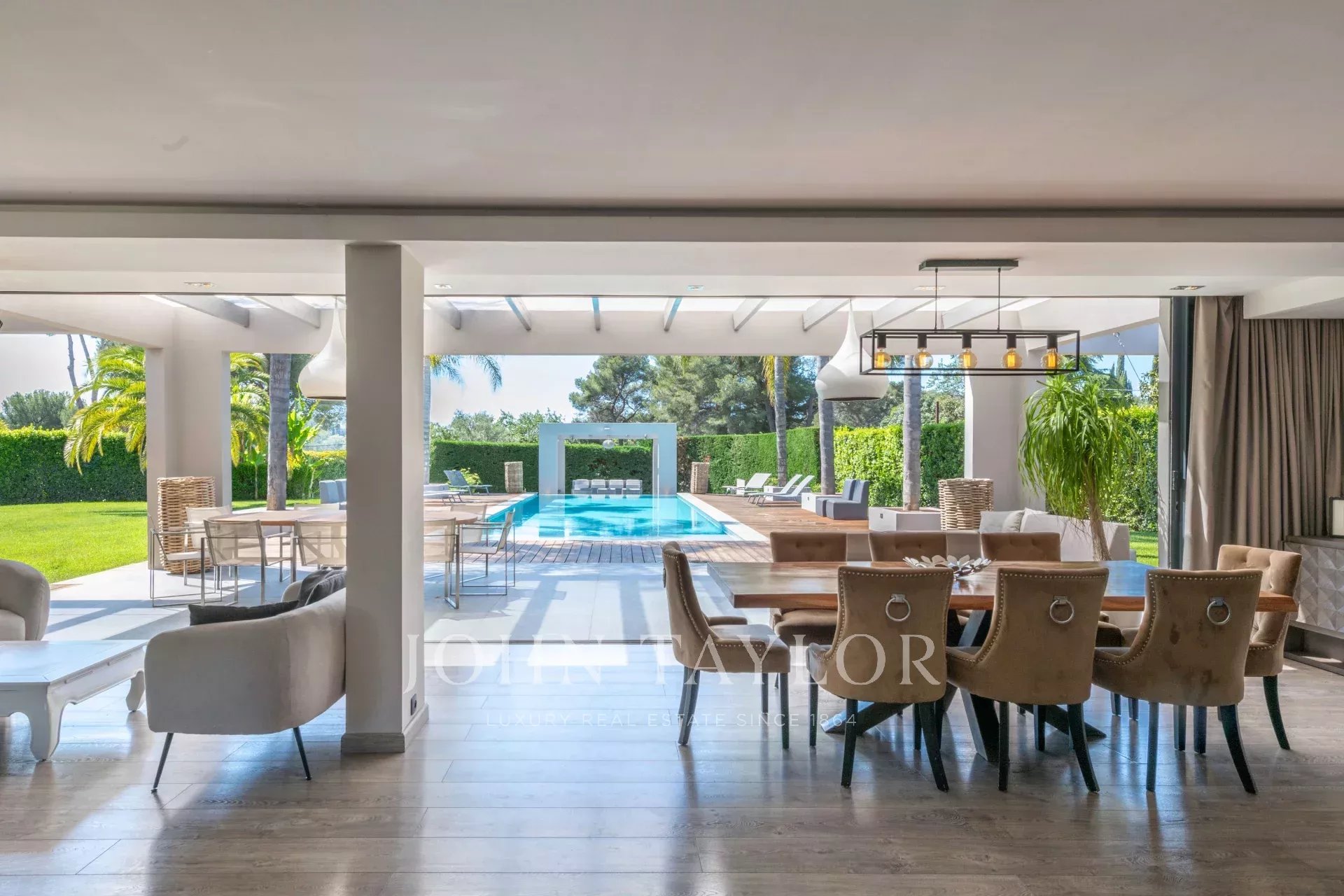 Séjour spacieux de 100 m² baigné de lumière naturelle grâce à ses baies vitrées de 9 mètres de large, s’ouvrant sur une vaste terrasse, un jardin paysager et une piscine chauffée de 5x15m – parfait pour recevoir ou se détendre.