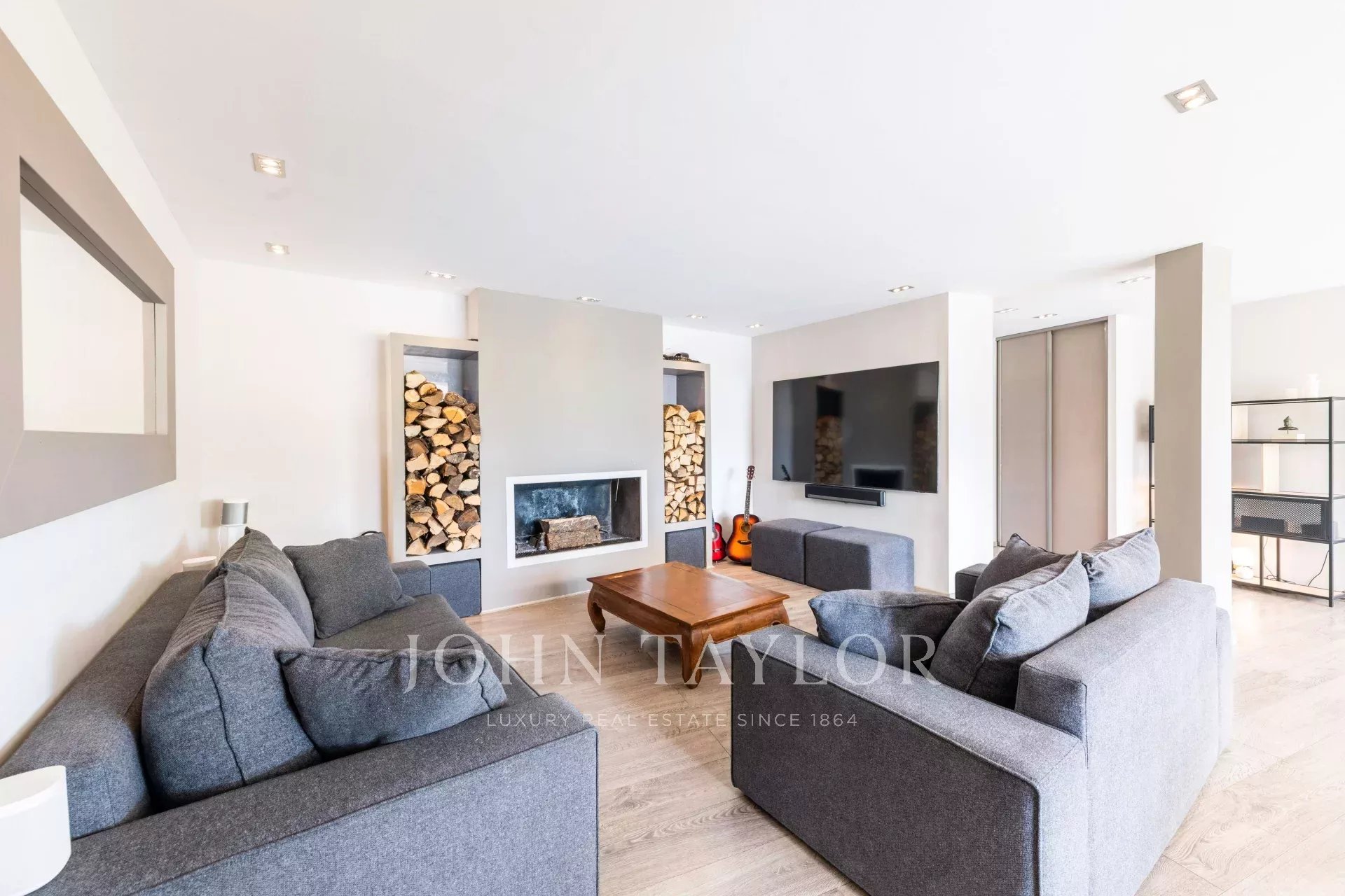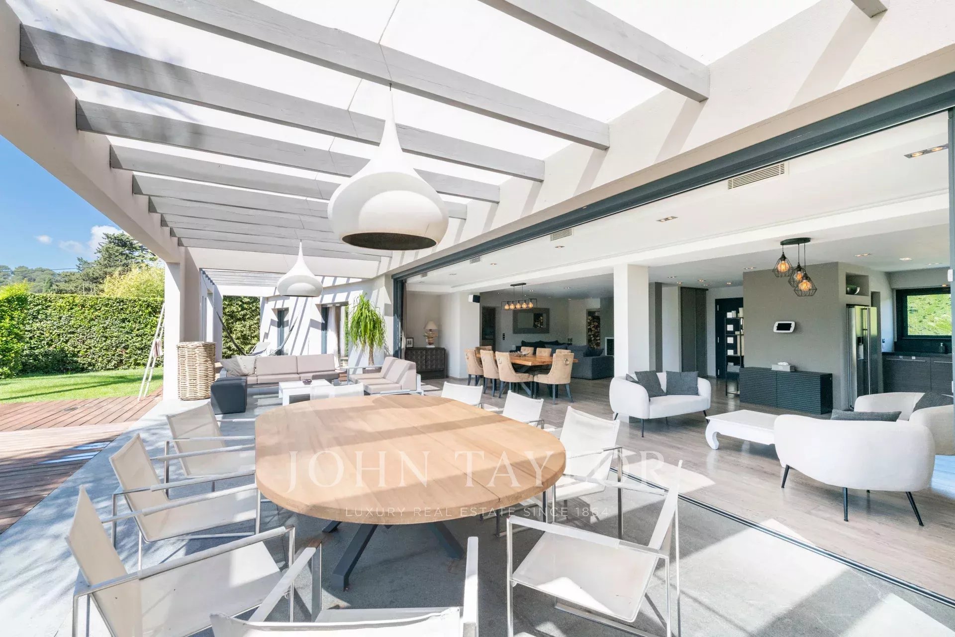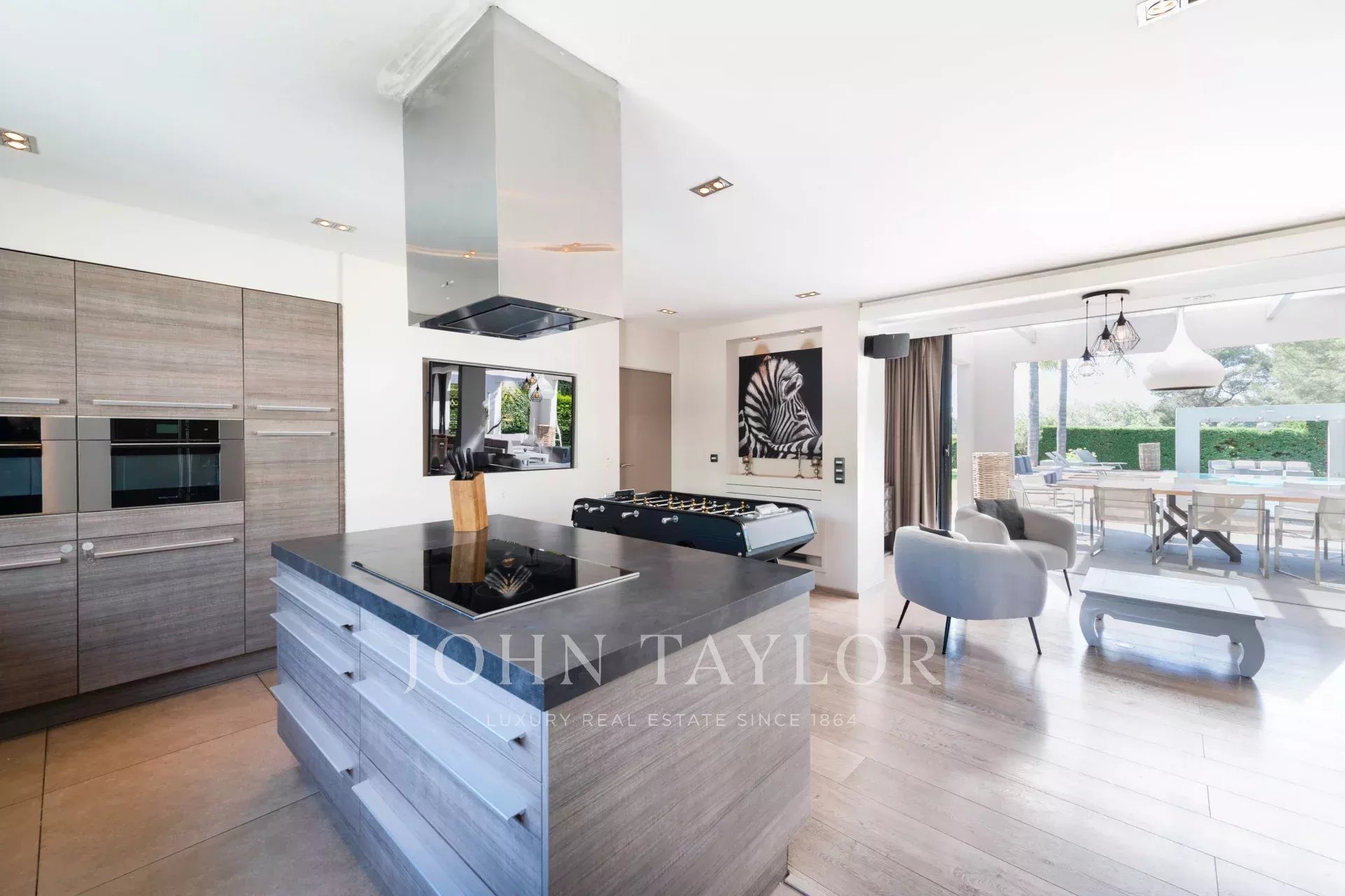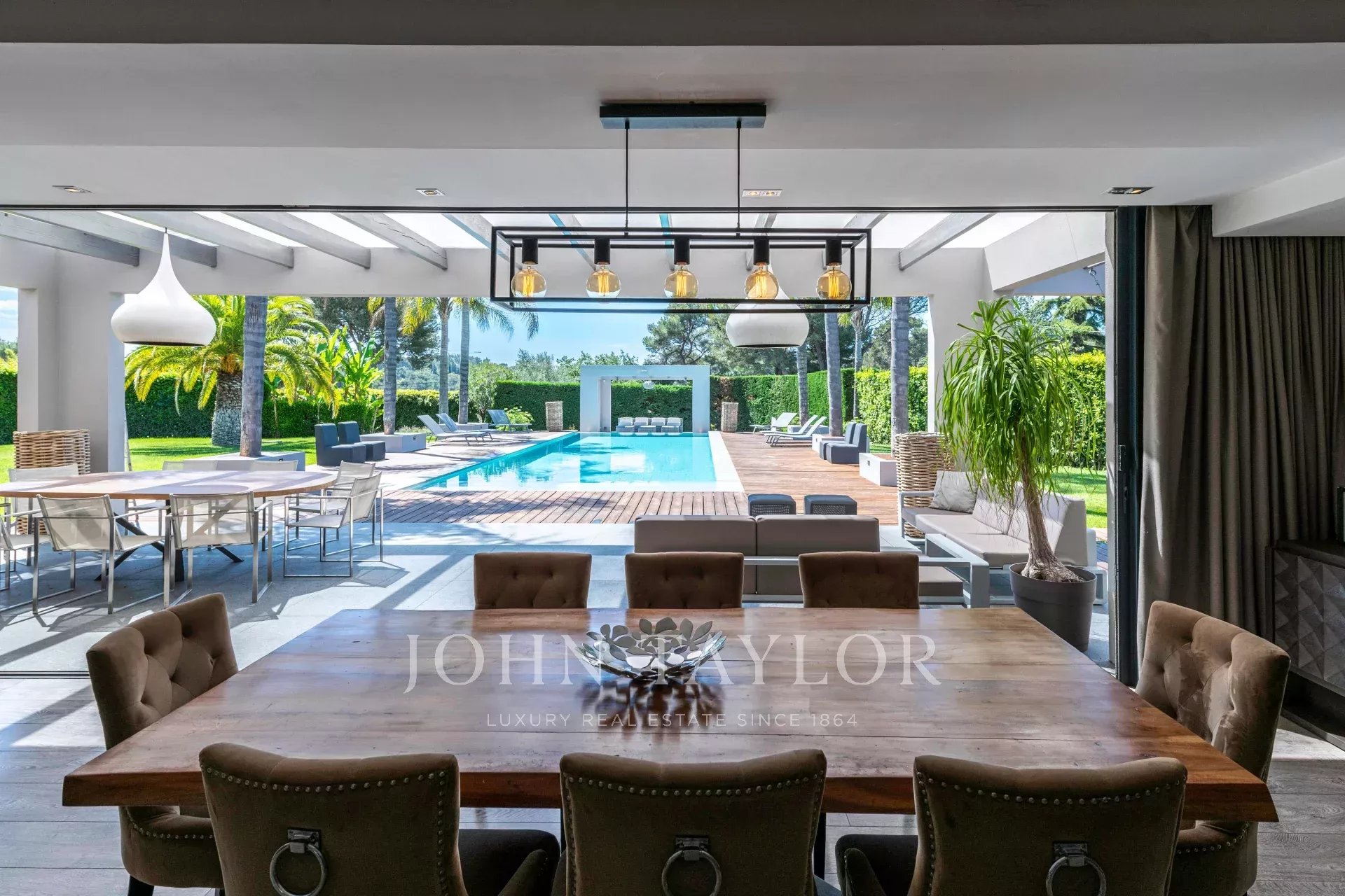 Séjour spacieux de 100 m² baigné de lumière naturelle grâce à ses baies vitrées de 9 mètres de large, s’ouvrant sur une vaste terrasse, un jardin paysager et une piscine chauffée de 5x15m – parfait pour recevoir ou se détendre.