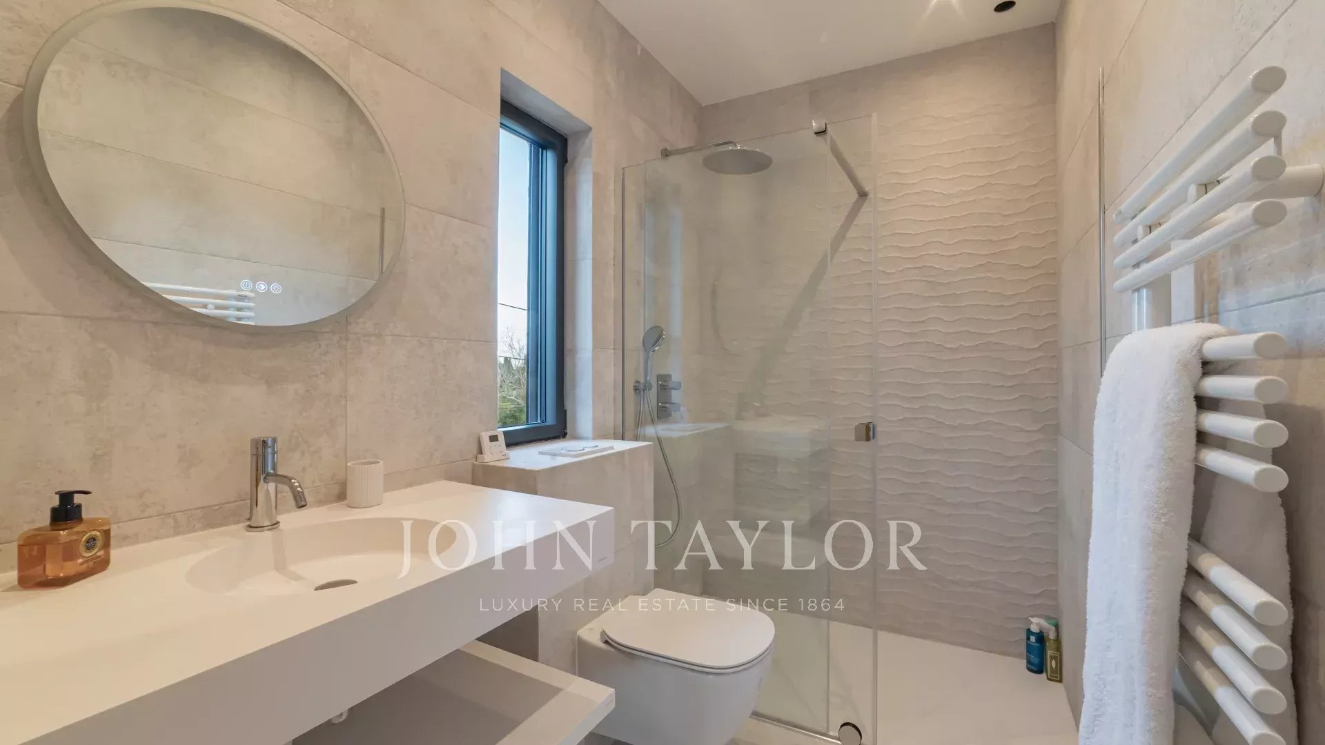 Fibre optique, climatisation, chauffage au sol, domotique, borne de recharge électrique (22kW), baies à galandages, alarme, portail électrique.