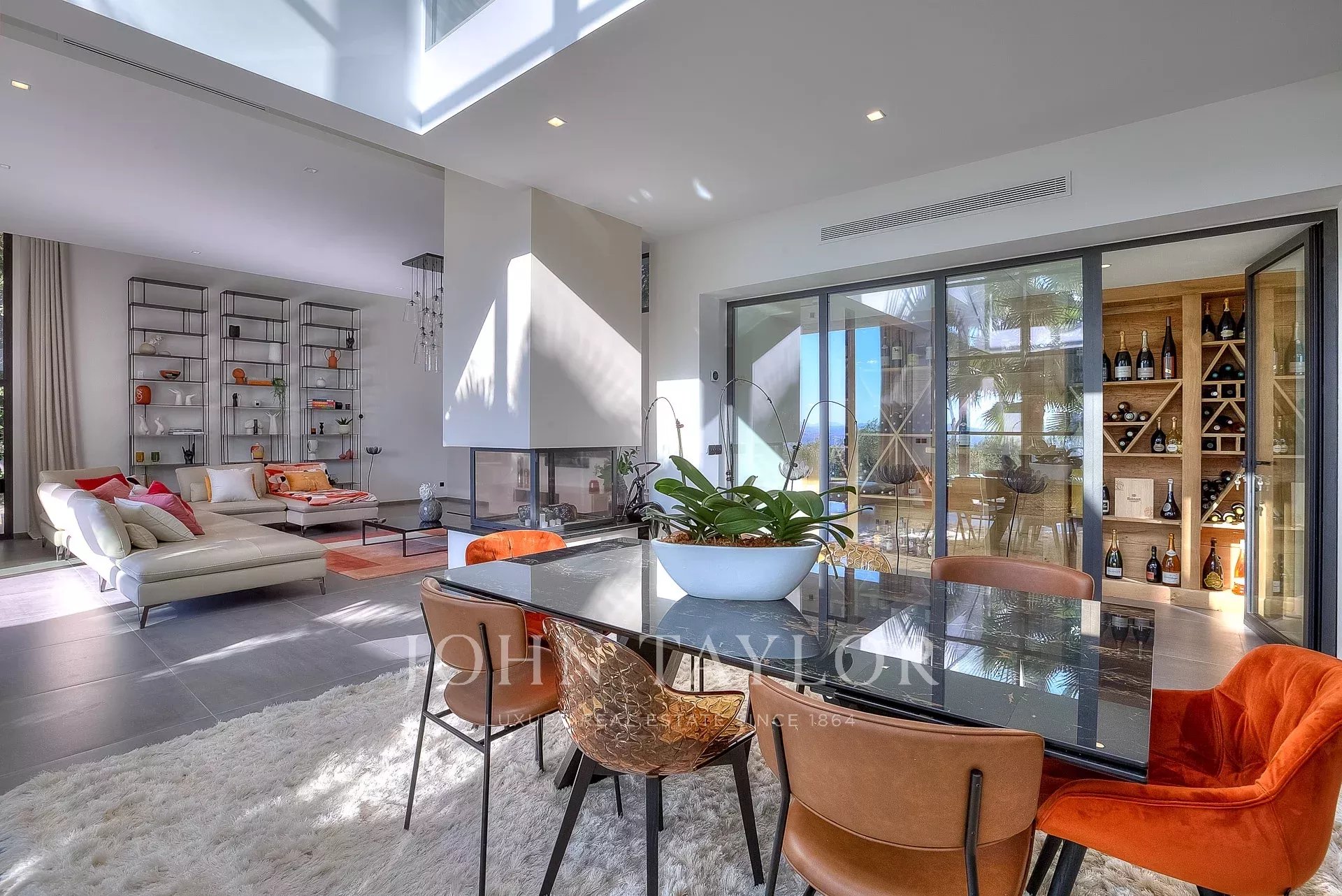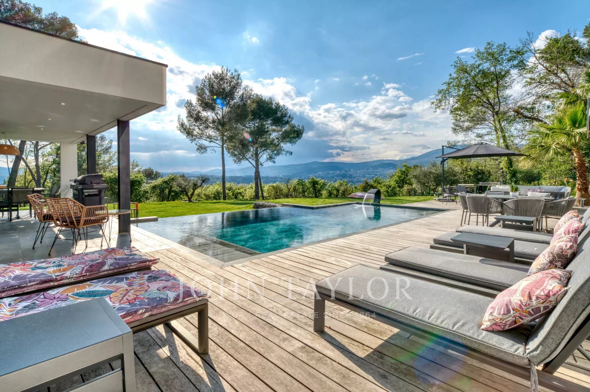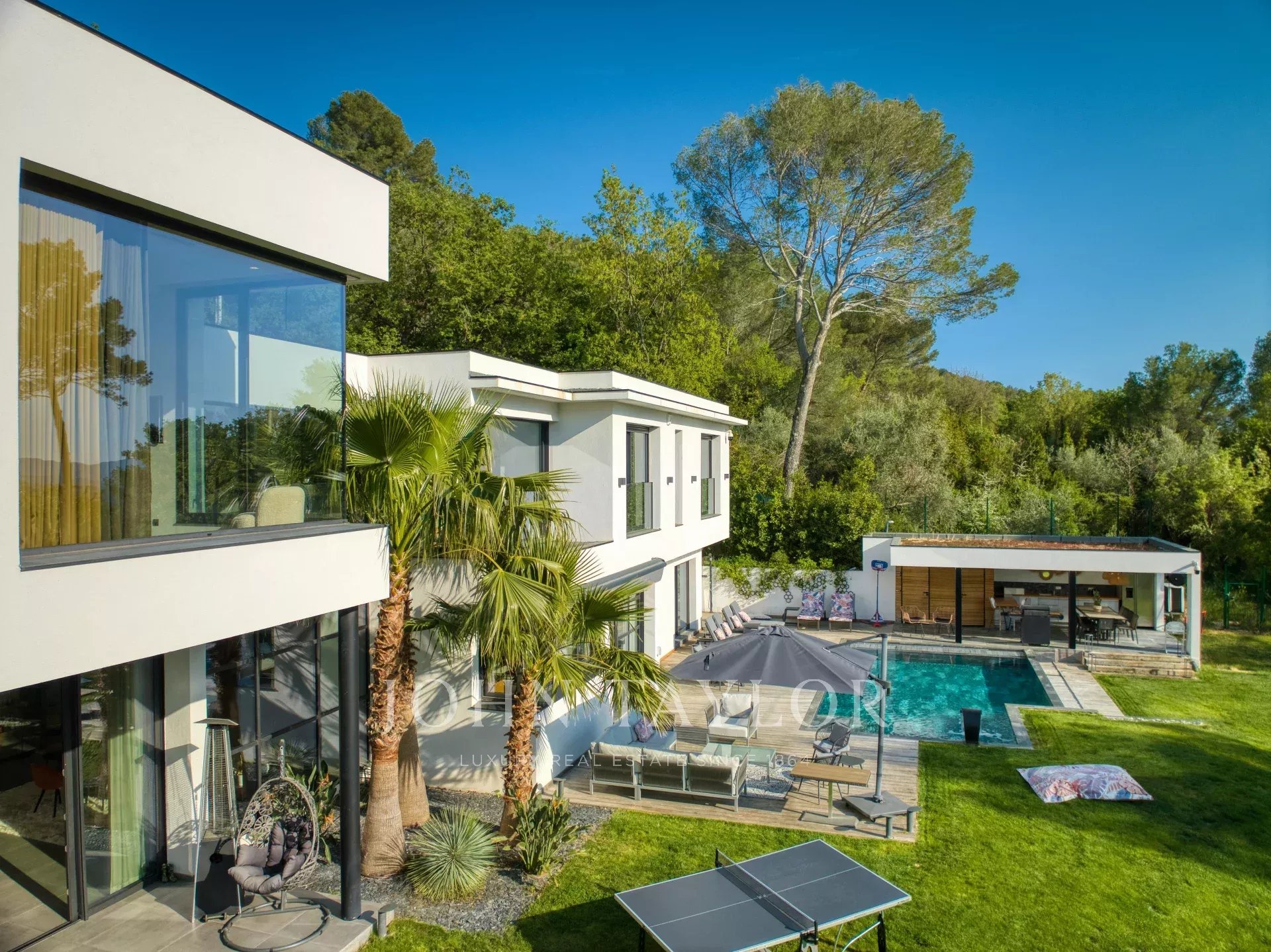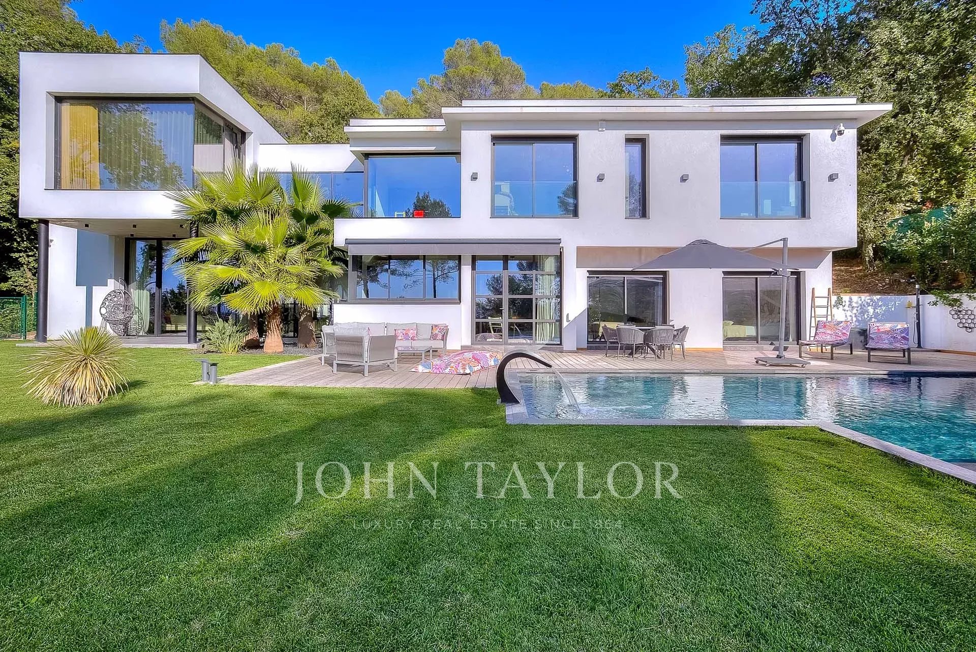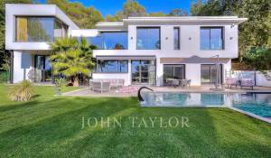 Cette très belle villa contemporaine de 430 m² proche Mougins et Valbonne, dispose d'une luminosité exceptionnelle grâce à ses énormes baies vitrées ainsi qu'une vue panoramique à couper le souffle.