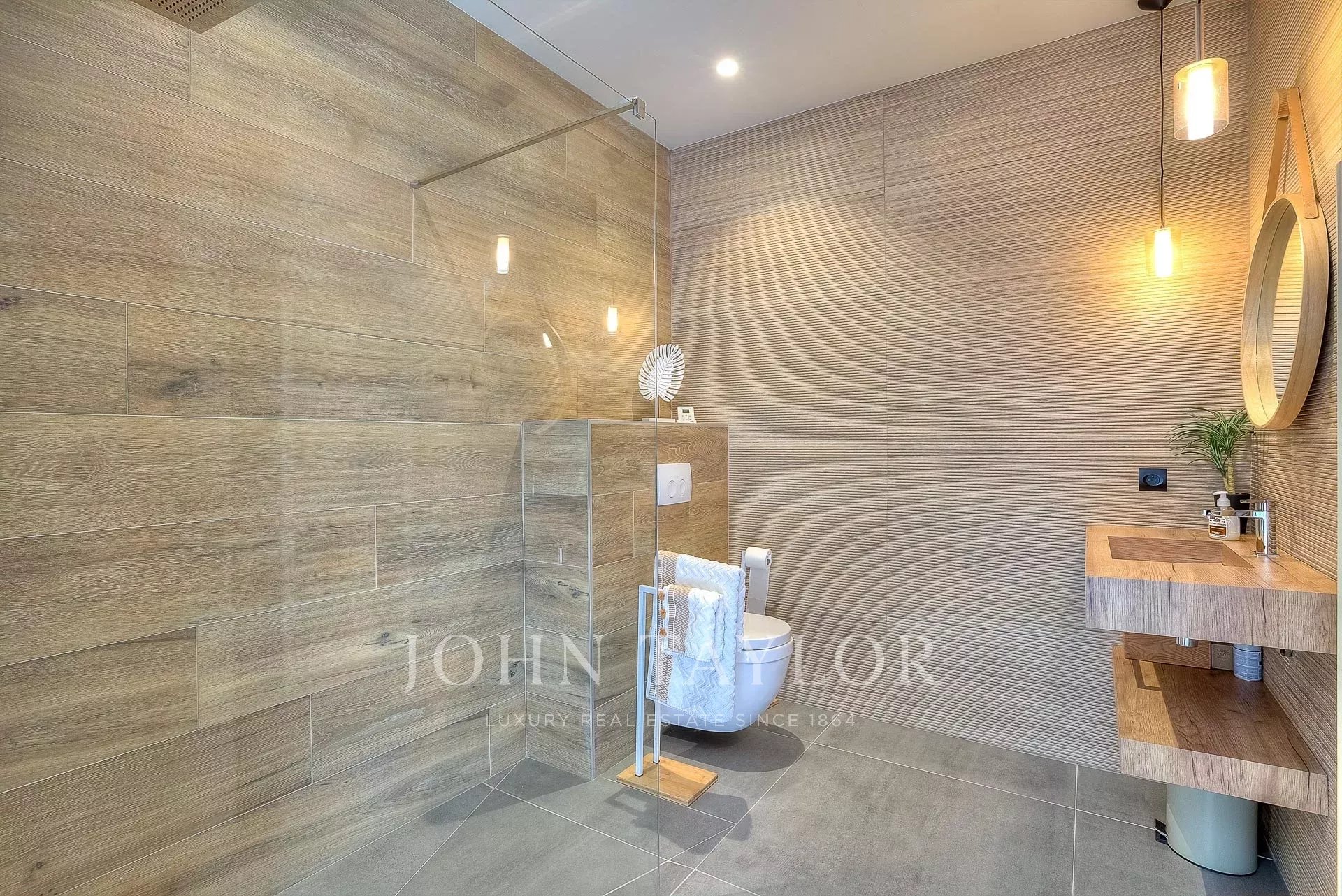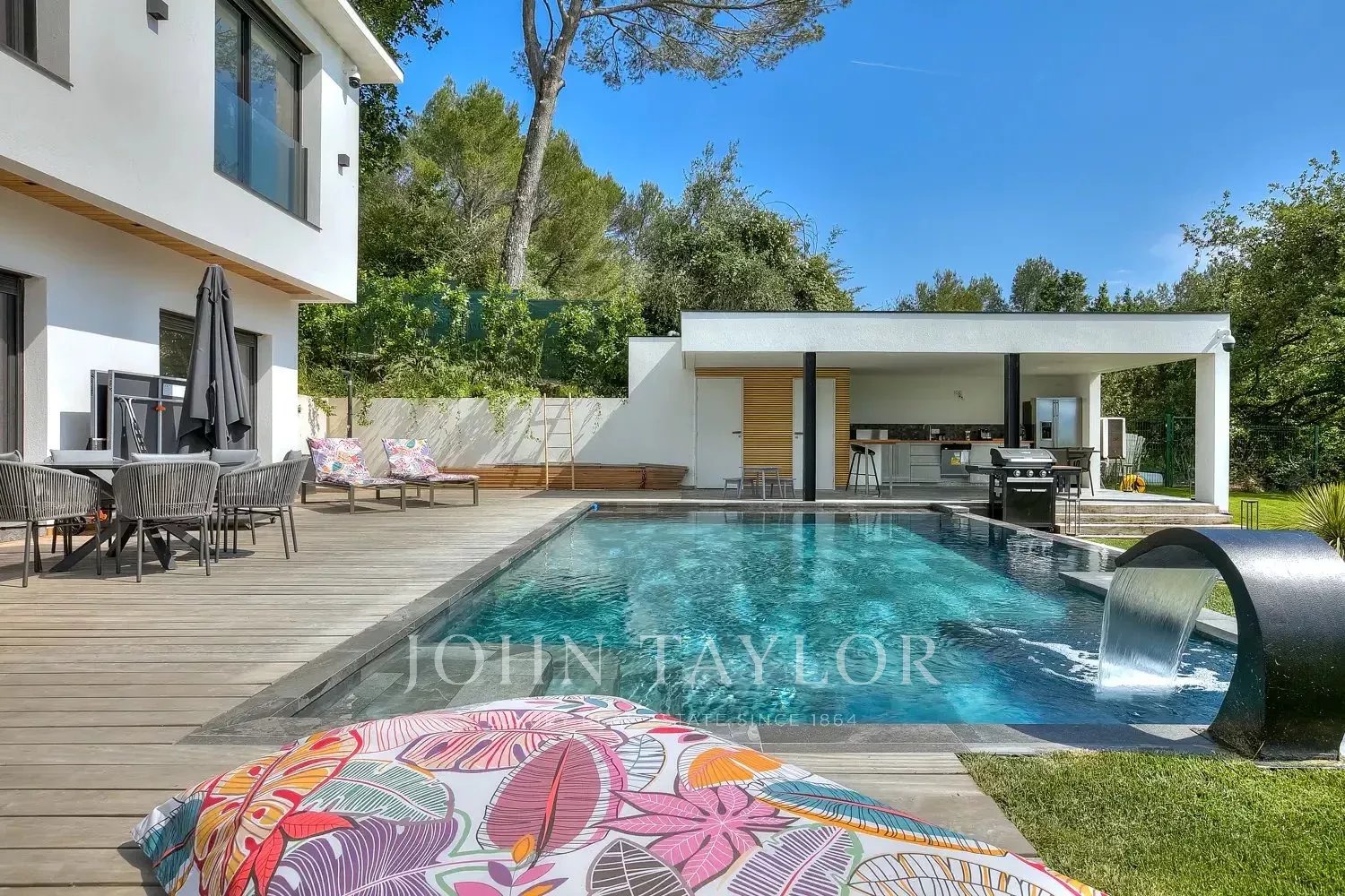 Jardin paysagé, 4 places de parking, piscine à débordement pouvant être chauffée (10x5 mètres), poolhouse avec une cuisine d'été, barbecue, douche, jacuzzi (6 places).