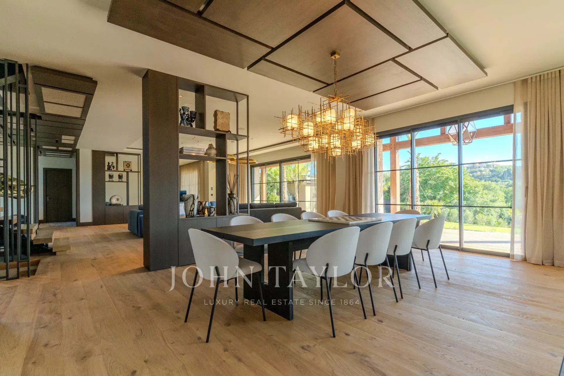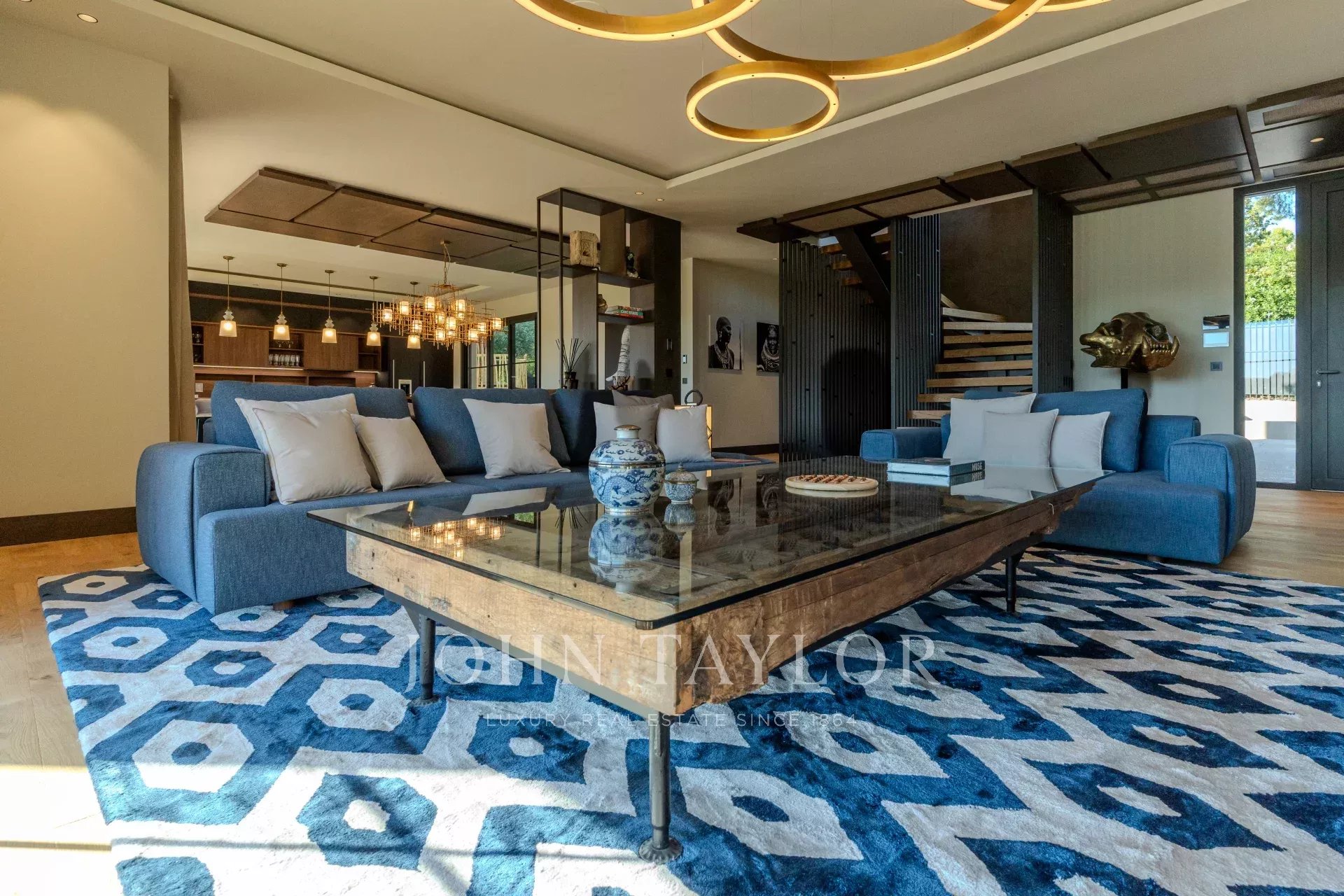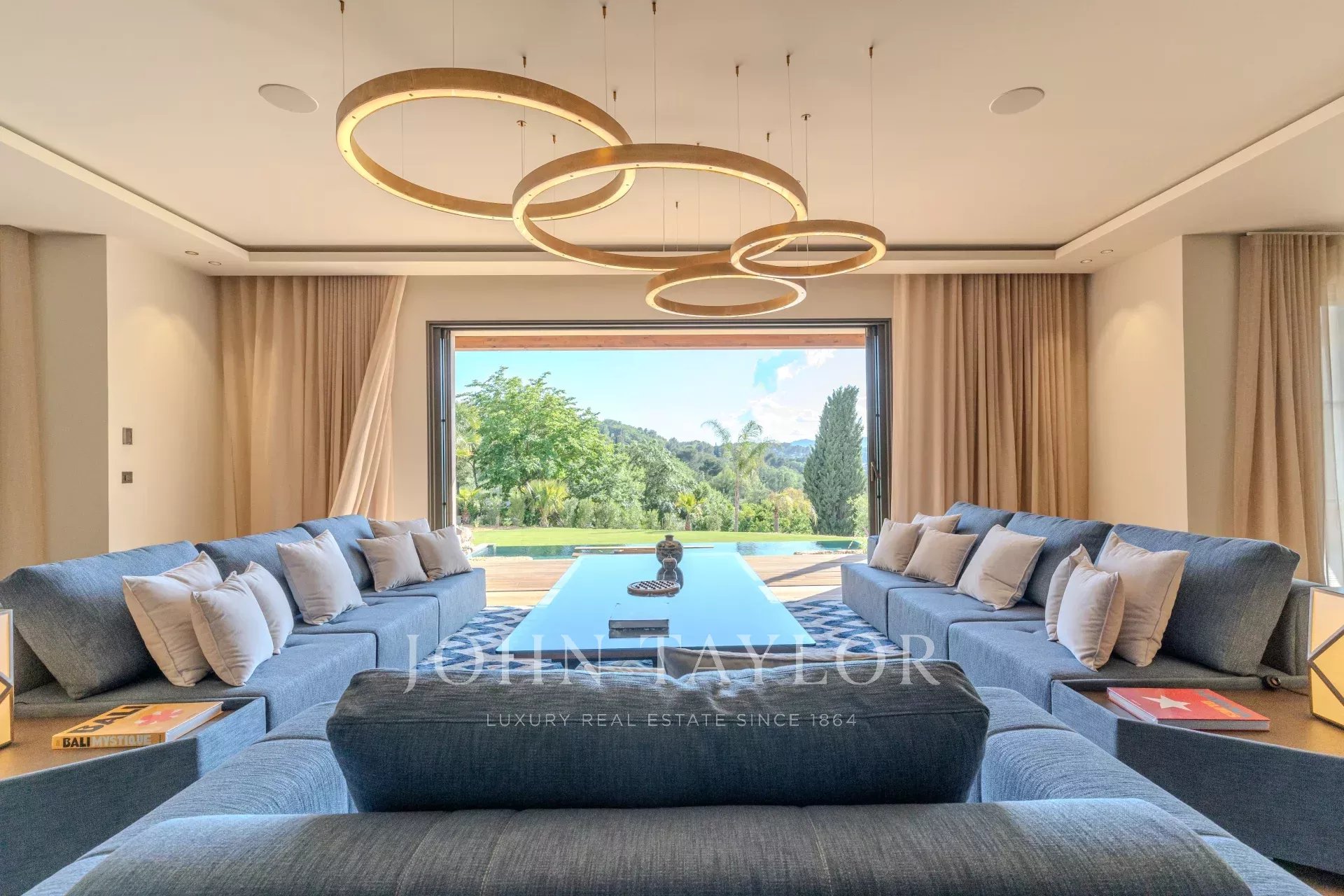 Vaste séjour / salle de réception magnifiquement conçu qui se connecte harmonieusement à la terrasse en teck et à la piscine. Cet espace est parfait pour recevoir ou se détendre en famille et entre amis.