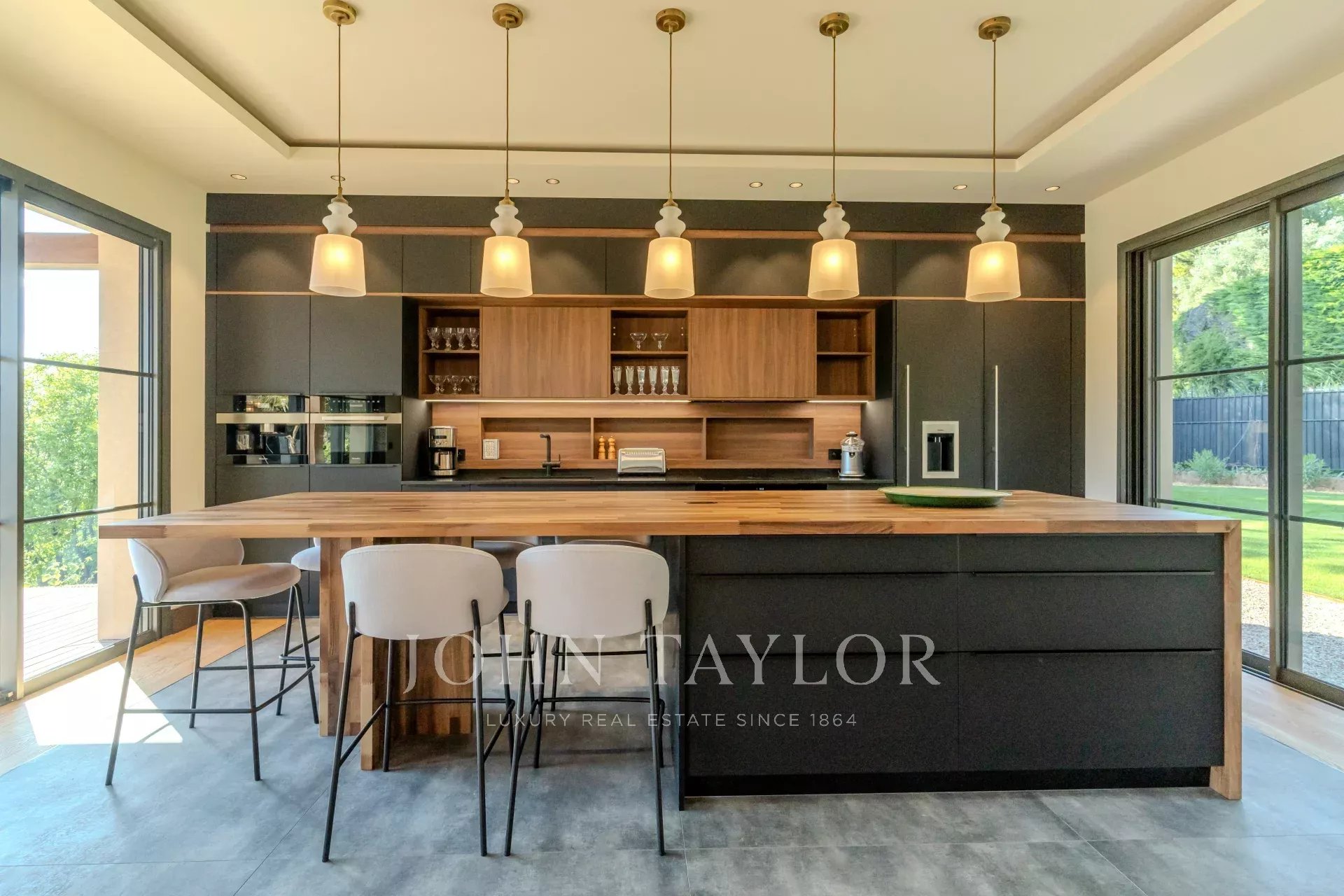 Cuisine américaine high tech entièrement équipée avec un îlot central et un espace petit-déjeuner.