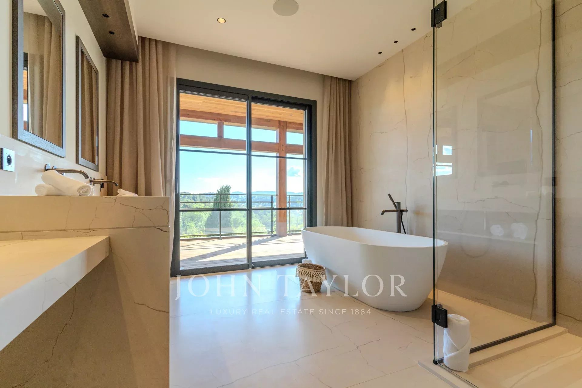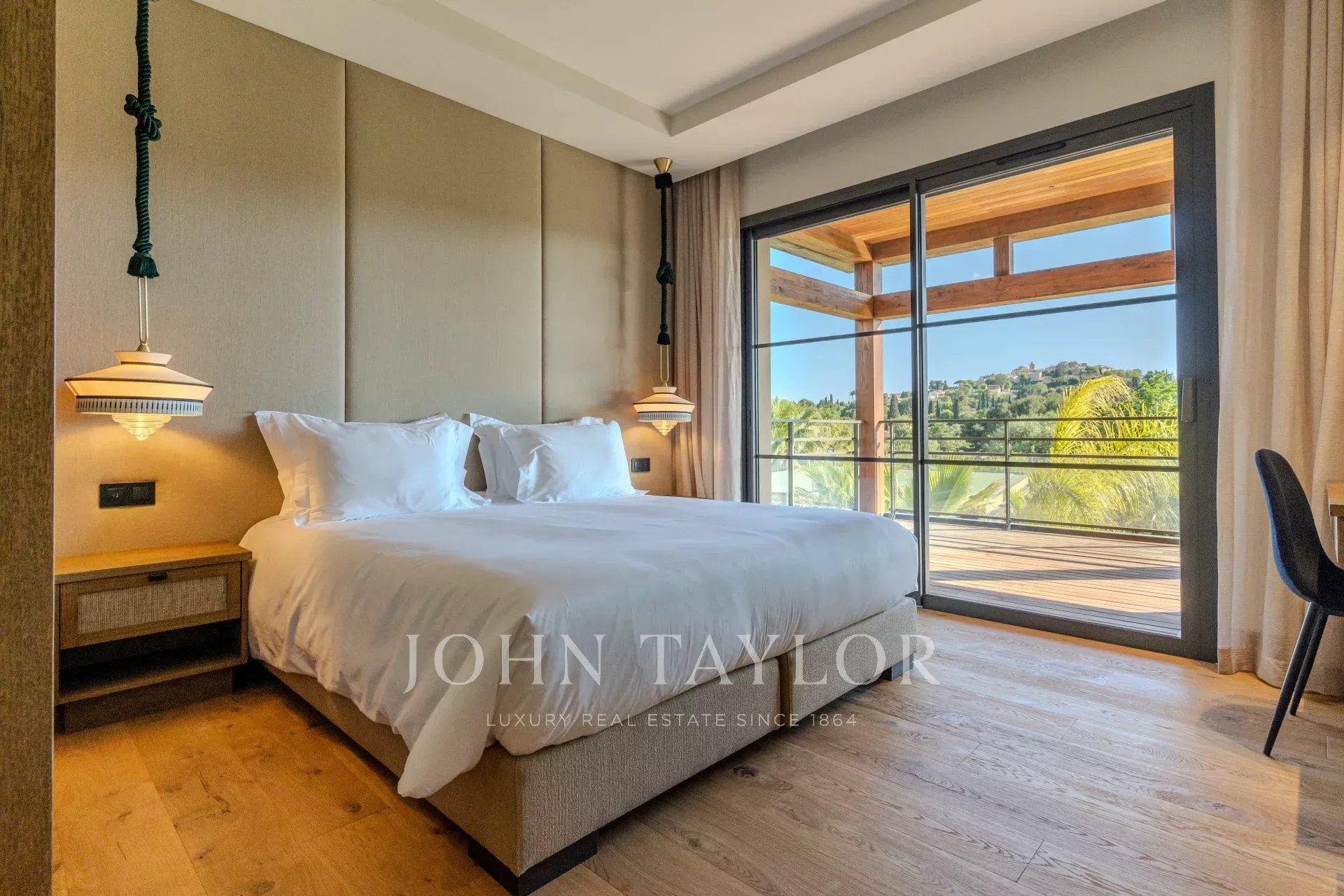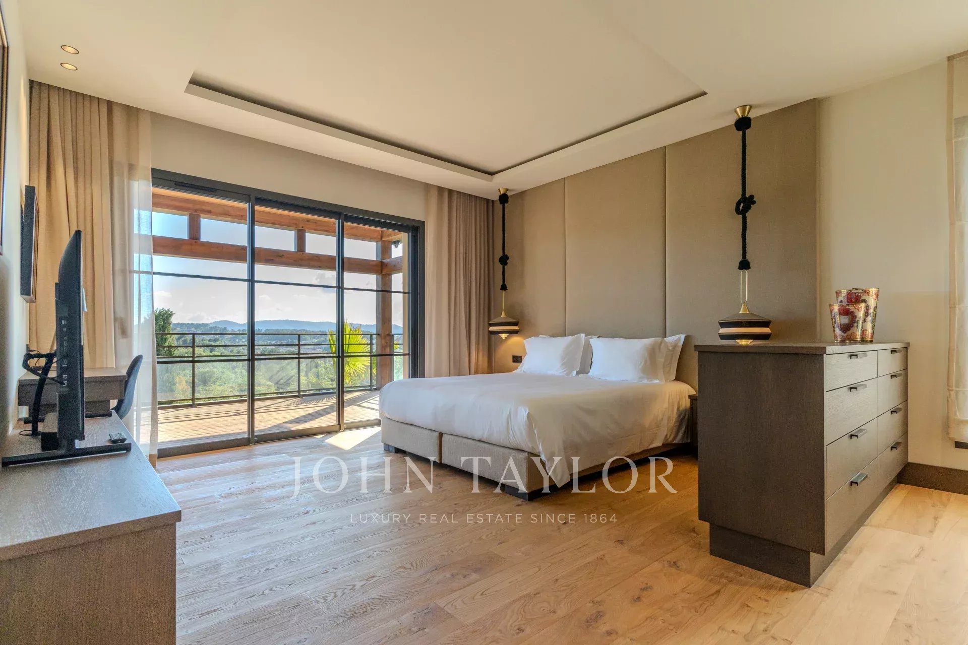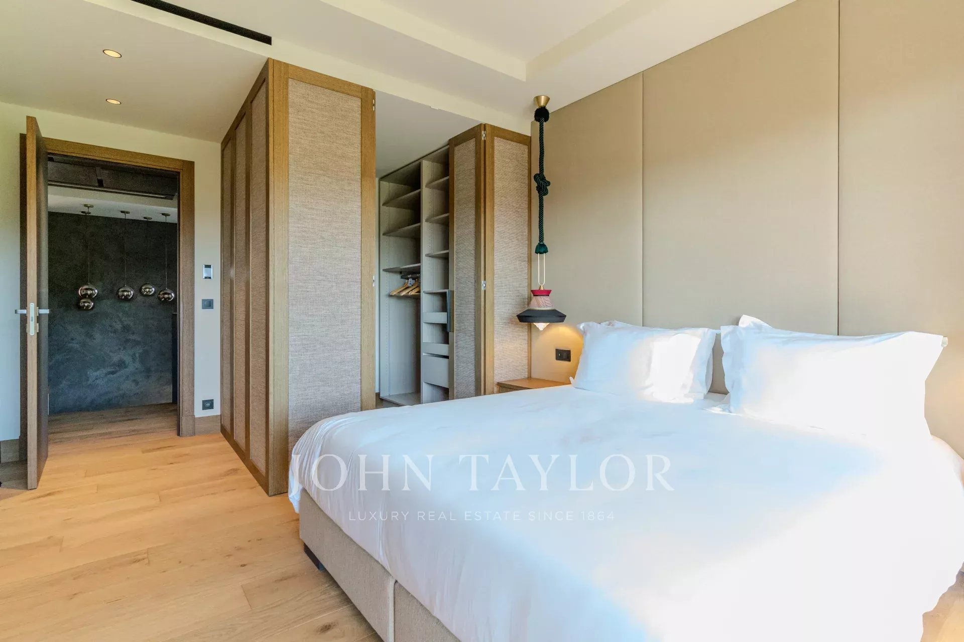 Luxueuse chambre de maître (n°1) : lit double (180x200), grand dressing offrant un très grand espace de rangement, téléviseur, salle de bains attenante (lavabo double vasque, baignoire, douche à l'italienne et toilettes indépendantes). Terrasse offrant une vue imprenable, parfaite pour savourer un instant café ou un moment détente en soirée.