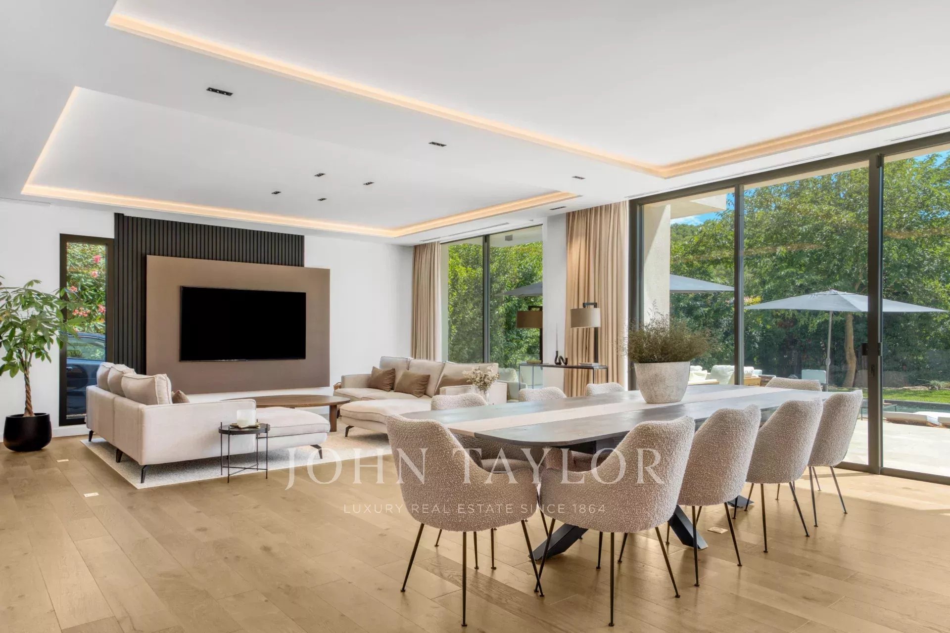 Spacieux salon et salle à manger ouverts sur l'extérieur