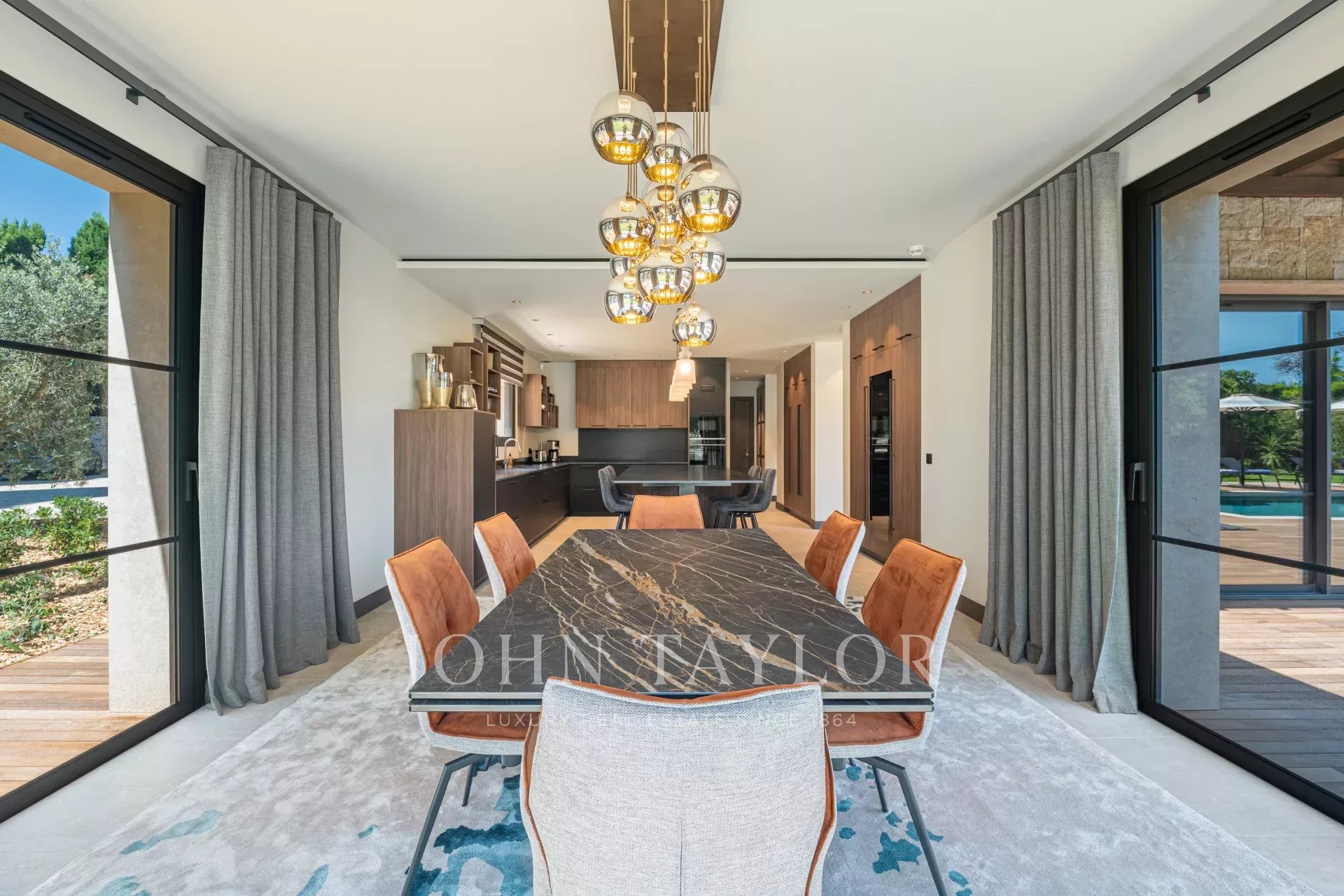 Salle à manger conviviale ouvrant sur la piscine