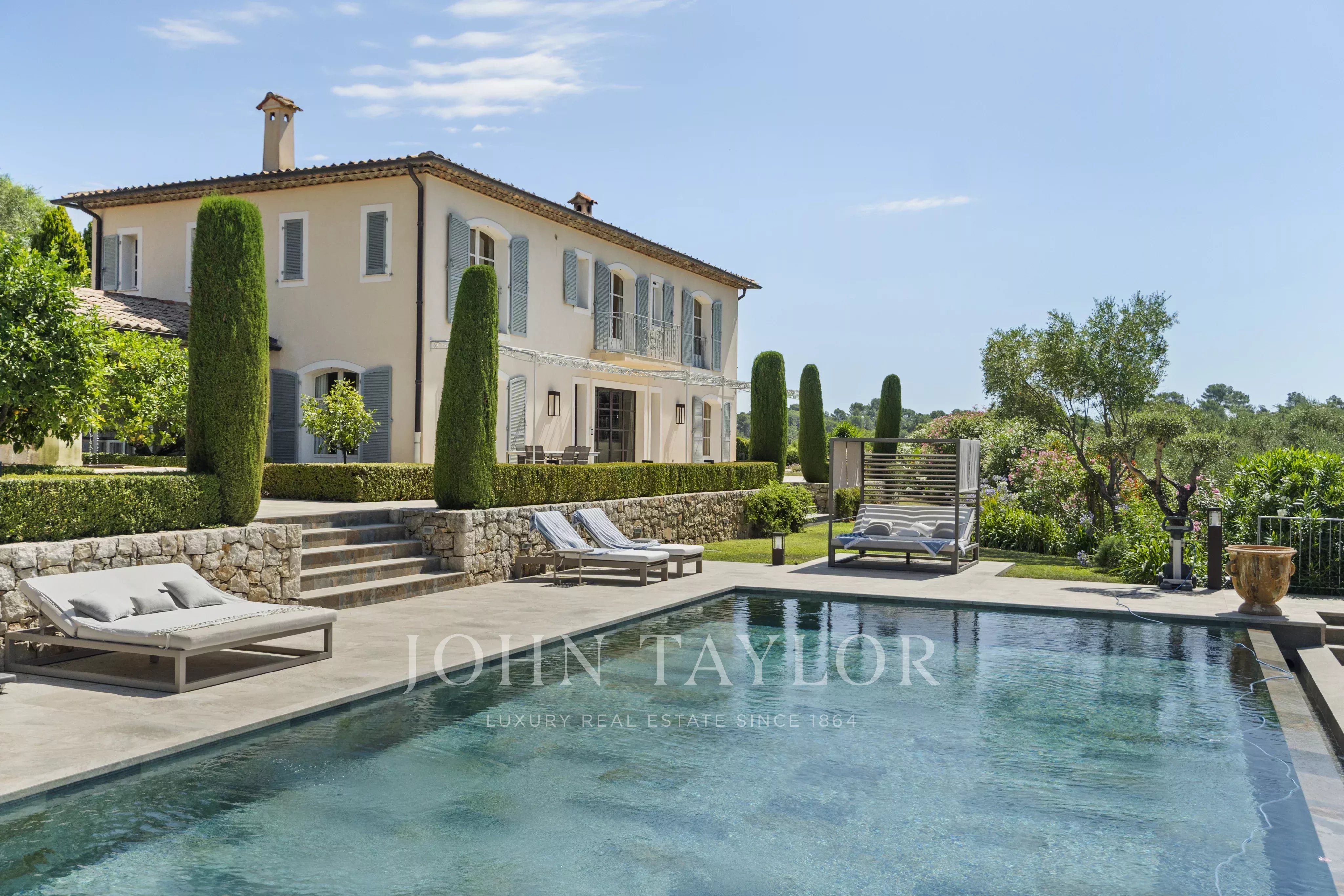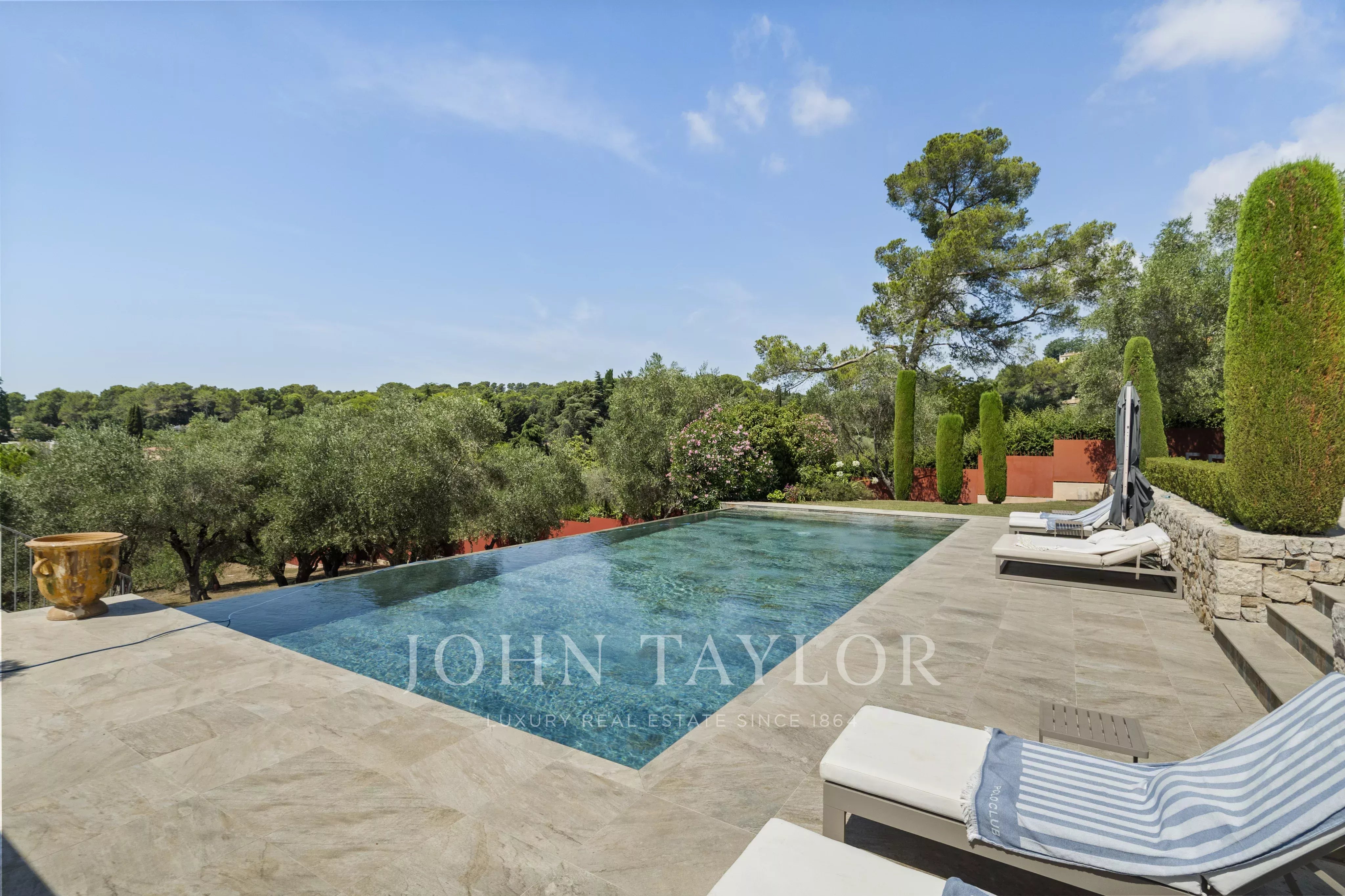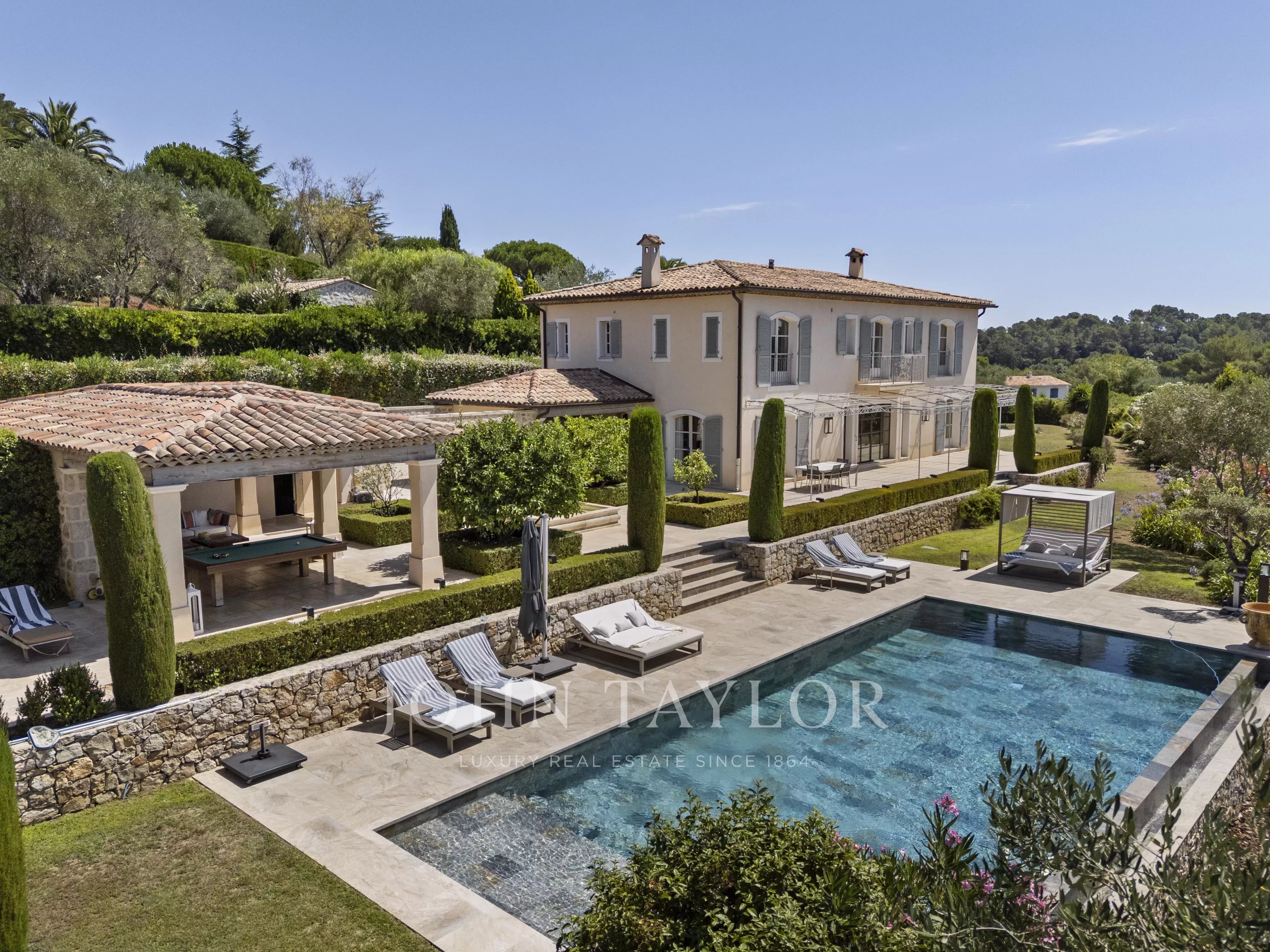 Offrez-vous un séjour d’exception sur la Côte d’Azur dans cette élégante bastide nichée au cœur d’un petit domaine résidentiel, entre Mougins et Valbonne.