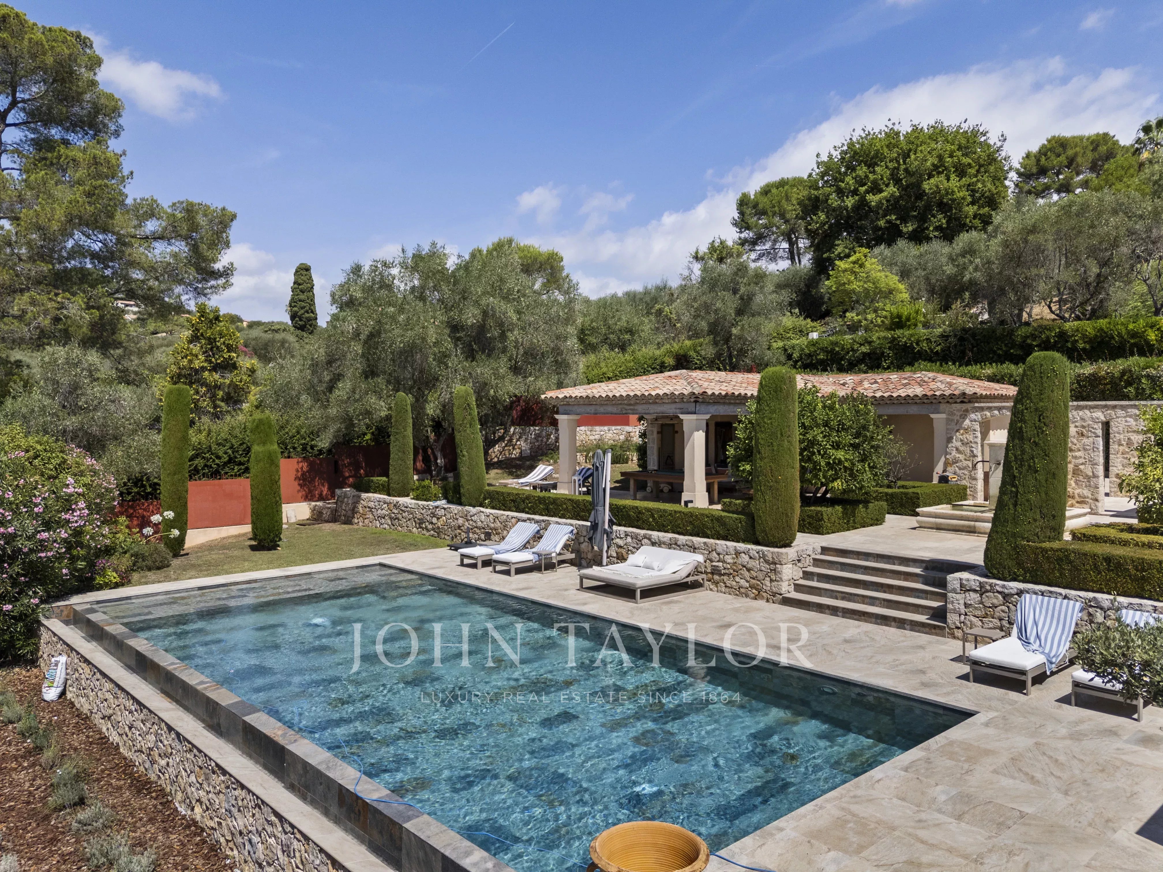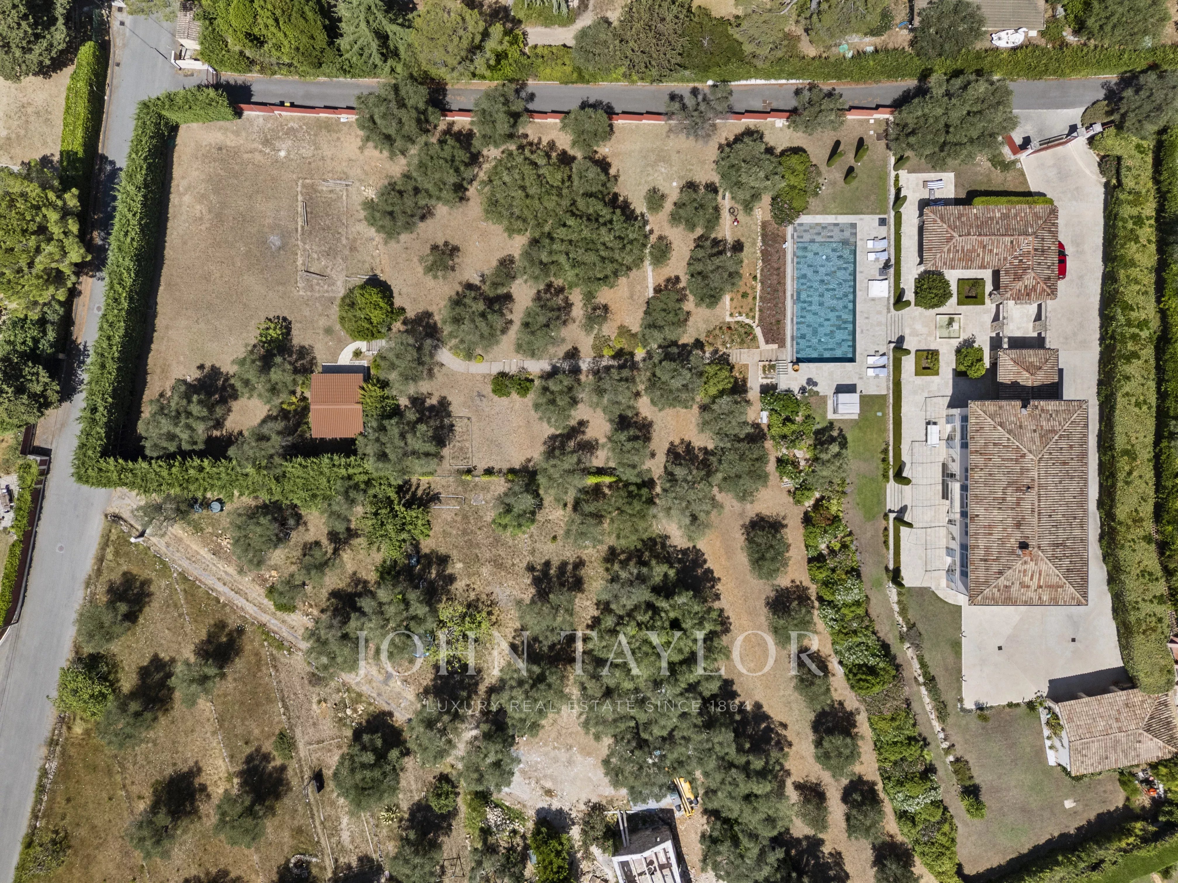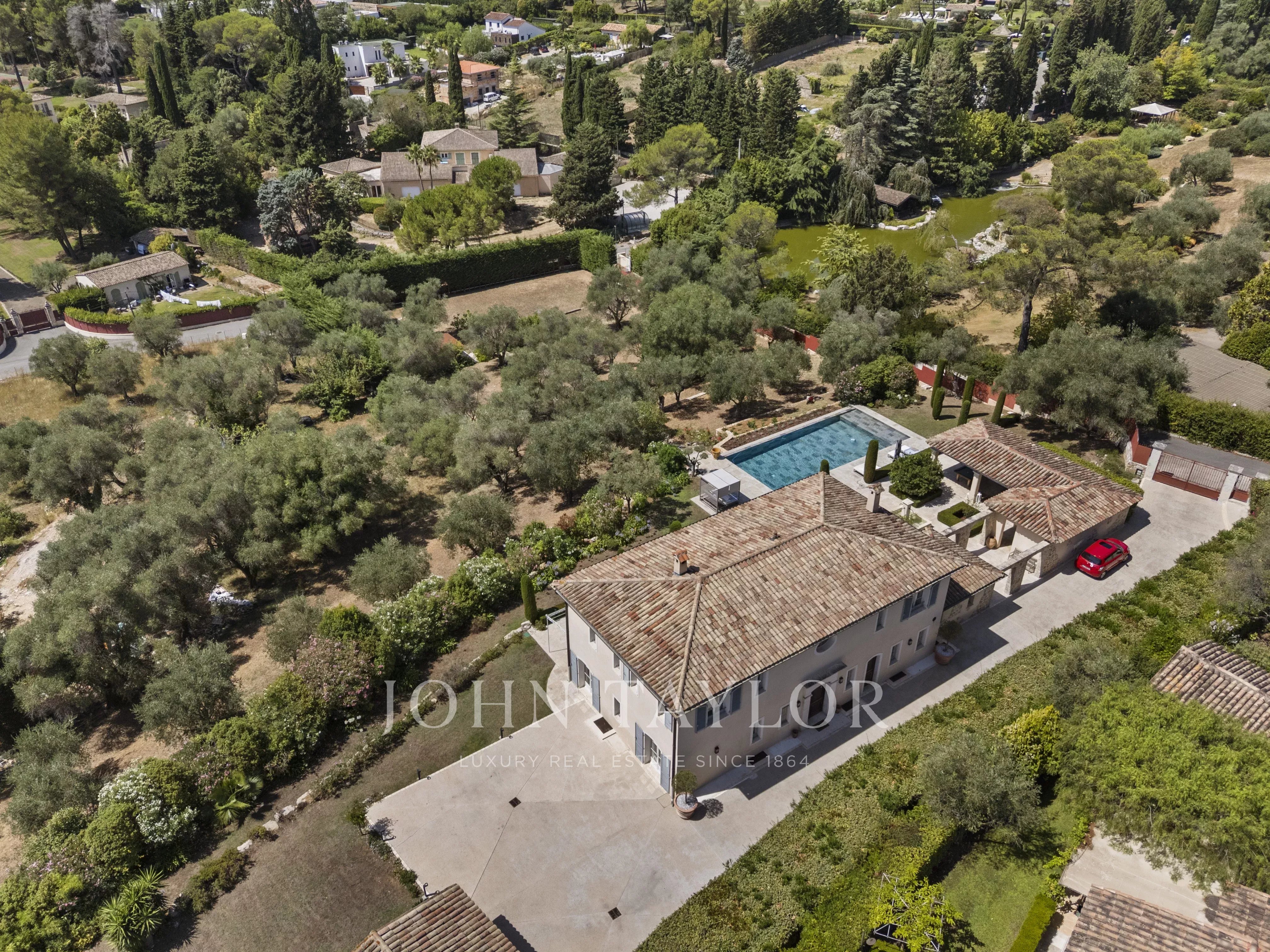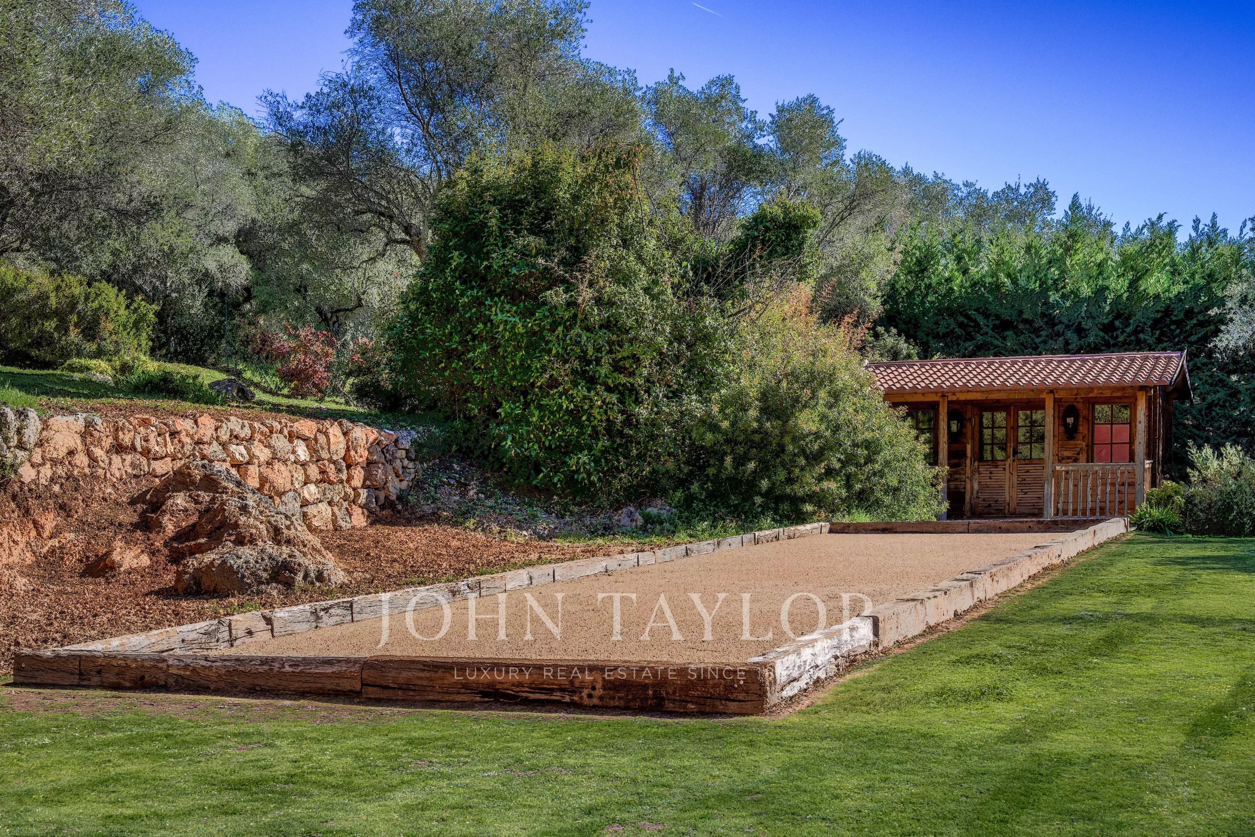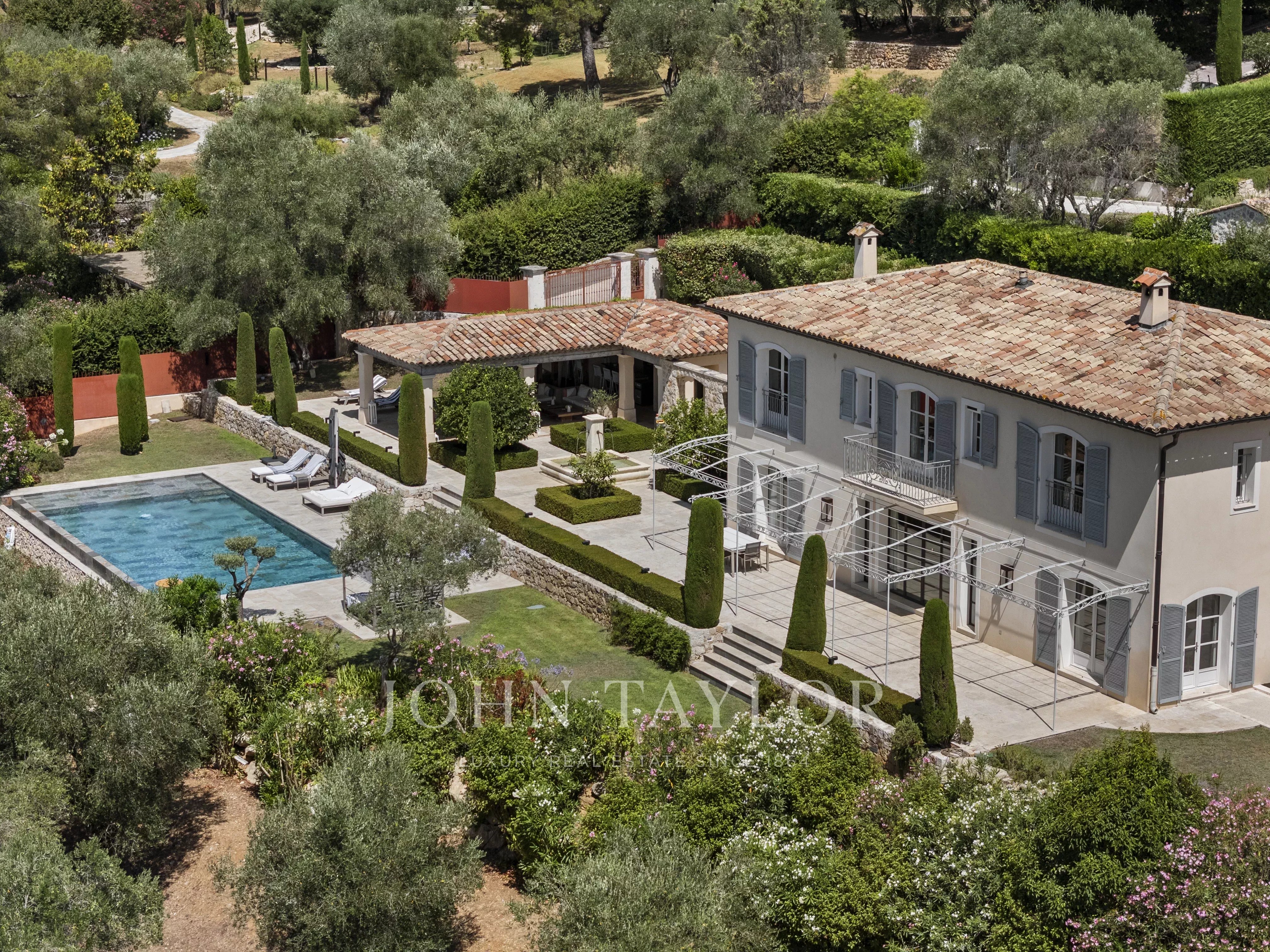 Le terrain paysager d’environ 6 100 m² offre un cadre de vie unique : un jardin à la française, une oliveraie, des arbres fruitiers et un potager.