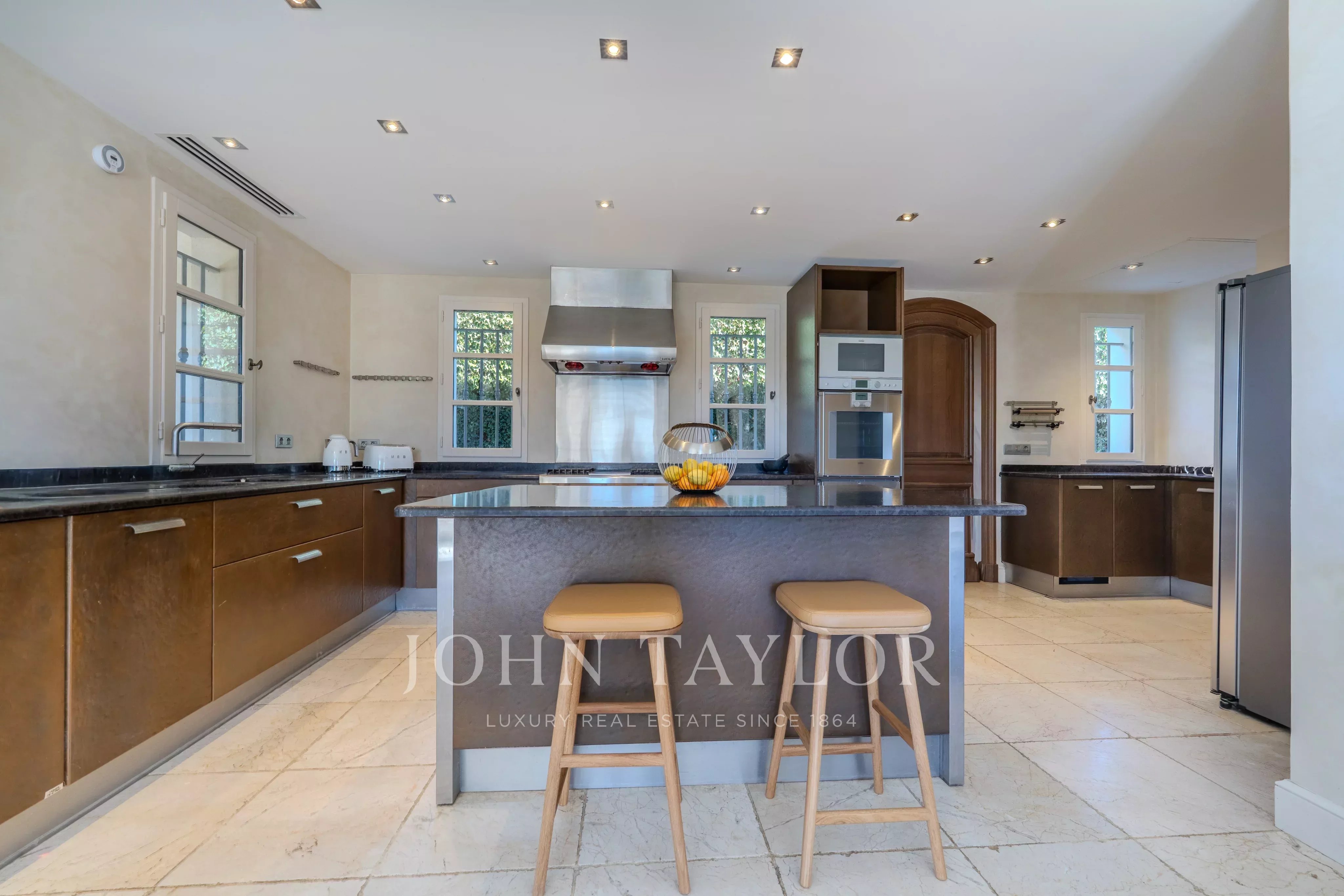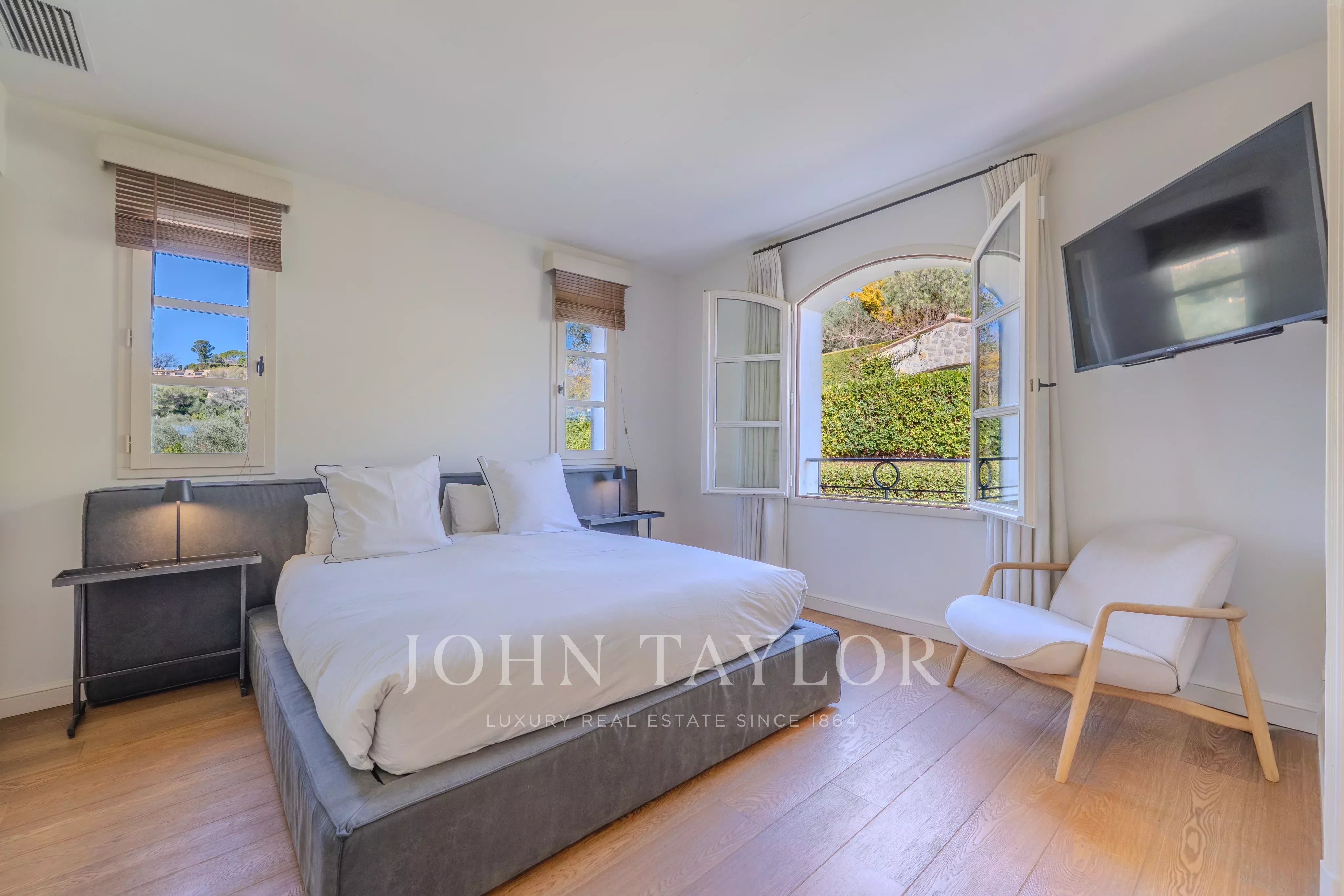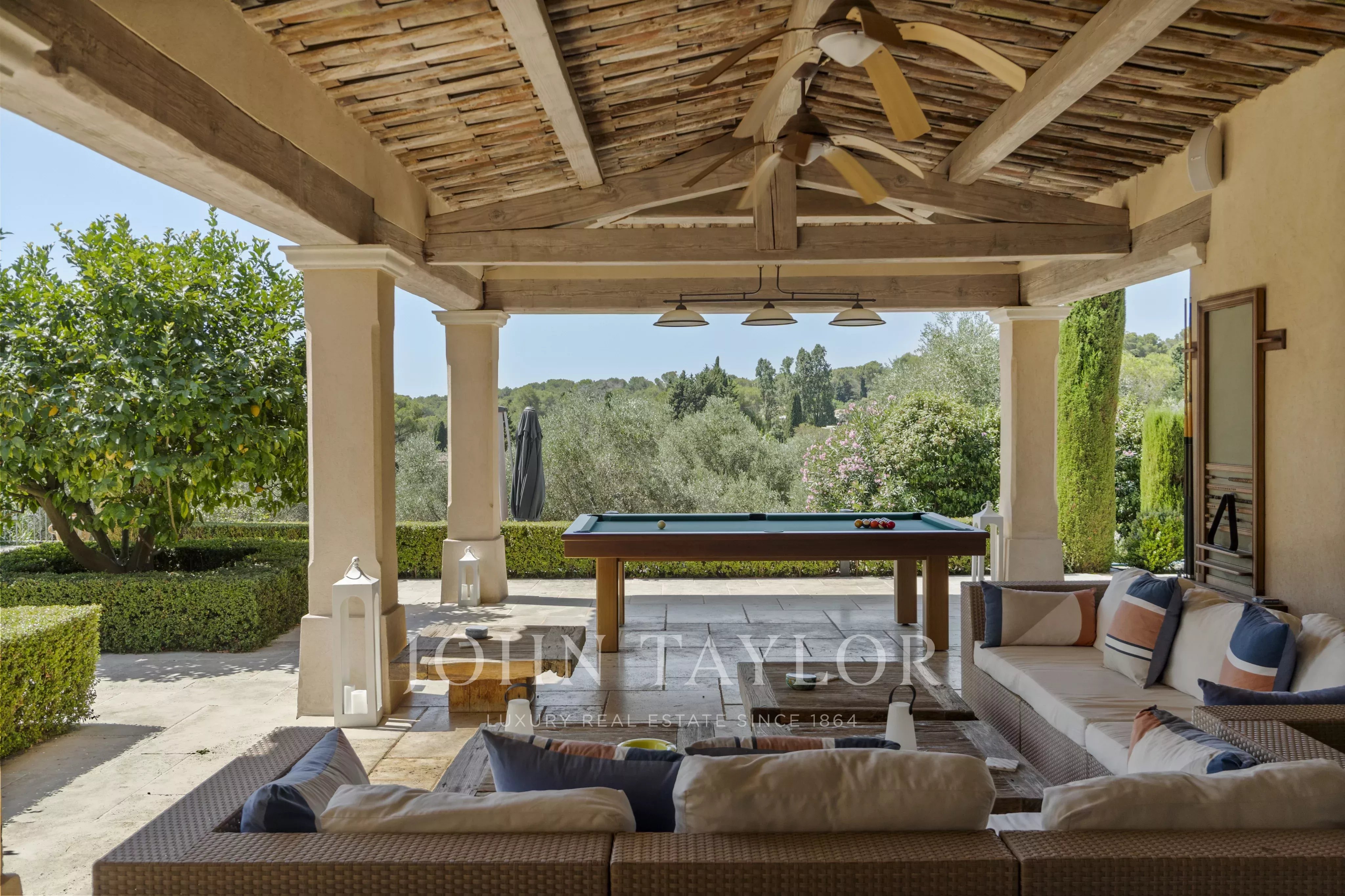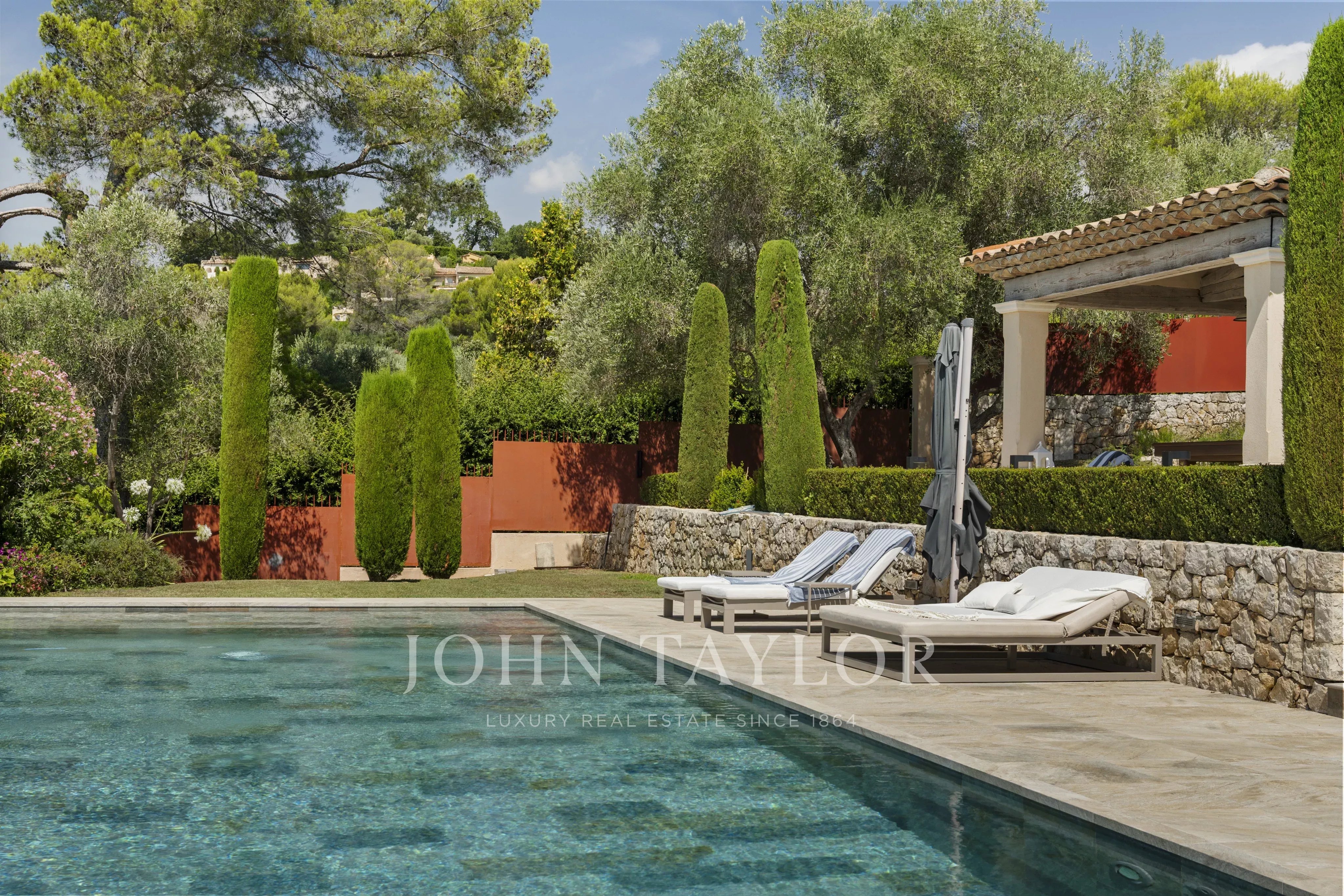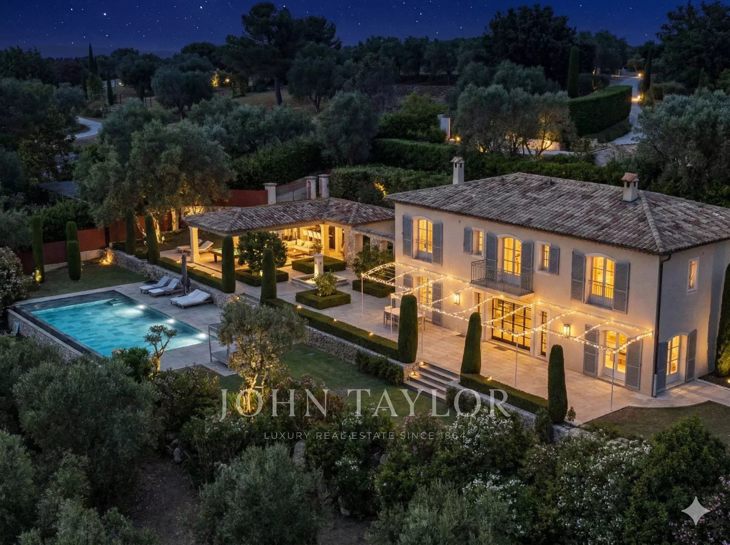 Le terrain paysager d’environ 6 100 m² offre un cadre de vie unique : un jardin à la française, une oliveraie, des arbres fruitiers et un potager.