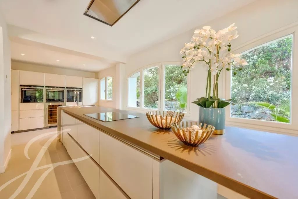 La villa présente une belle entrée avec bassin d'agrément, un majestueux et lumineux salon cathédrale avec cheminée, une vaste cuisine ouverte avec salle à manger, office.