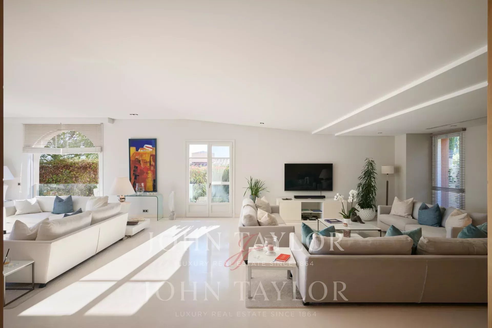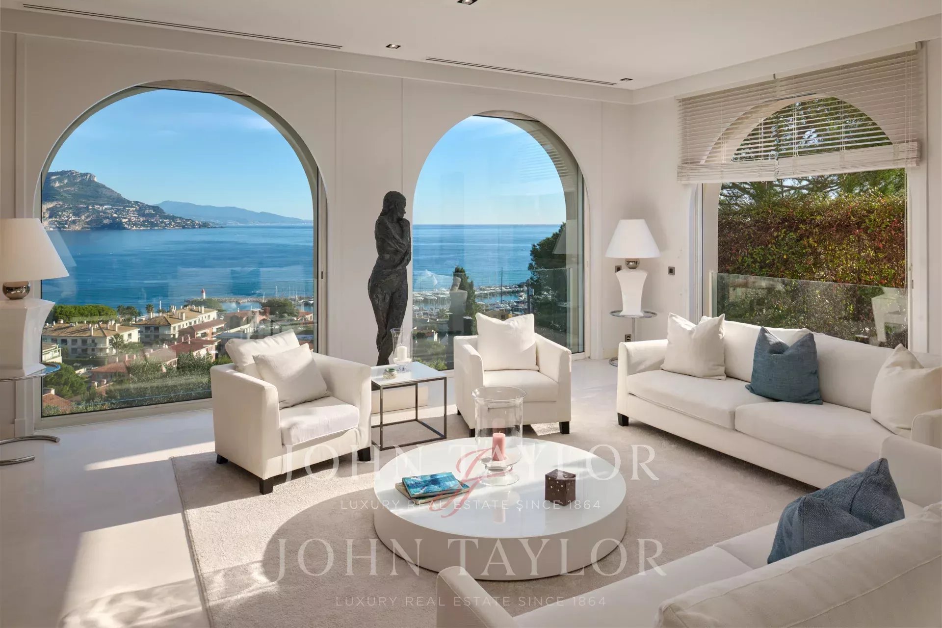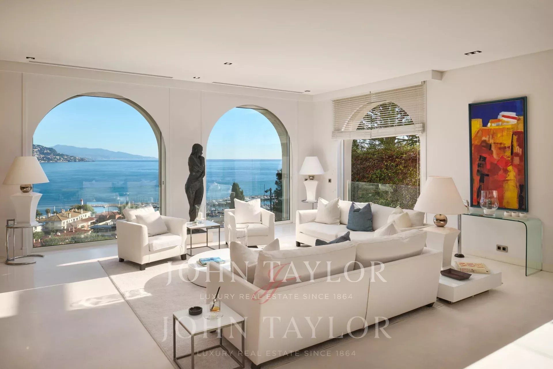 Très lumineux double séjour donnant sur le port de Saint Jean Cap Ferrat avec coin télévision.