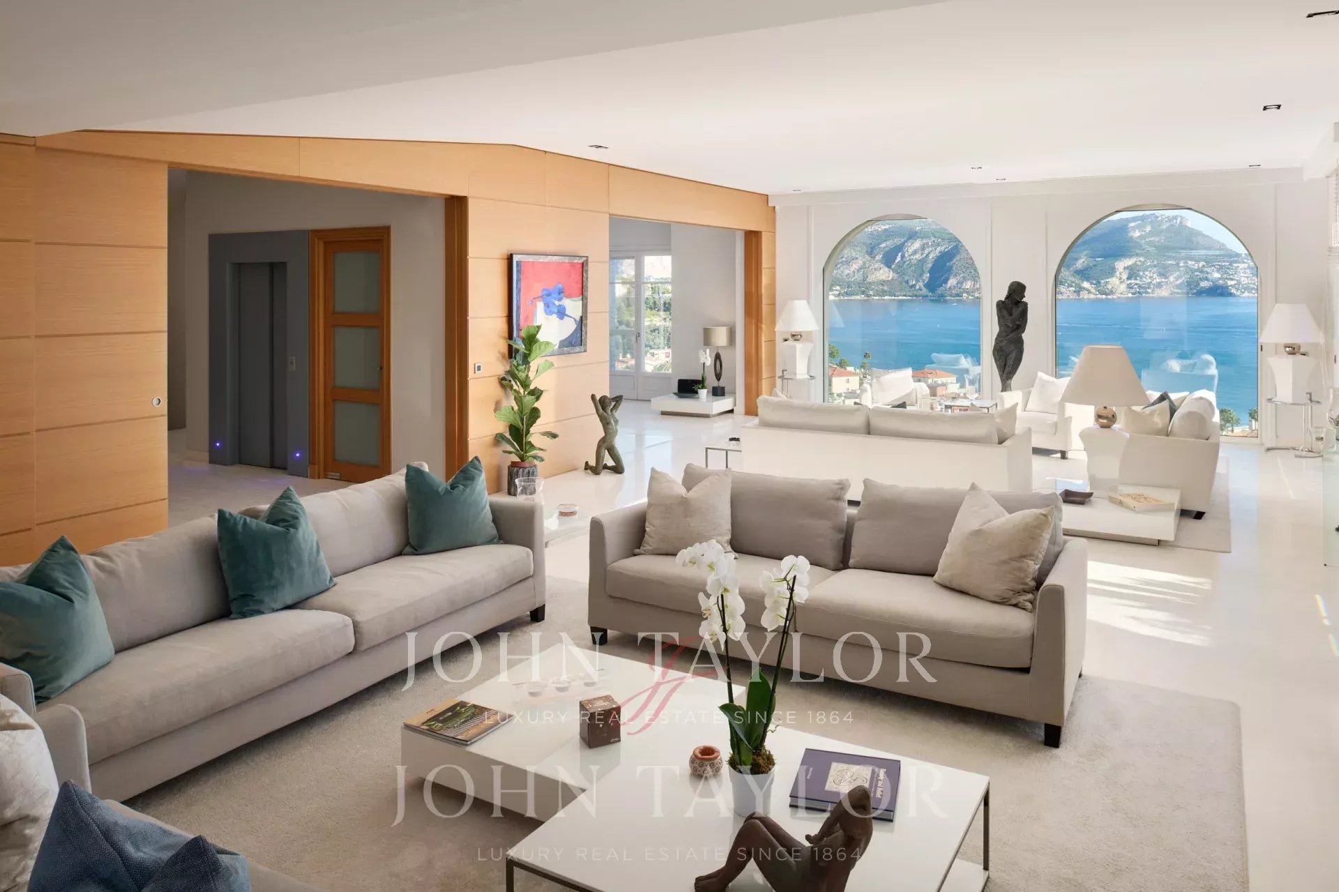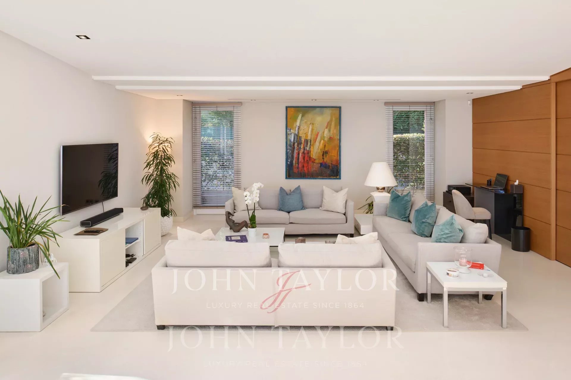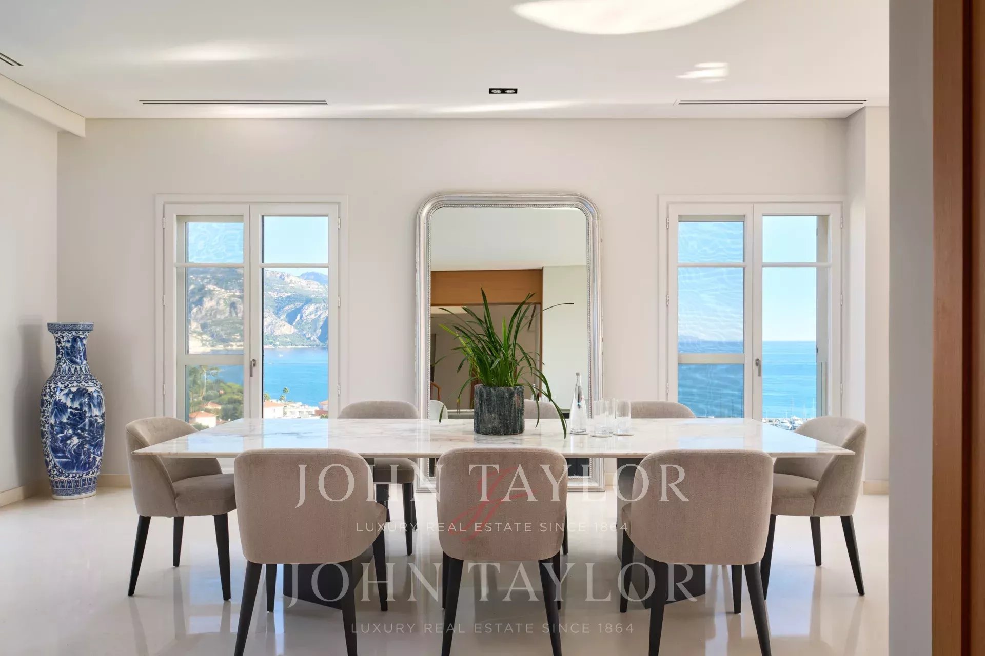 Très lumineux double séjour donnant sur le port de Saint Jean Cap Ferrat avec coin télévision.