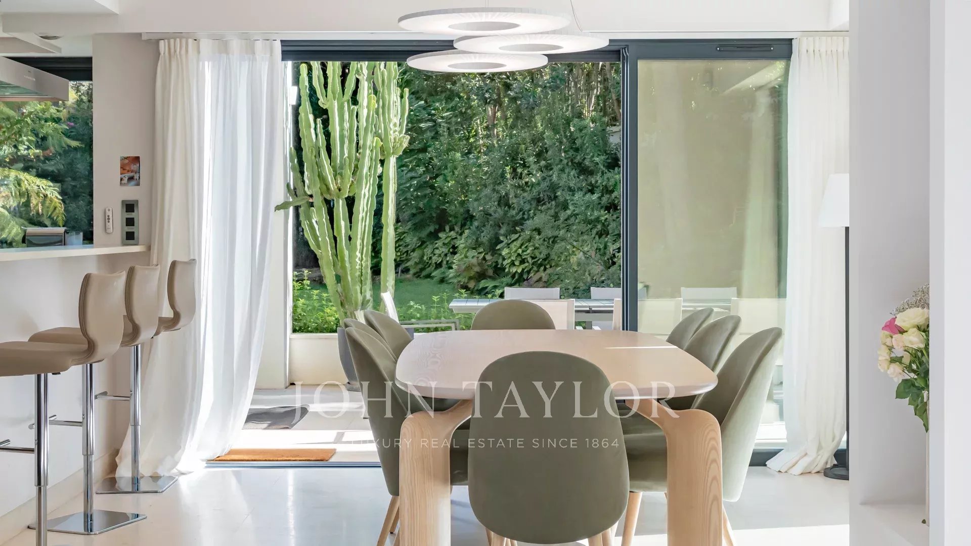 Le rez-de-chaussée accueille un lumineux séjour avec salle à manger ainsi qu’une cuisine américaine entièrement équipée, ouvrant sur la piscine, les terrasses et le jardin plat, parfaitement aménagé pour des moments de détente en extérieur.
