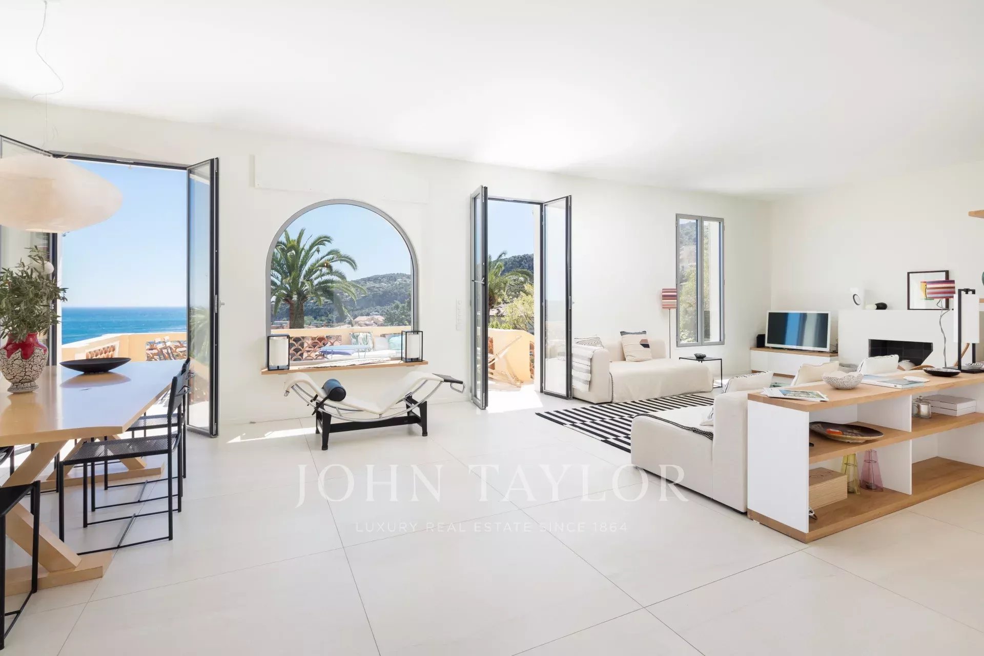 Salon avec TV / salle à manger ouvrant sur une grande terrasse avec vue mer