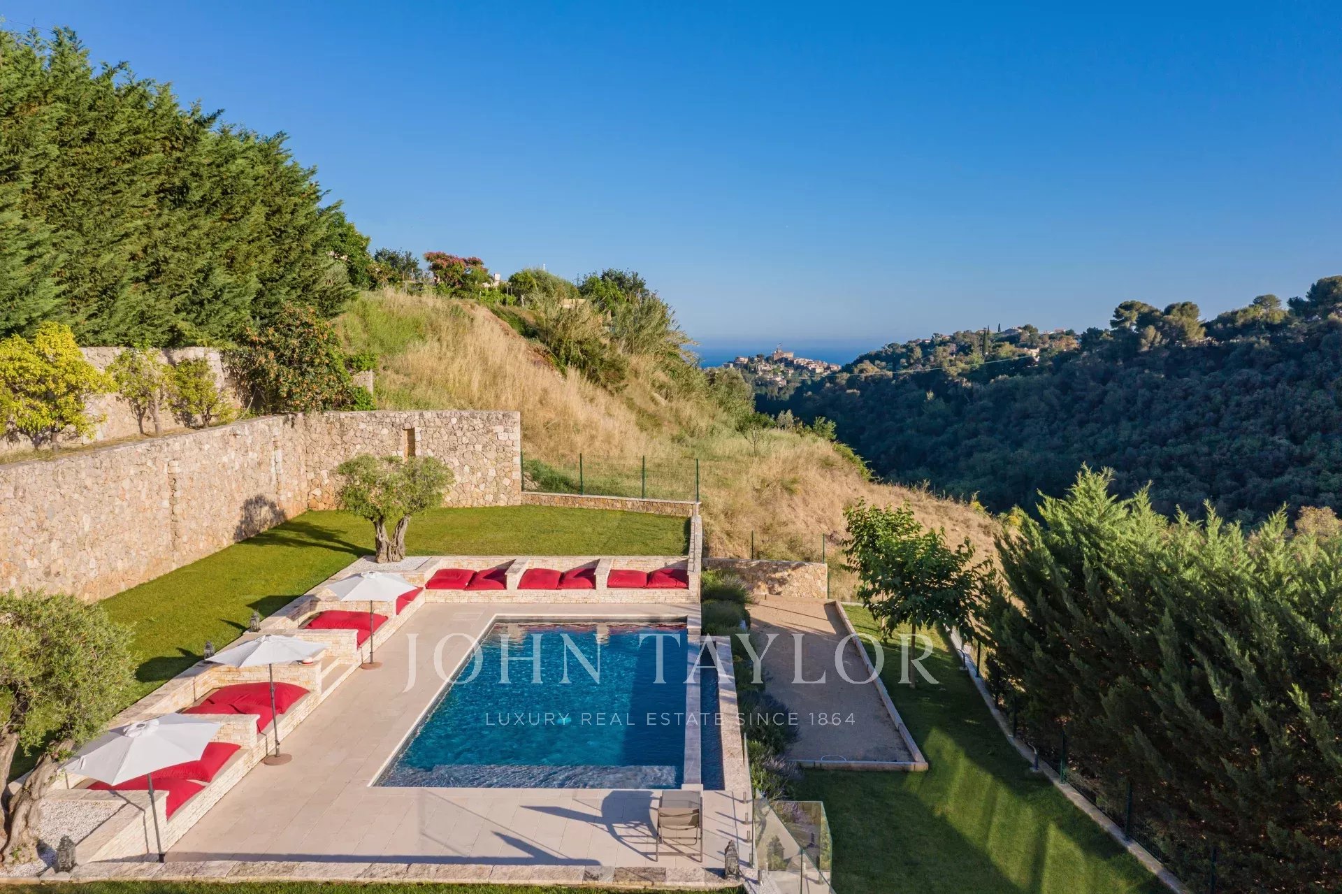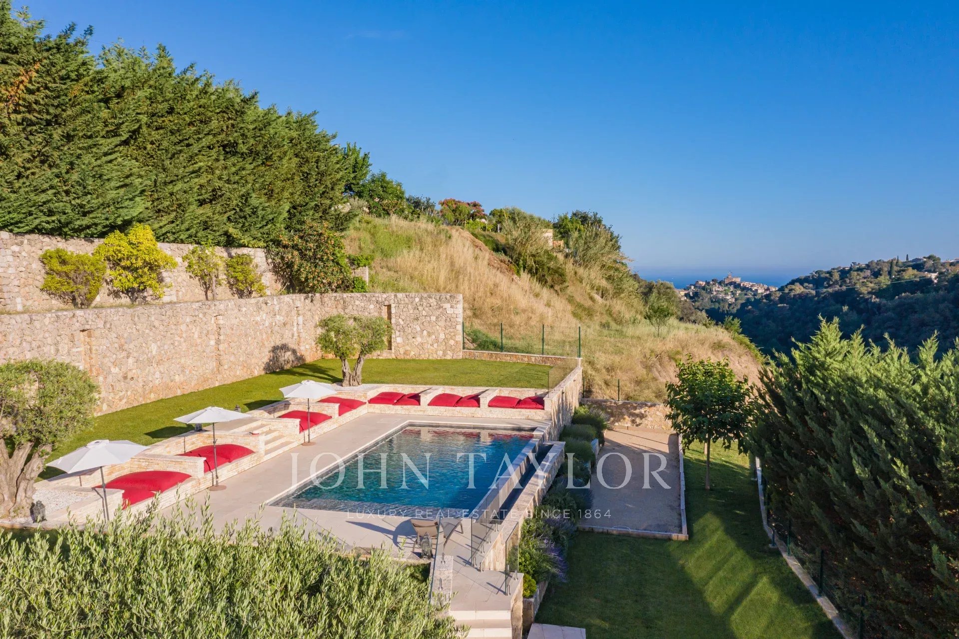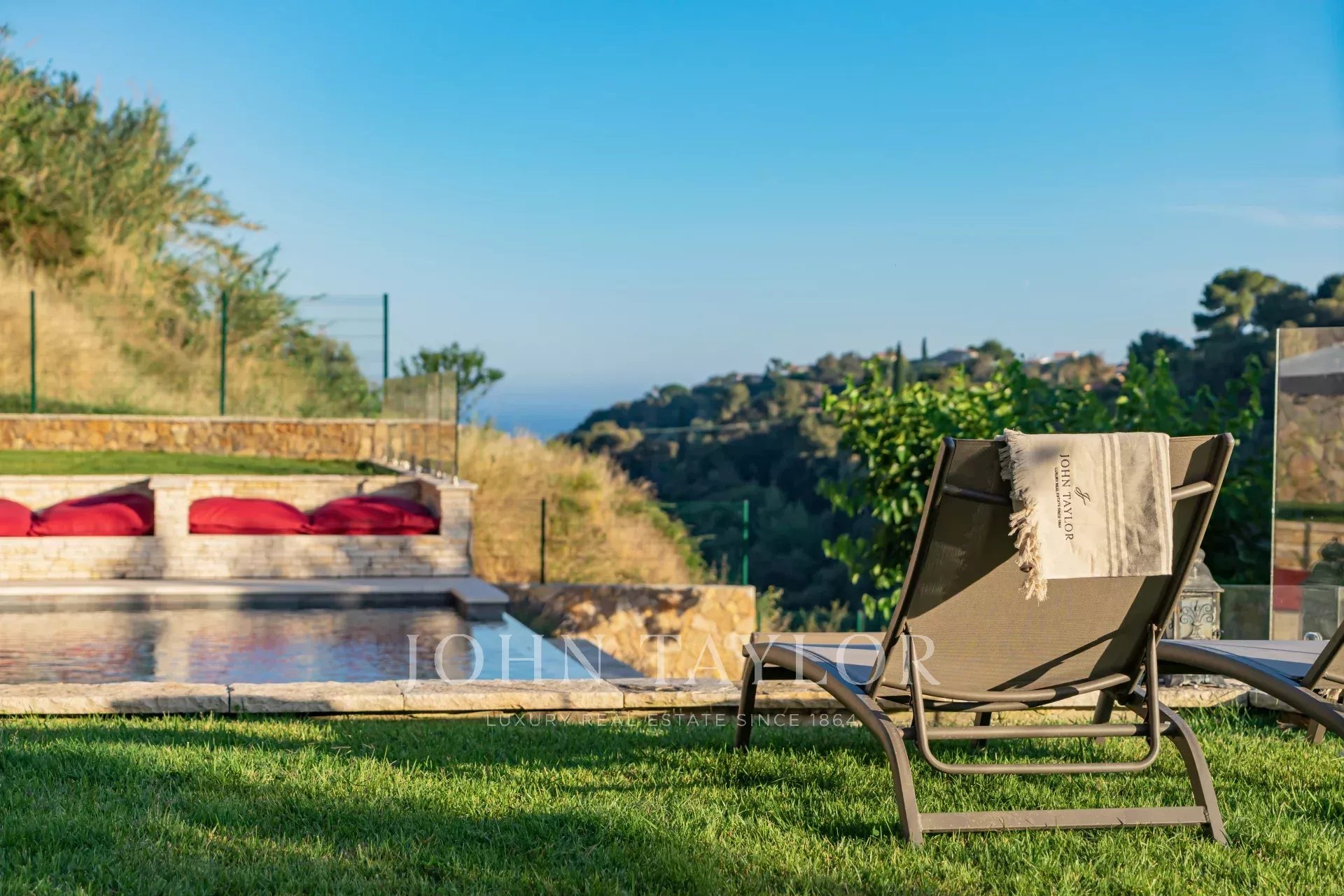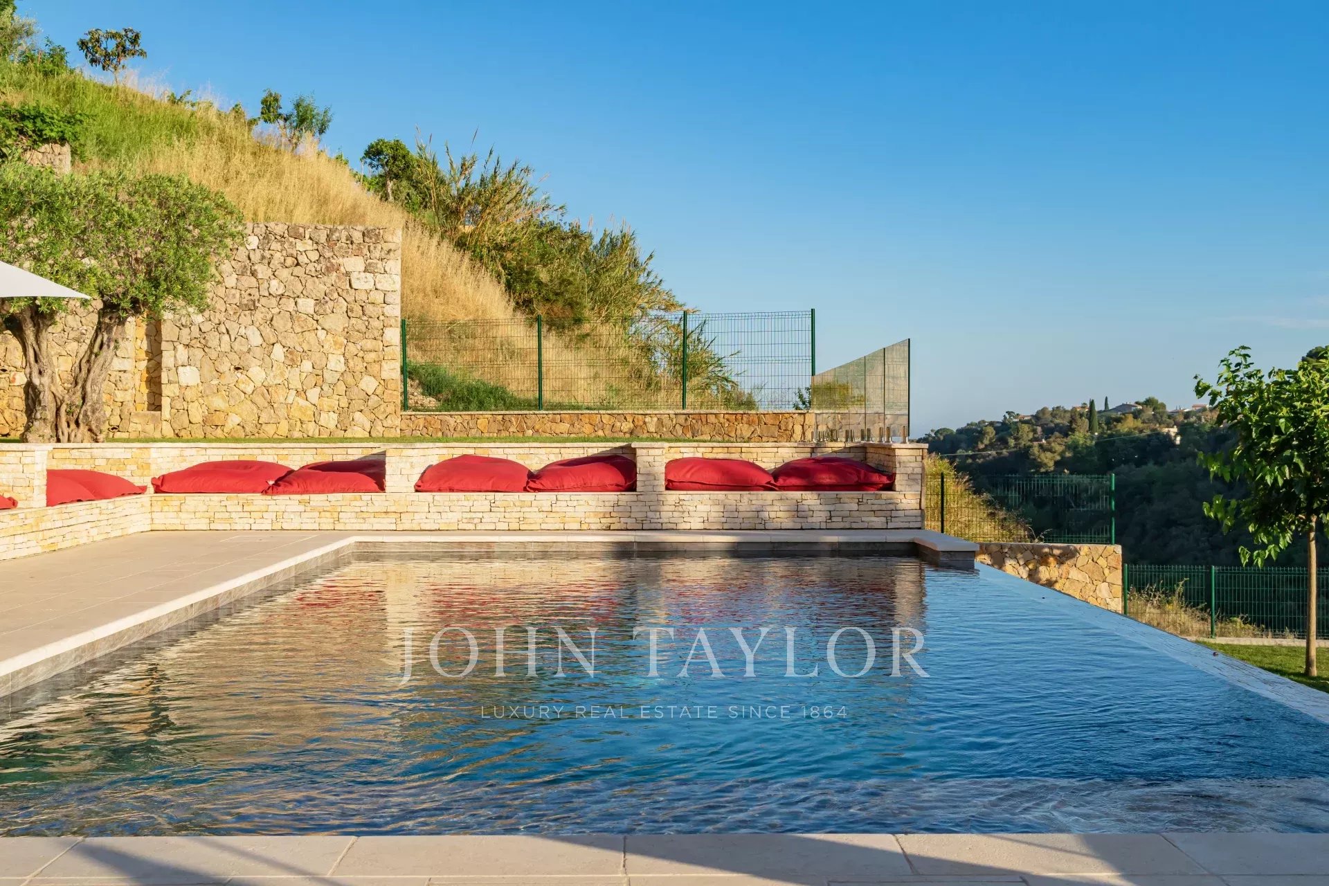 Très belle piscine à débordement avec grand espace détente tout autour. Très belle vue sur les collines, le château de Cagnes-sur-mer et la mer.