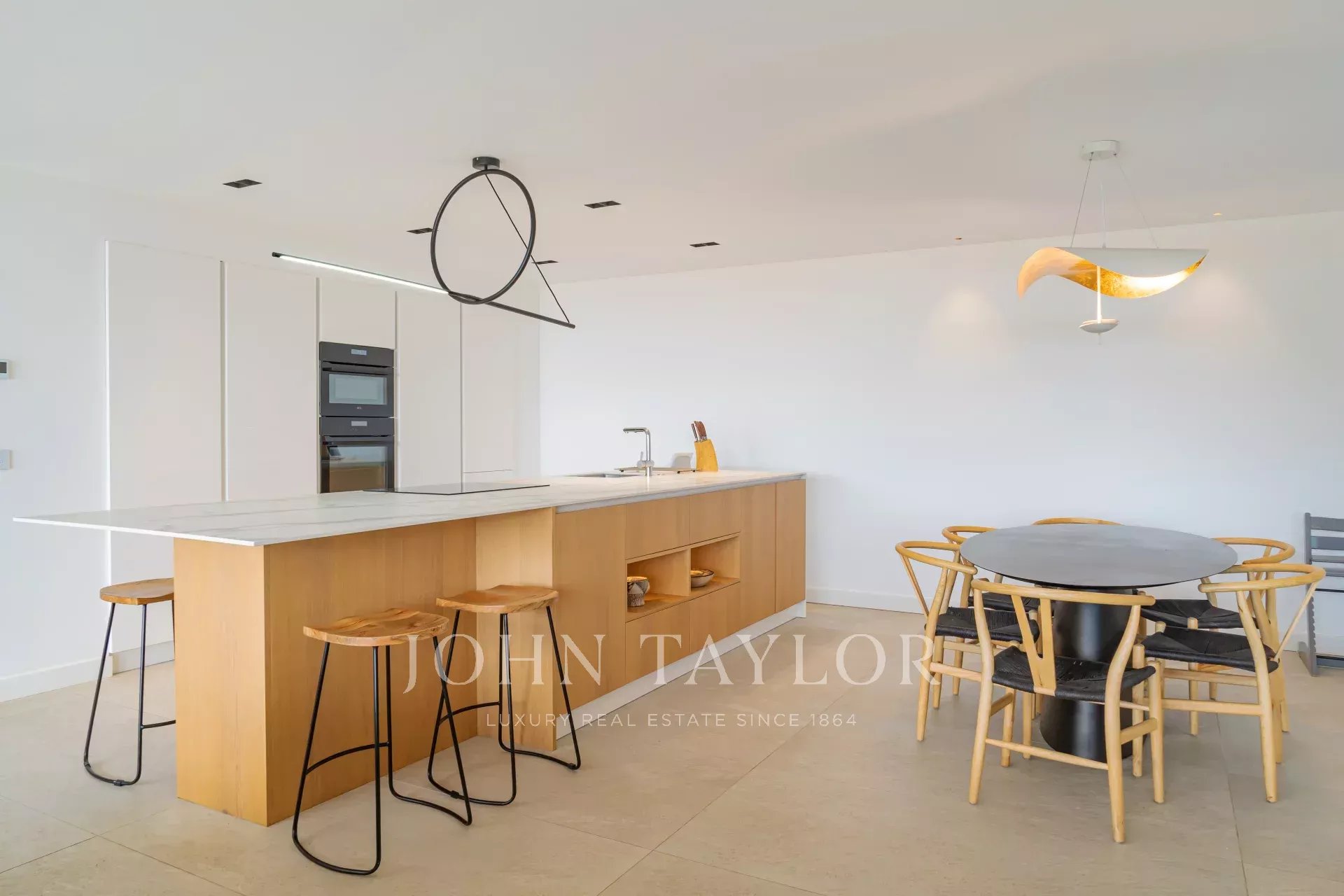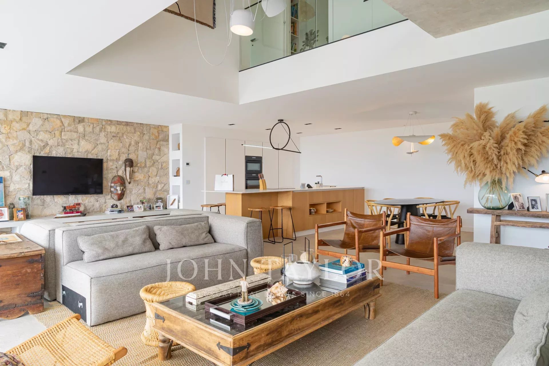 La villa offre une pièce à vivre élégante en béton ciré, comprenant un spacieux salon, une salle à manger, et une cuisine entièrement équipée. Cet espace est entièrement ouvert sur l’extérieur grâce à de grandes baies vitrées à galandage de 3 mètres, offrant une luminosité exceptionnelle et une connexion harmonieuse avec la nature environnante.