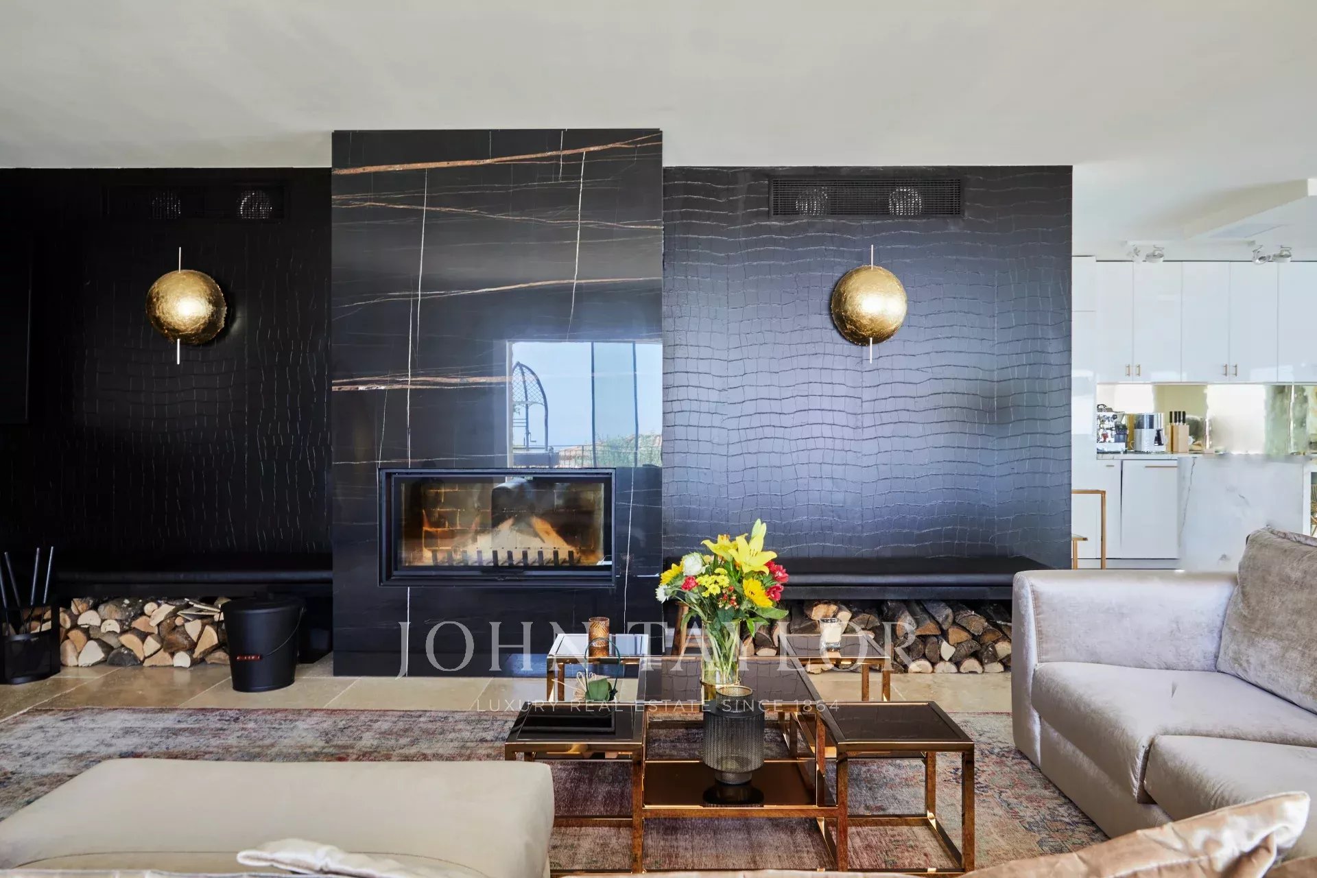 Au rez-de-chaussée, un bel espace de vie avec salon équipé d'une télévision, système de son Sonos, cheminée à bois.