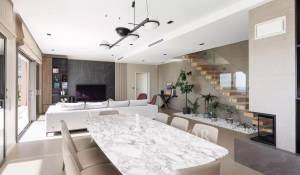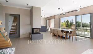 À l’extérieur, un jardin paysager et plusieurs terrasses avec pergola vous invitent à profiter de la vue imprenable et de la piscine, chauffable sur demande, parfaite pour des moments de détente en toute saison.