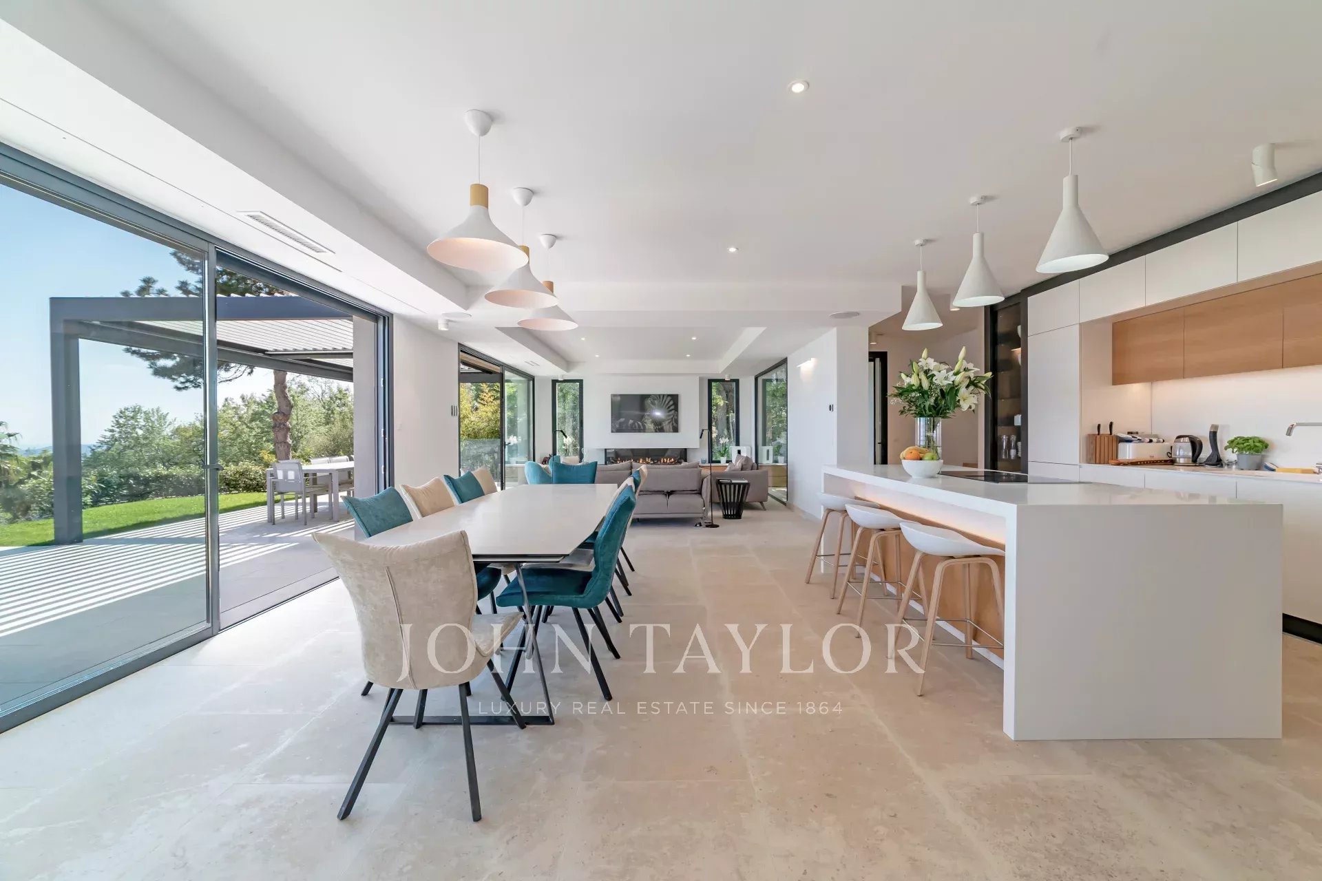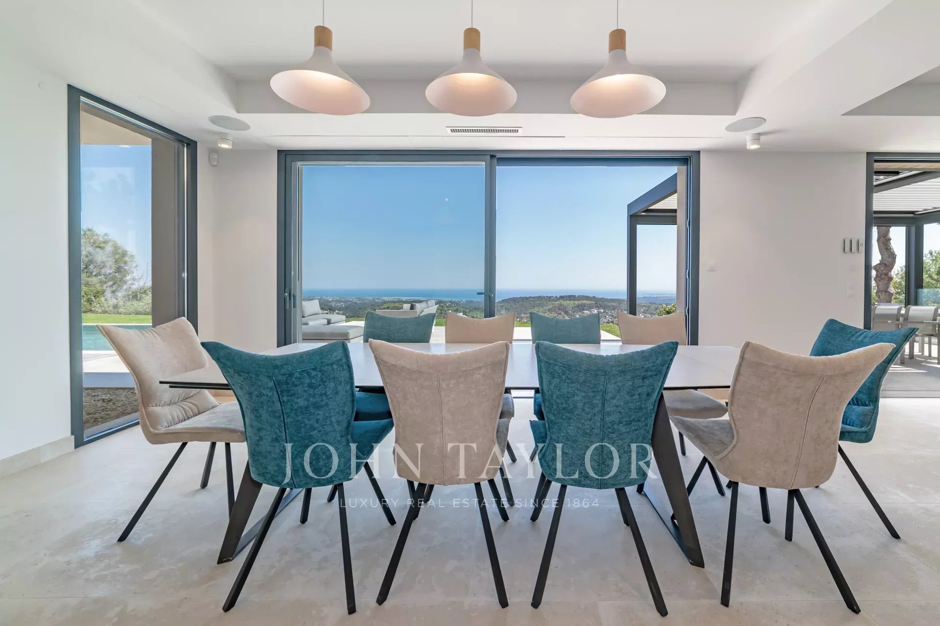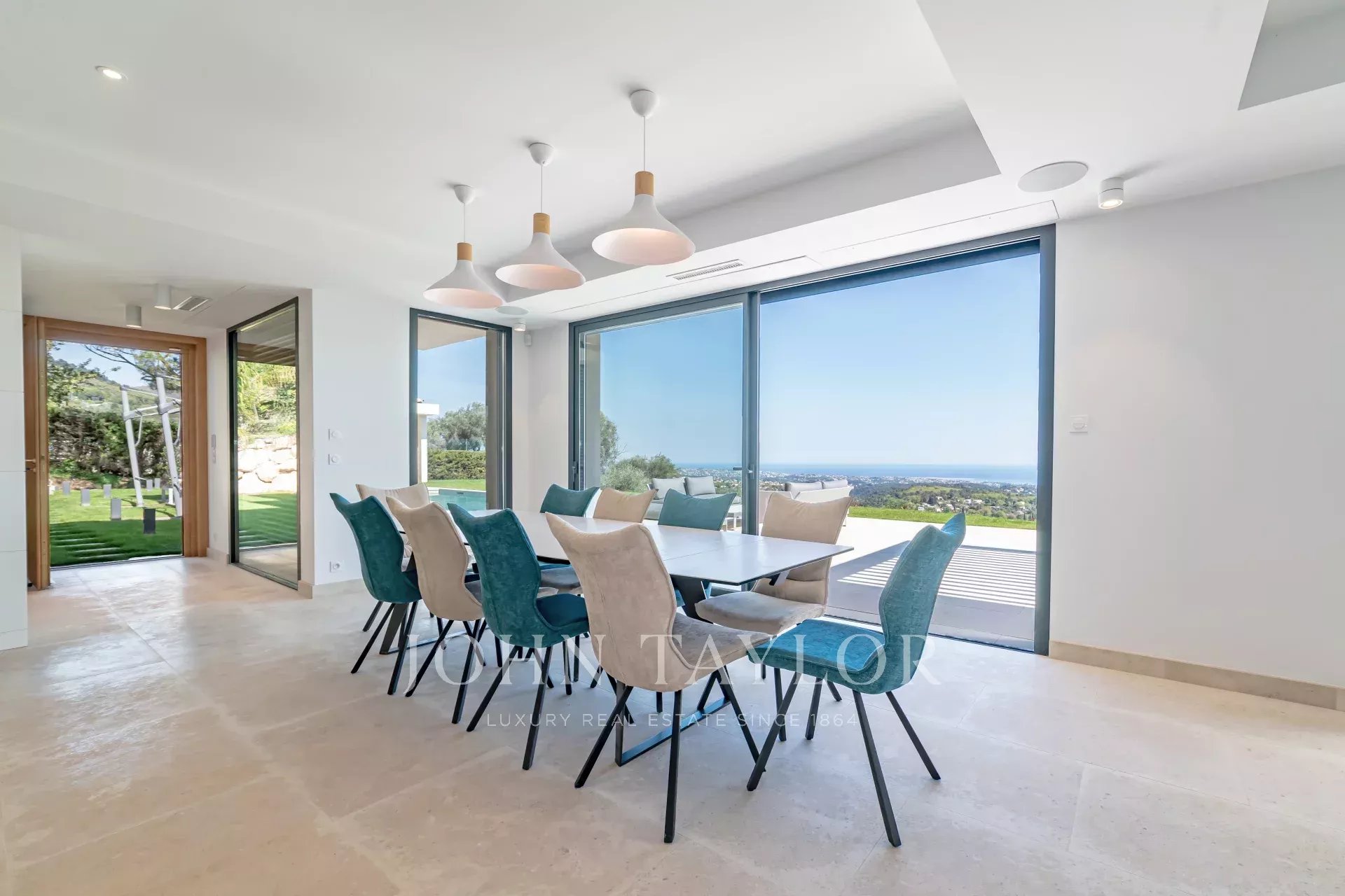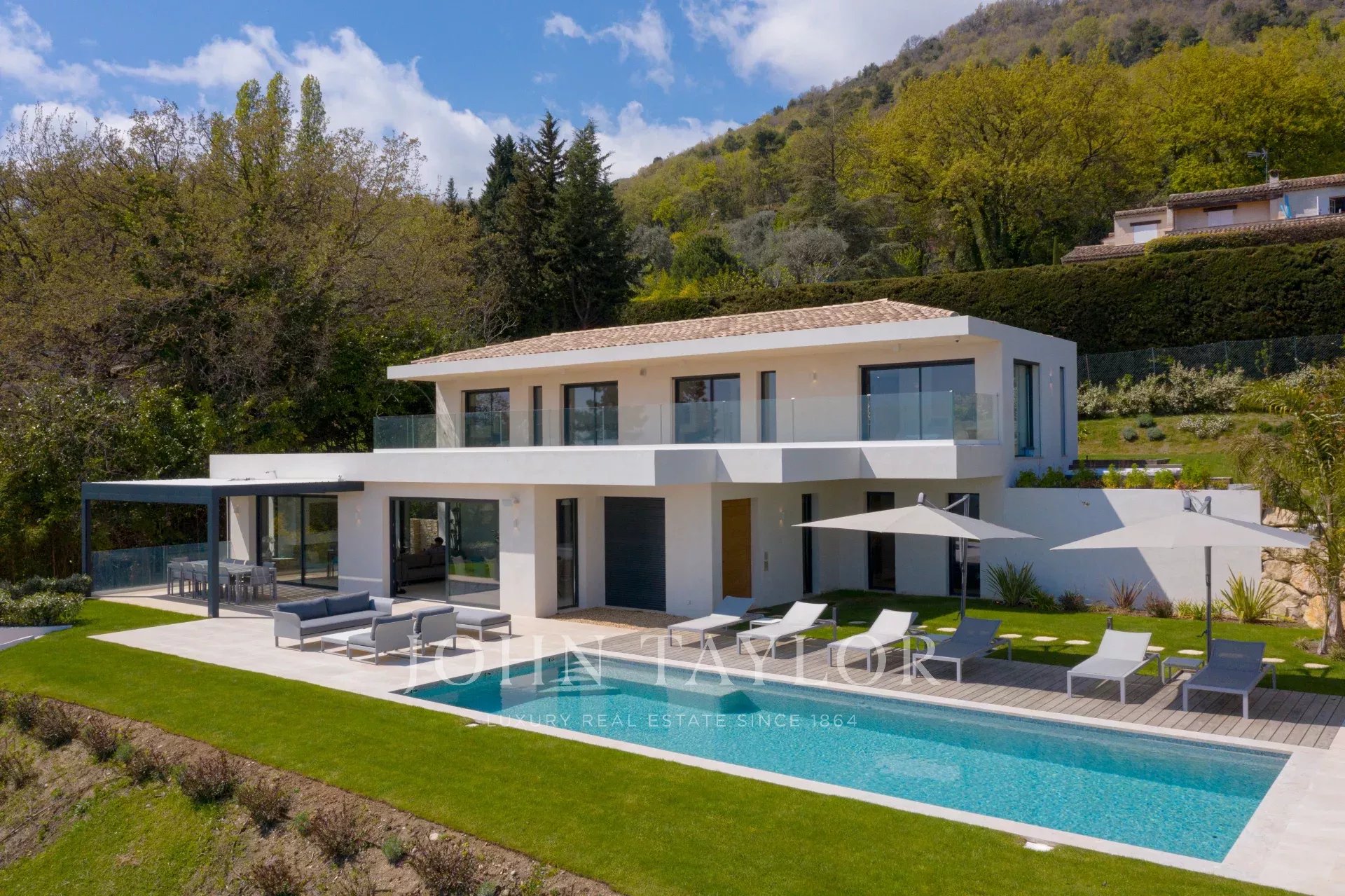 En position dominante sur les hauteurs de Vence, cette splendide villa propose 5 chambres avec salle de bains/douches ensuite, une pièce de vie très lumineuse avec une cuisine ouverte donnant directement accès à une très belle terrasse.