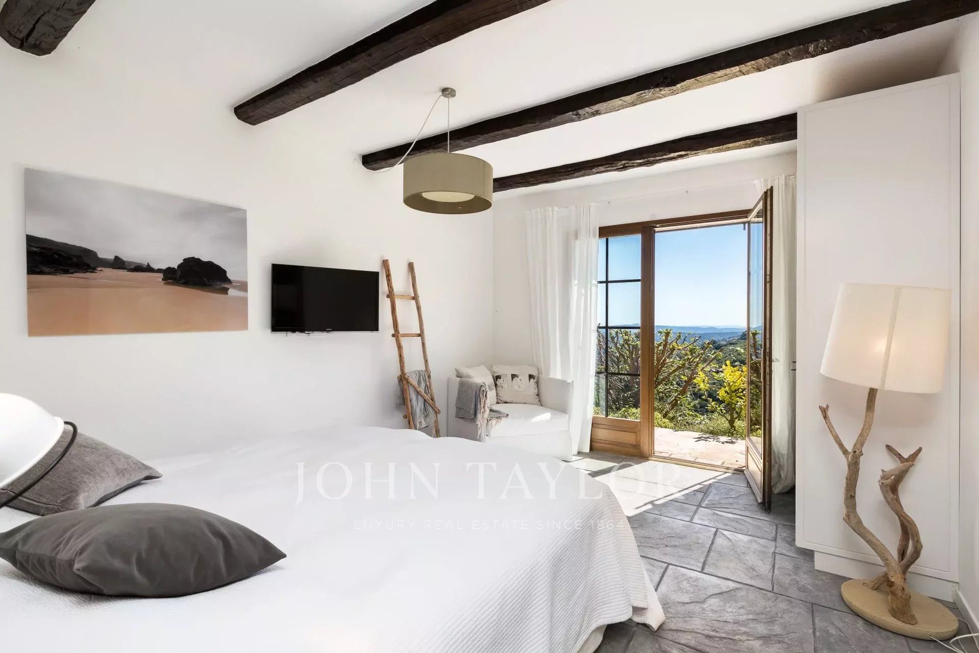 A l'extérieur, le pool house tout en pierre avec son four à pizza, sa cheminée et sa grande table en bois massif ouvre sur la piscine à débordement et sa vue mer féerique que l'on peut admirer tout en se baignant. Non loin de là,se trouvent un splendide salon marocain pour se détendre et une salle de gym.