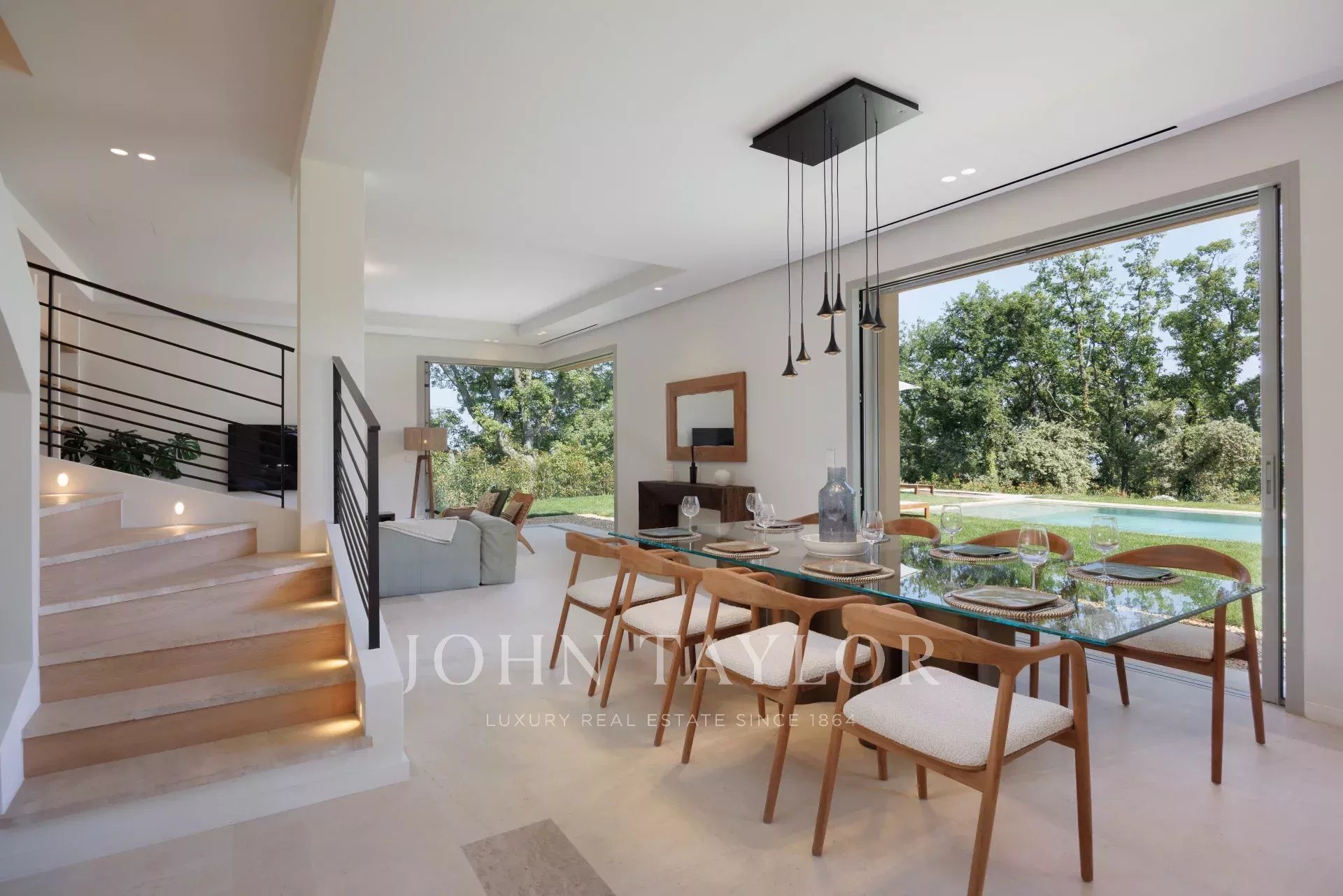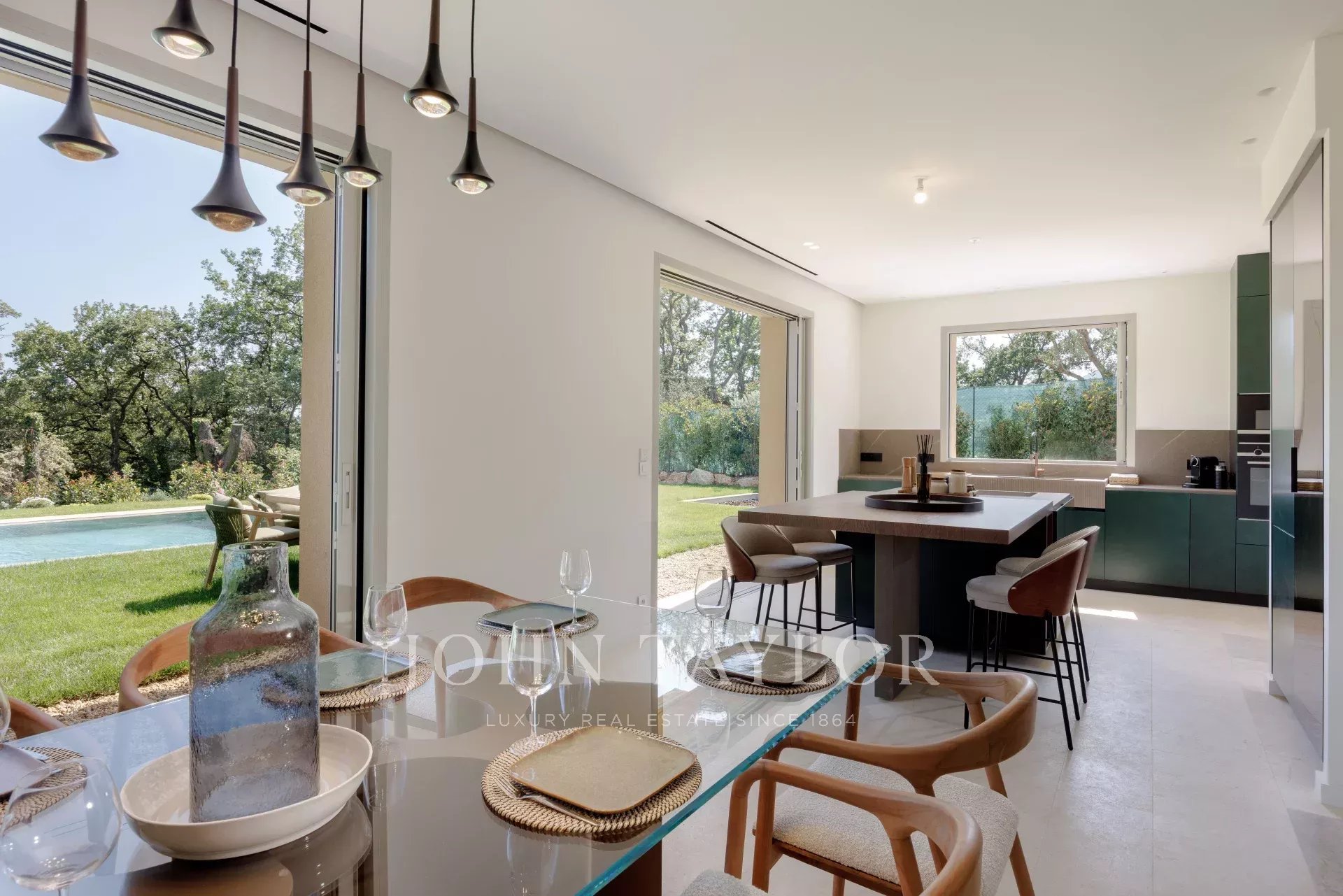 La maison, baignée de lumière grâce à de grandes baies vitrées à galandage, s’ouvre sur un vaste séjour prolongé par une terrasse ensoleillée et un jardin plat avec piscine.