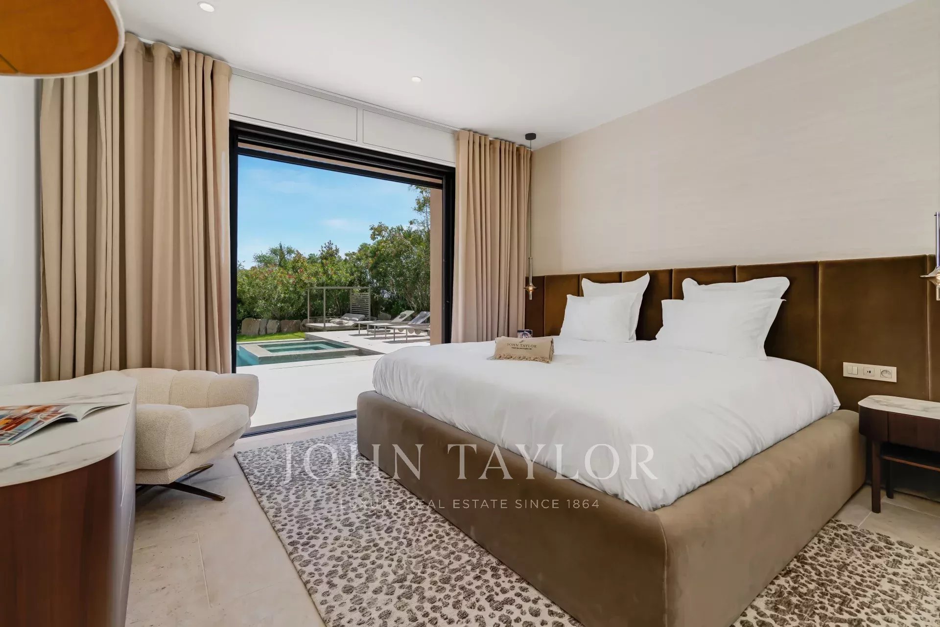 - Une chambre (Chambre 1) avec lit 200x200, TV, salle de bains complète (baignoire, douche hammam, double vasque, WC), dressing et accès direct à la piscine