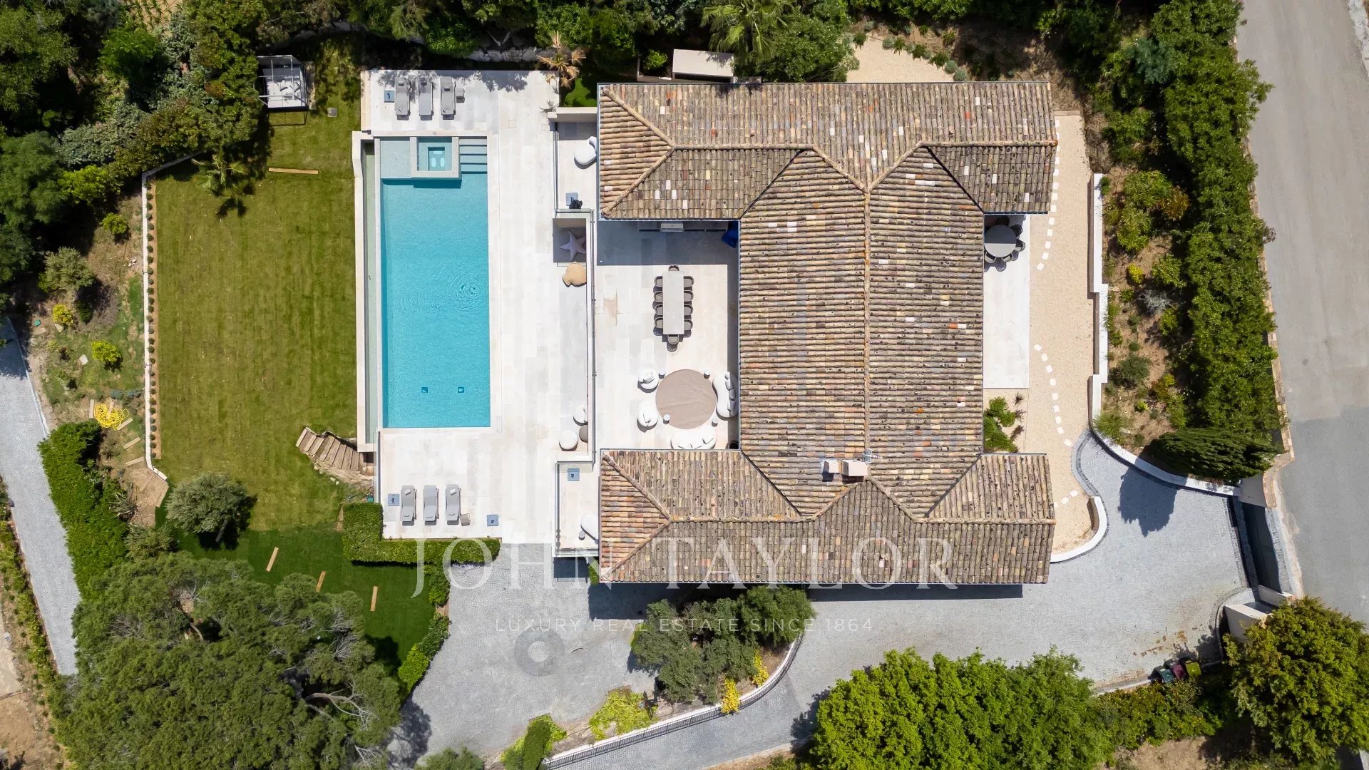 - Chambre 5 : lit 180x200, TV, dressing, salle de bains complète (baignoire, douche, double vasque, WC), accès direct à la terrasse