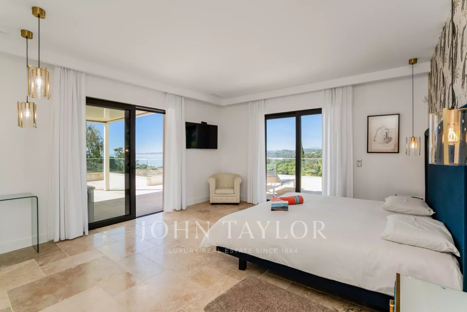 - Une chambre de maîtres avec une magnifique vue mer, un lit (200x200), TV, dressing avec coffre-fort, une salle de douche avec double vasque et WC séparé.