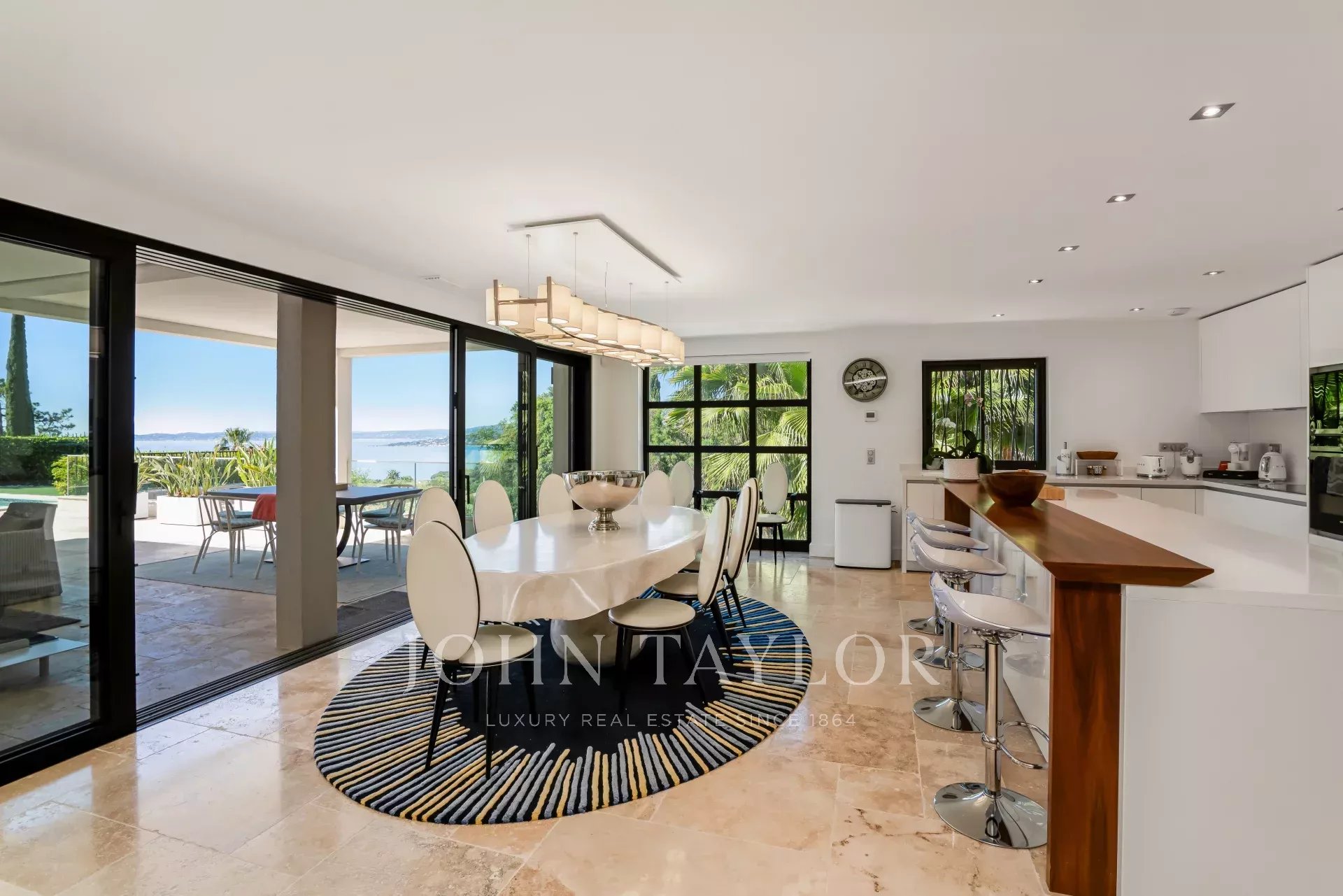 - Une vaste pièce à vivre composée d'un grand salon avec TV, d'une salle à manger et d'une cuisine ouverte, le tout bénéficiant d’une vue imprenable sur la mer. La cuisine possède également une arrière cuisine entièrement équipée.