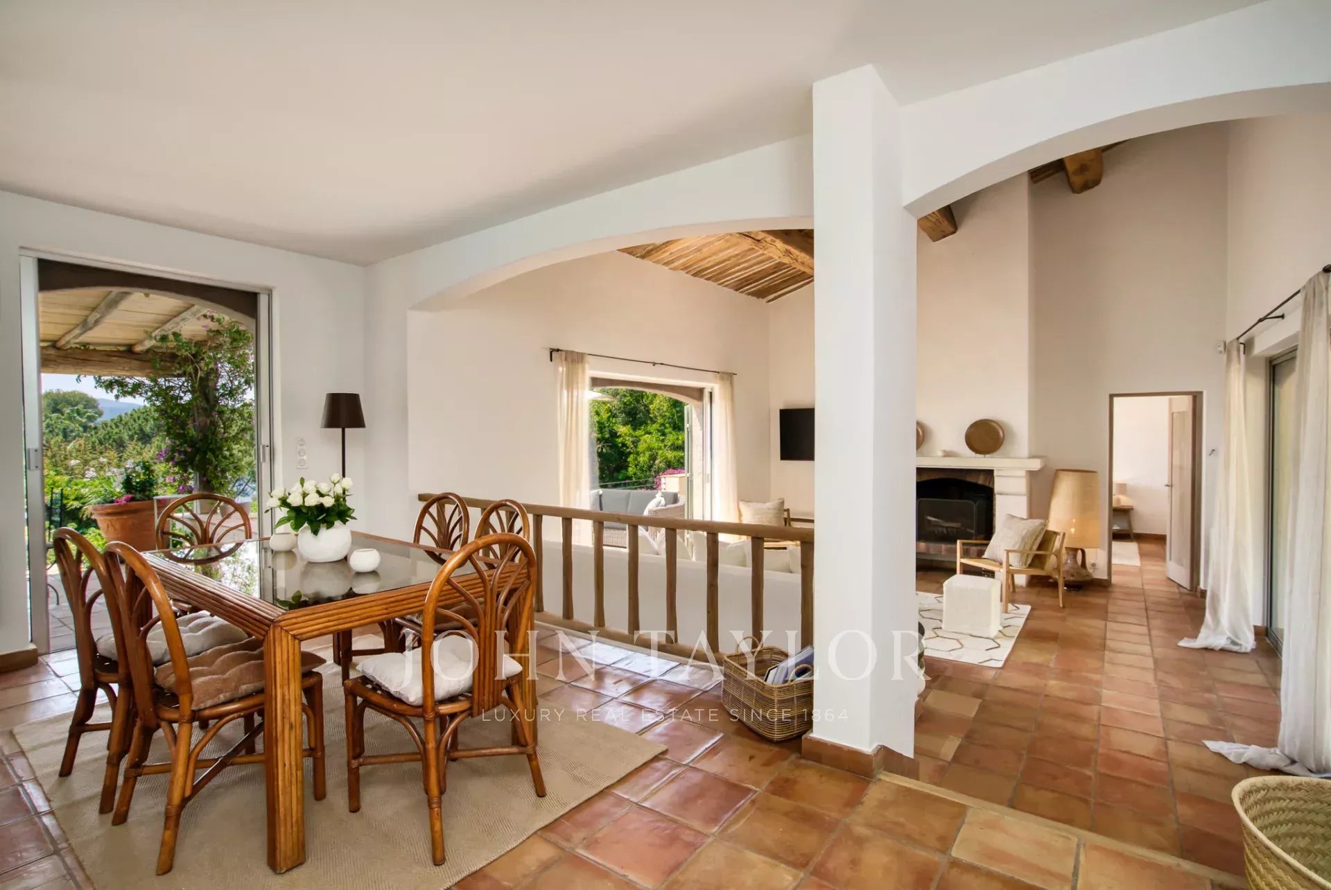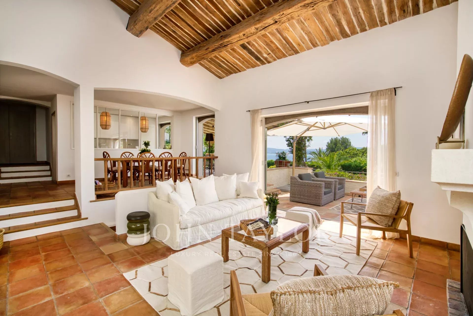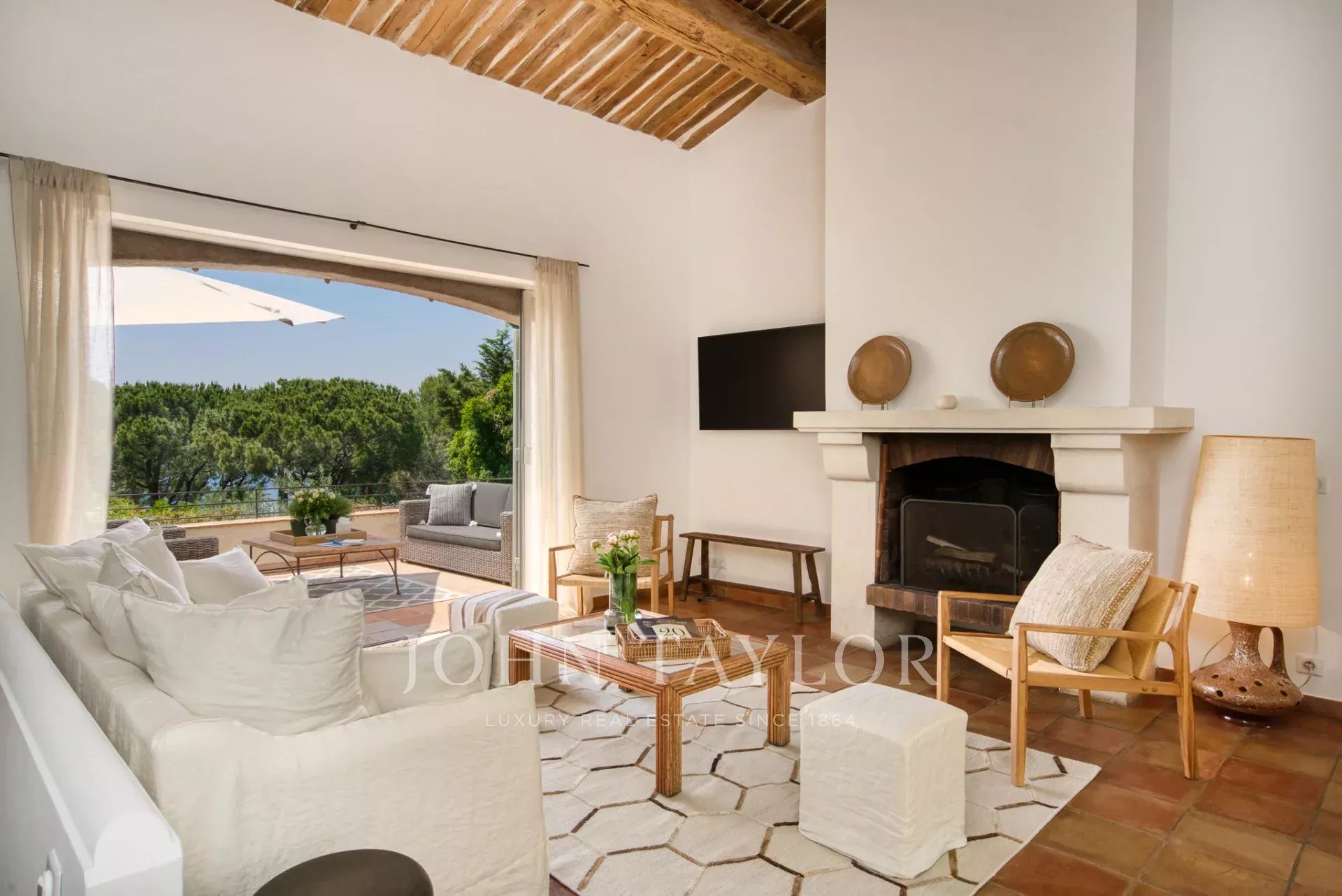 - un salon avec cheminée ouvrant sur une terrasse avec vue mer et un patio a l'abri du vent