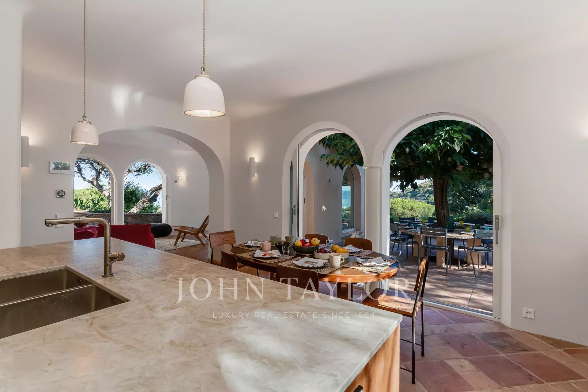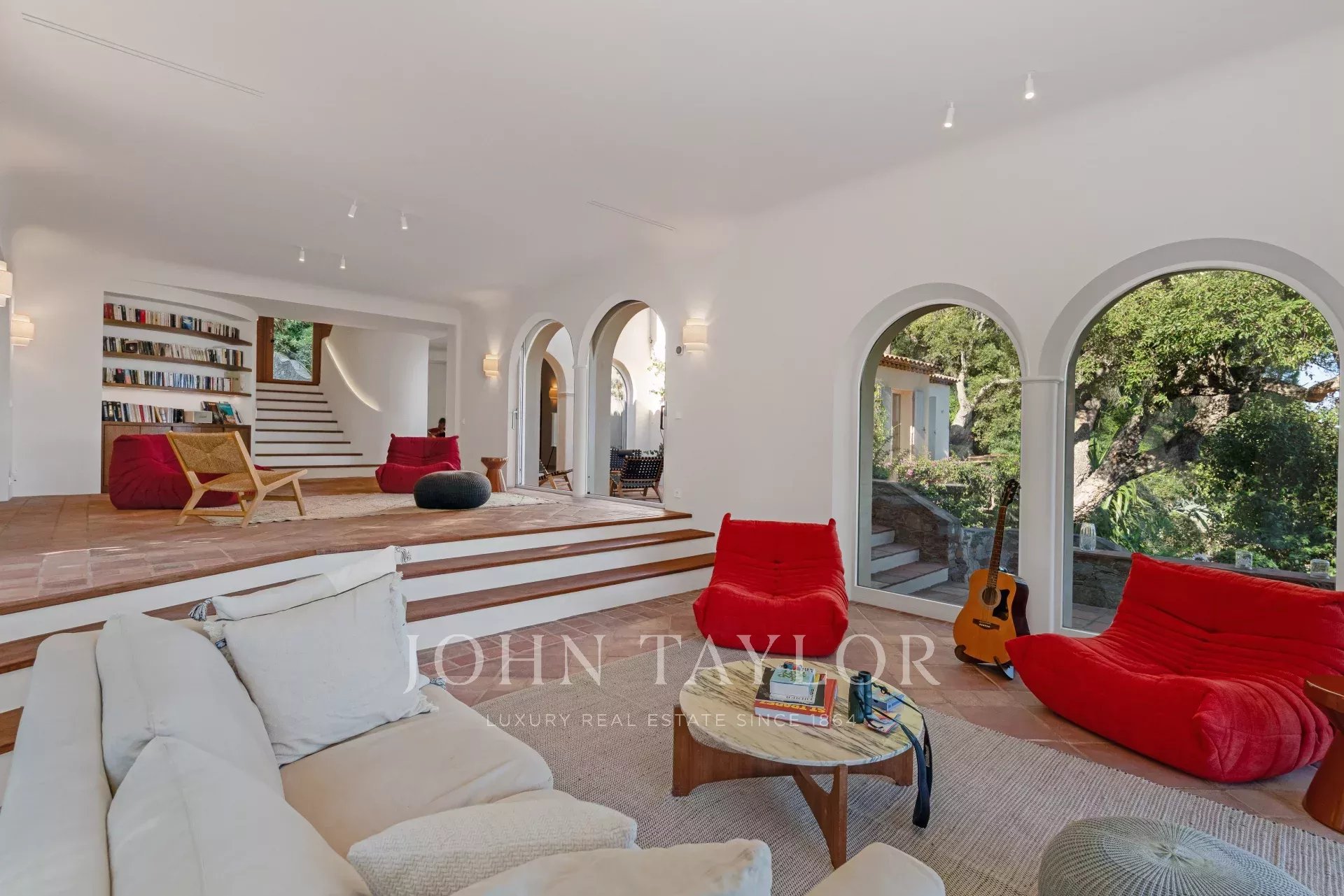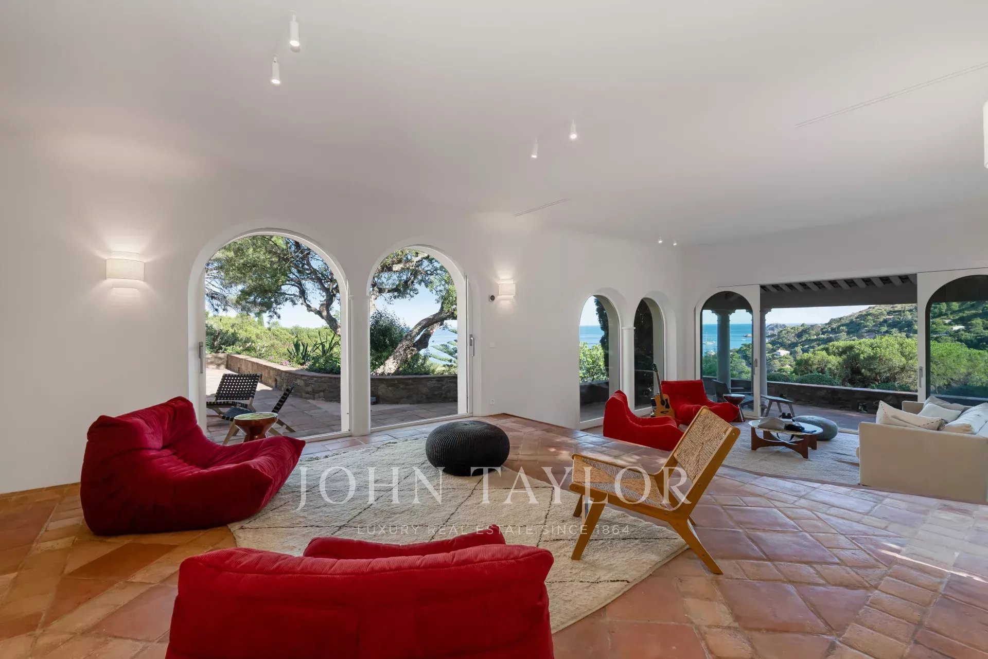 -un vaste salon avec des ouvertures sur des terrasses avec vue mer