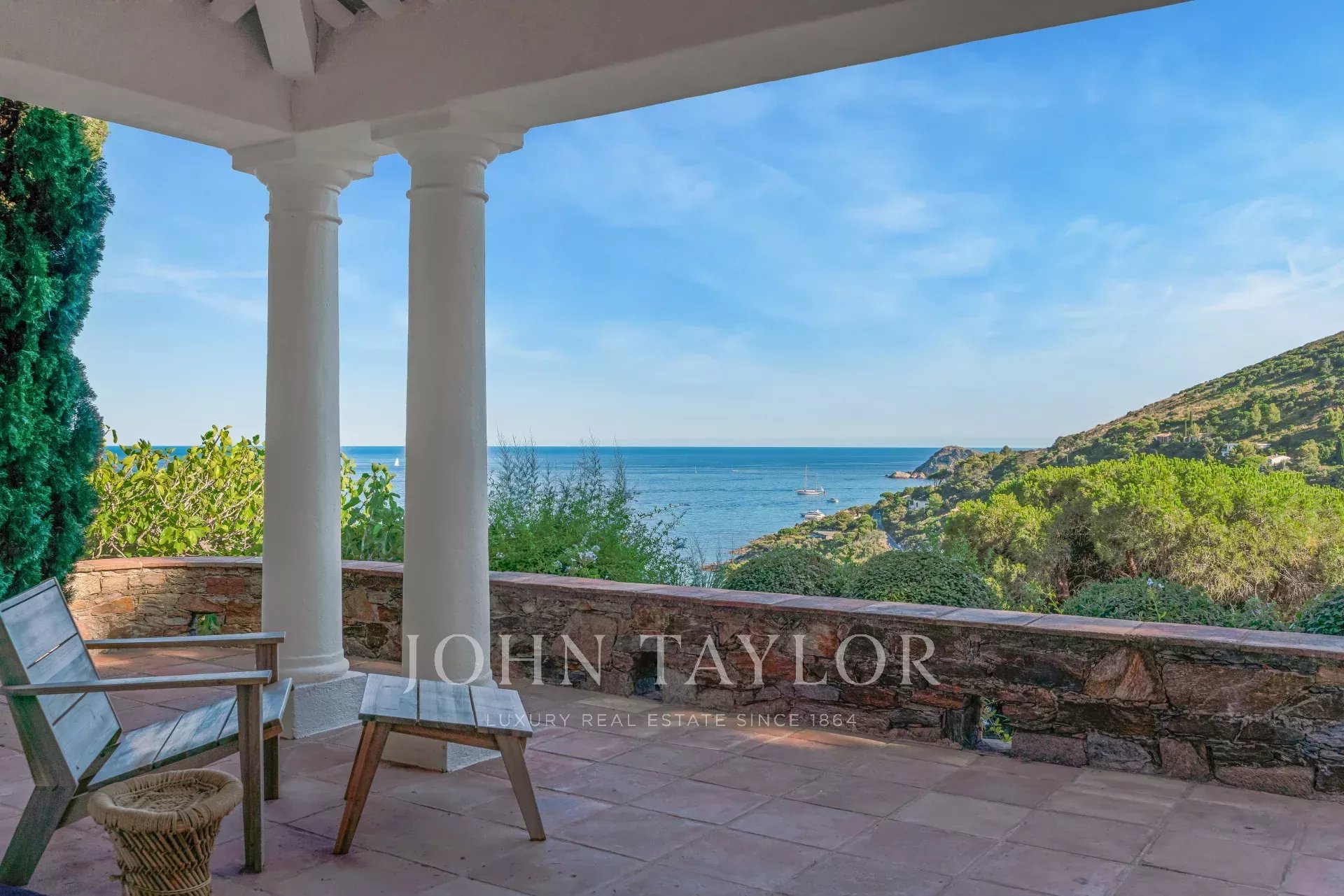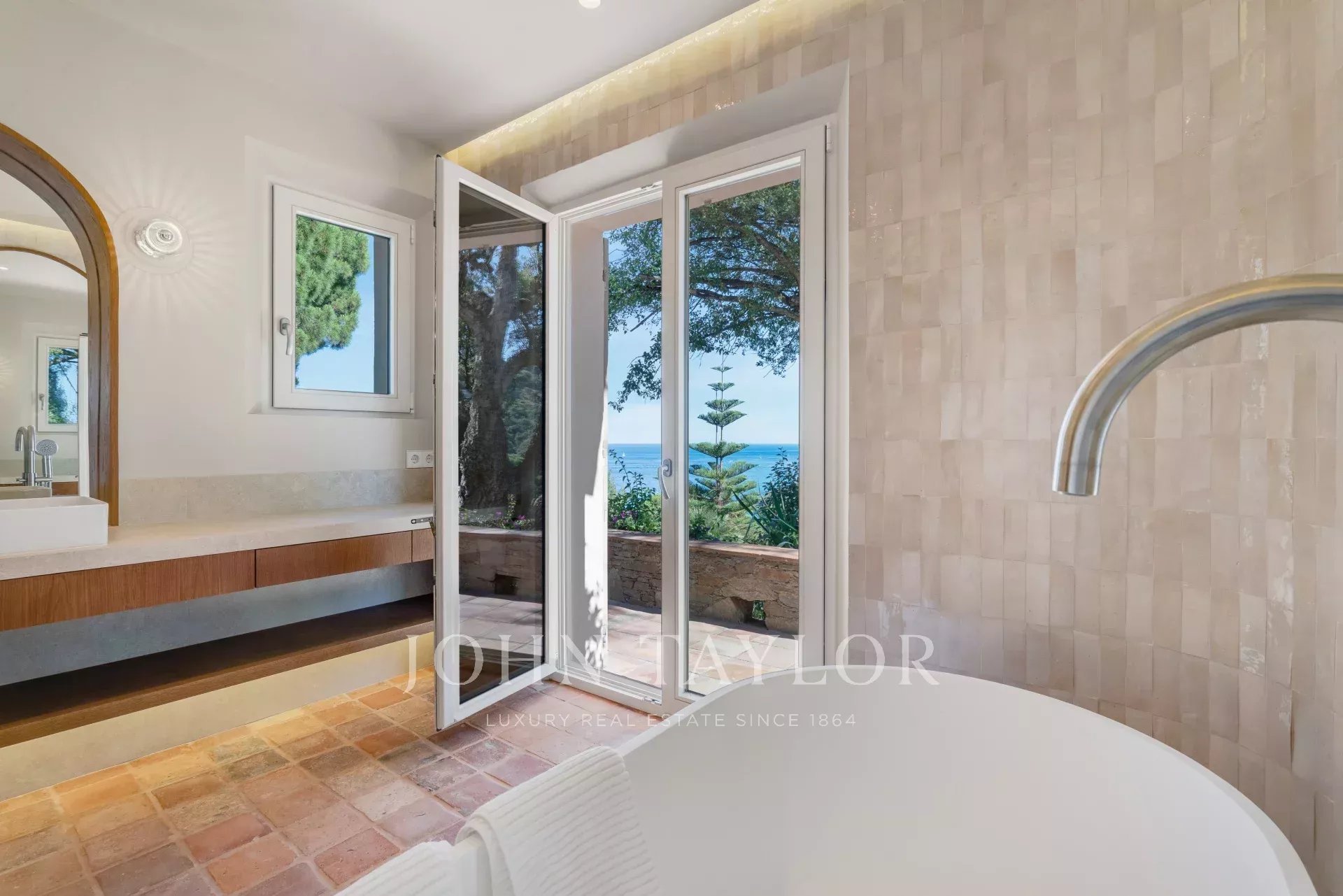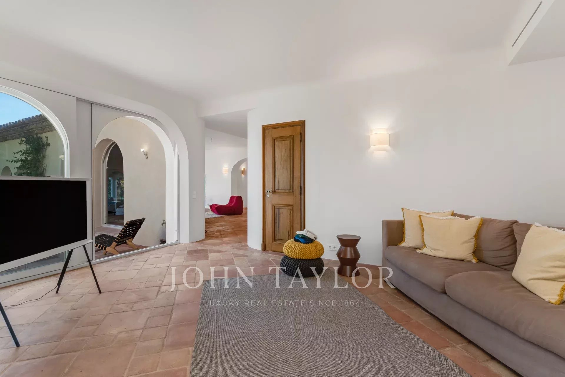 -un vaste salon avec des ouvertures sur des terrasses avec vue mer
