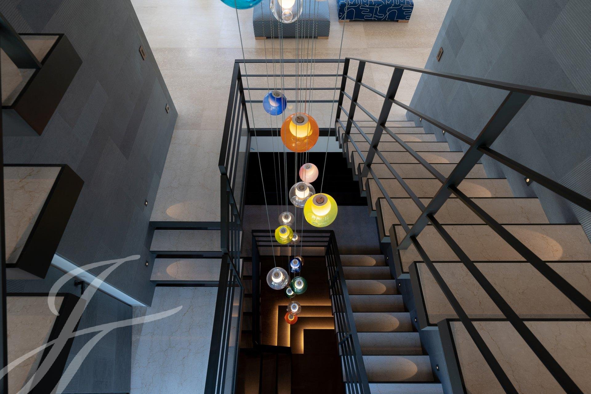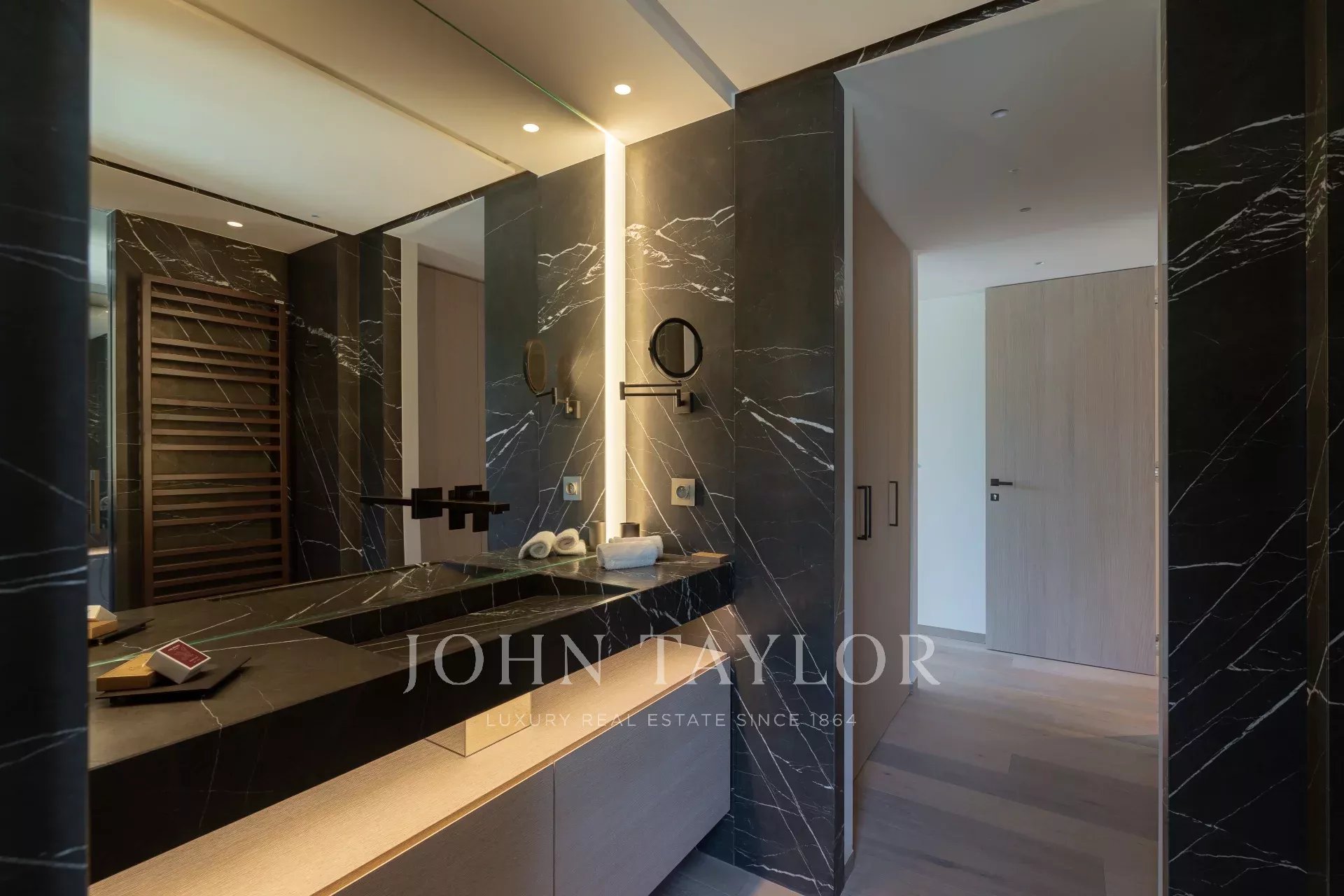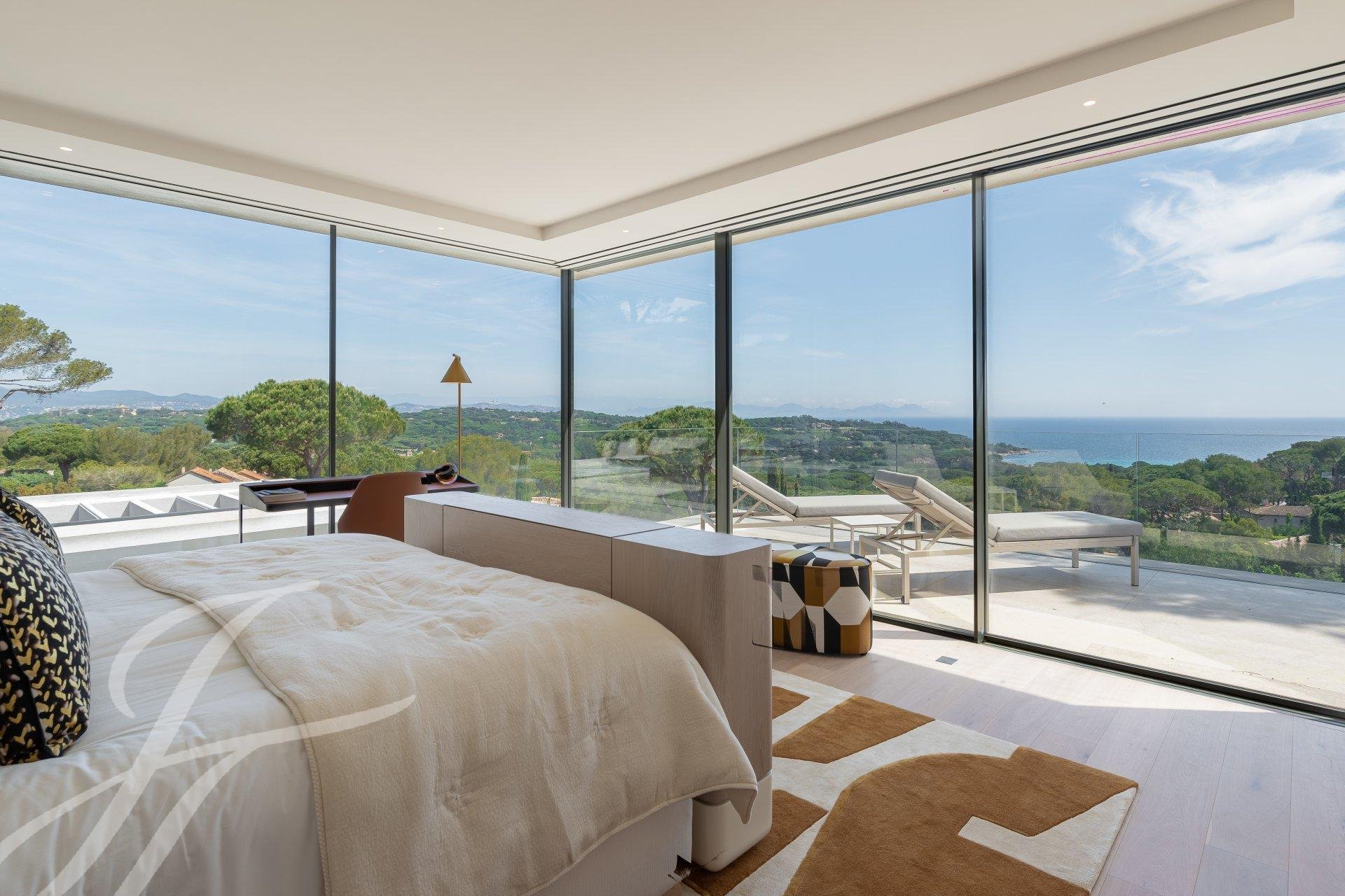 À l'étage, la suite principale vous offre une vue à couper le souffle, accompagnée d'un dressing spacieux et d'une salle de bains complète. De plus, trois chambres d'amis avec salles de douche privatives sont également à disposition, ainsi que deux chambres pour le personnel avec leurs propres salles de douche.