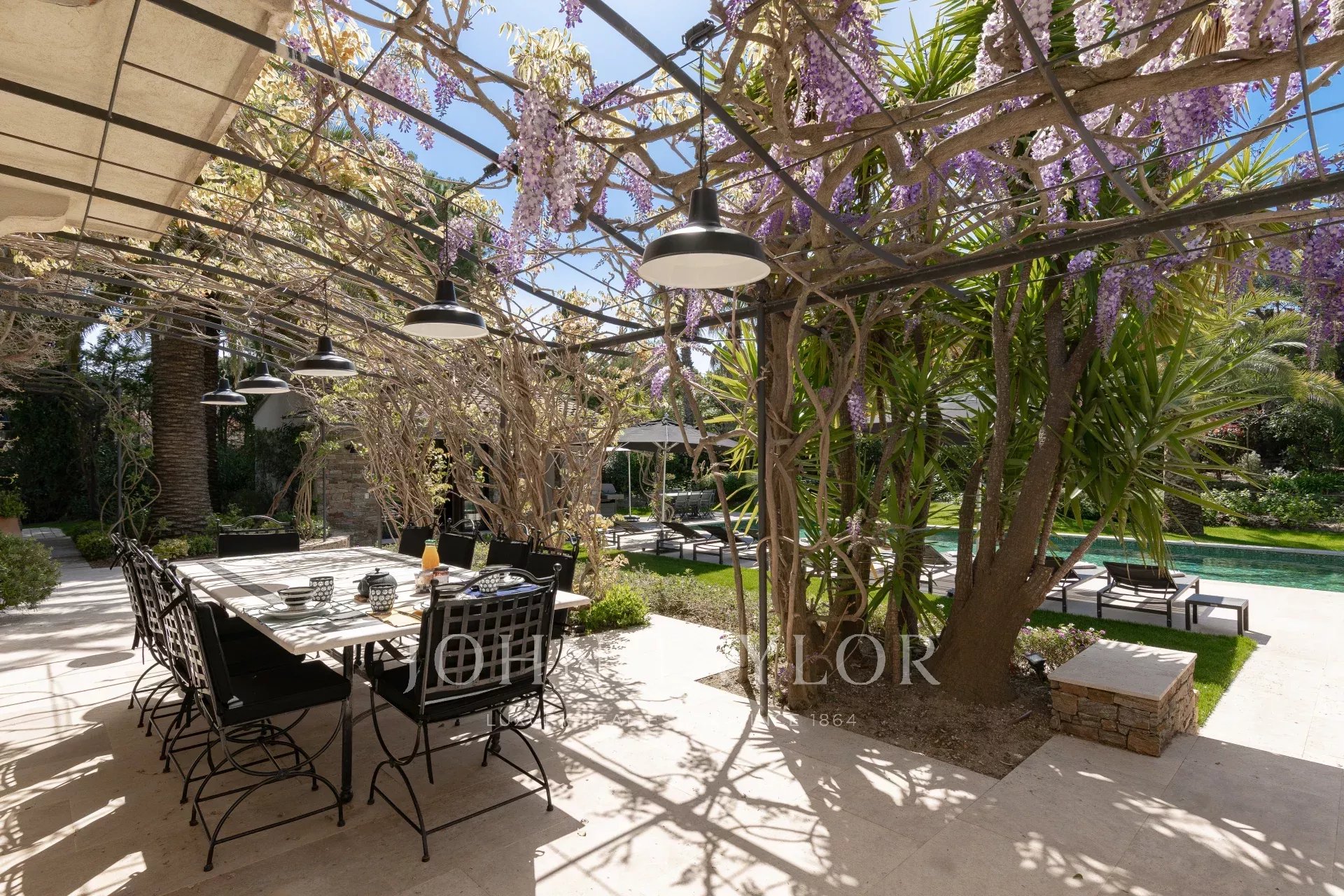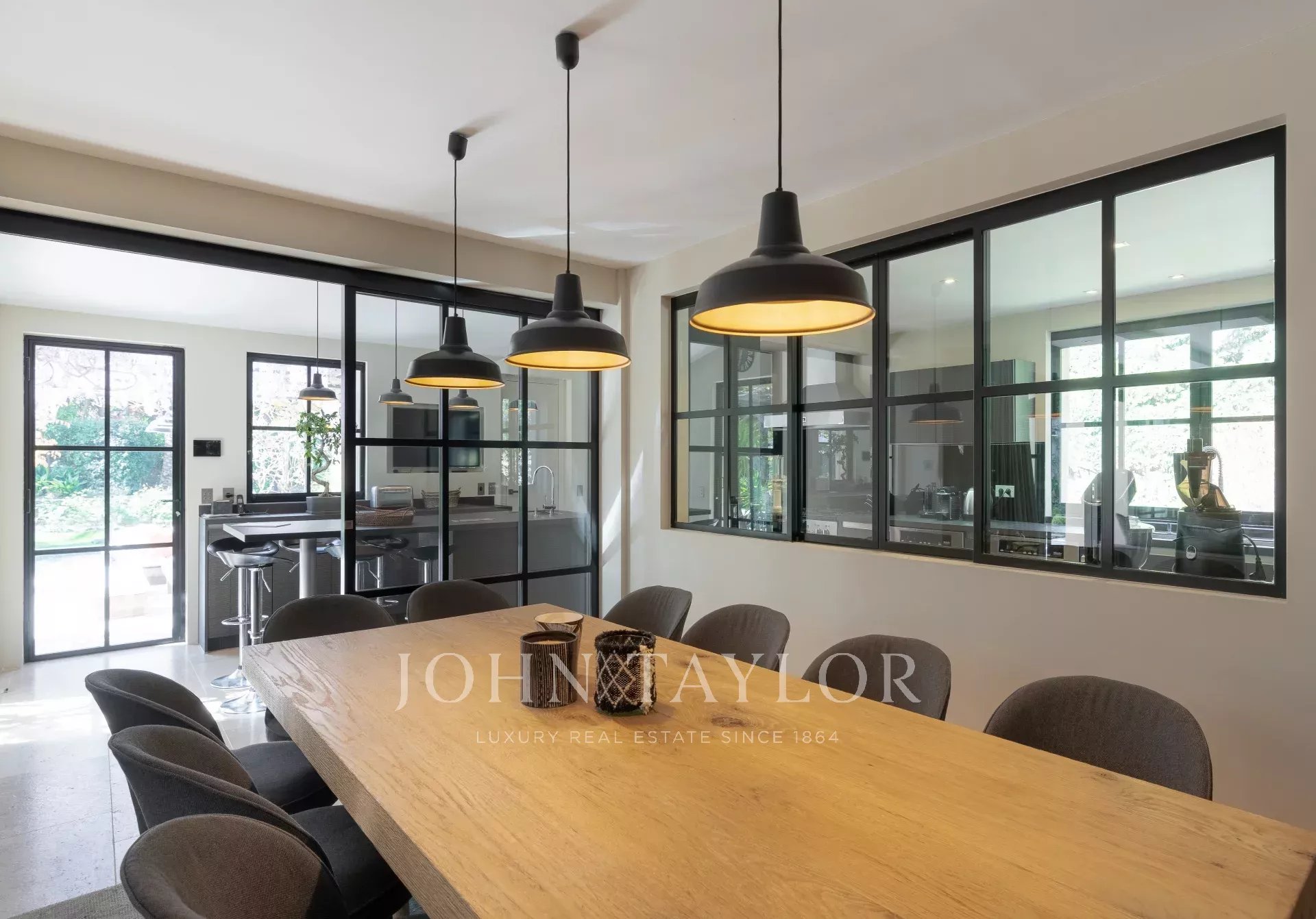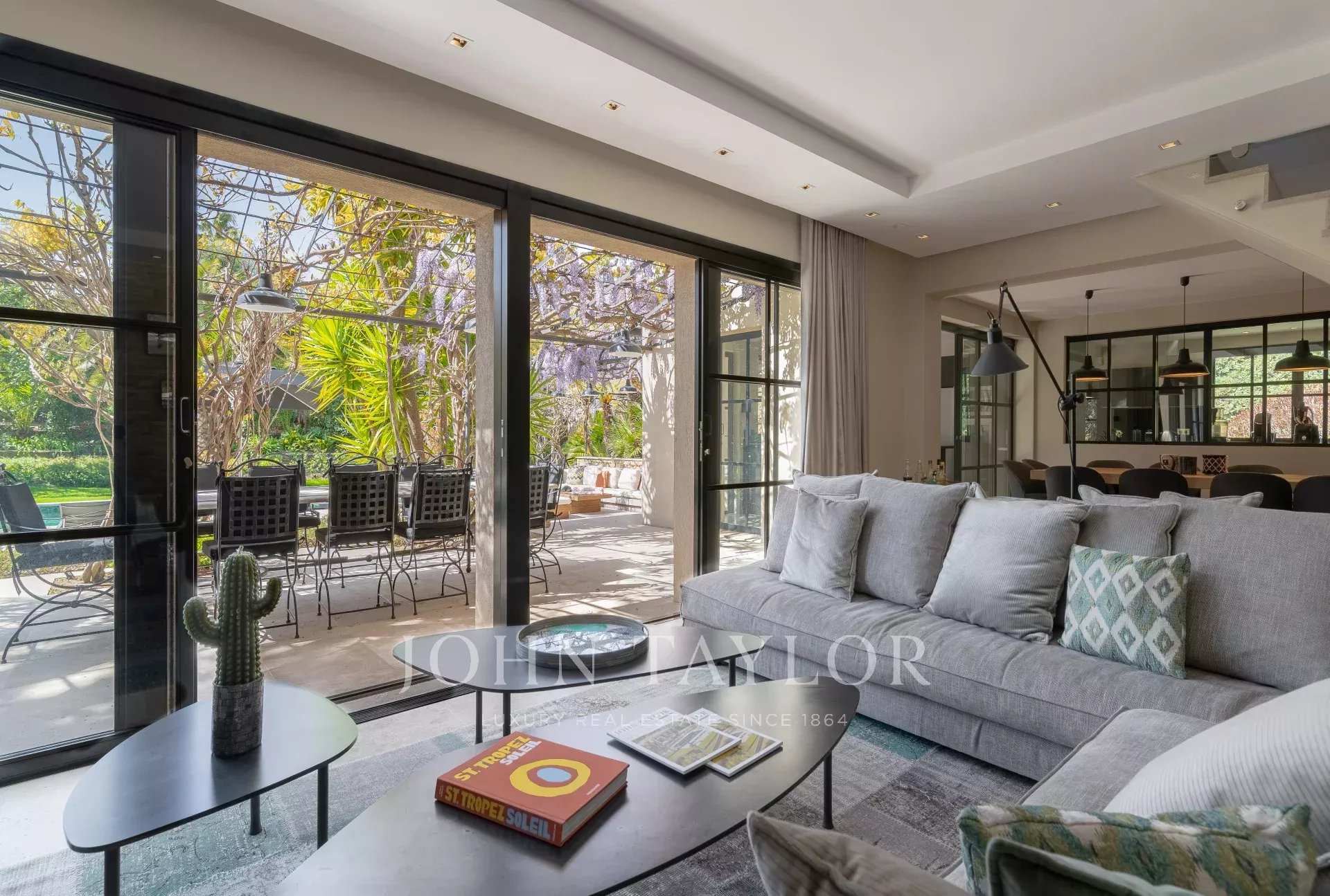 - Un vaste salon avec salle à manger ouvrant sur une terrasse avec glycines