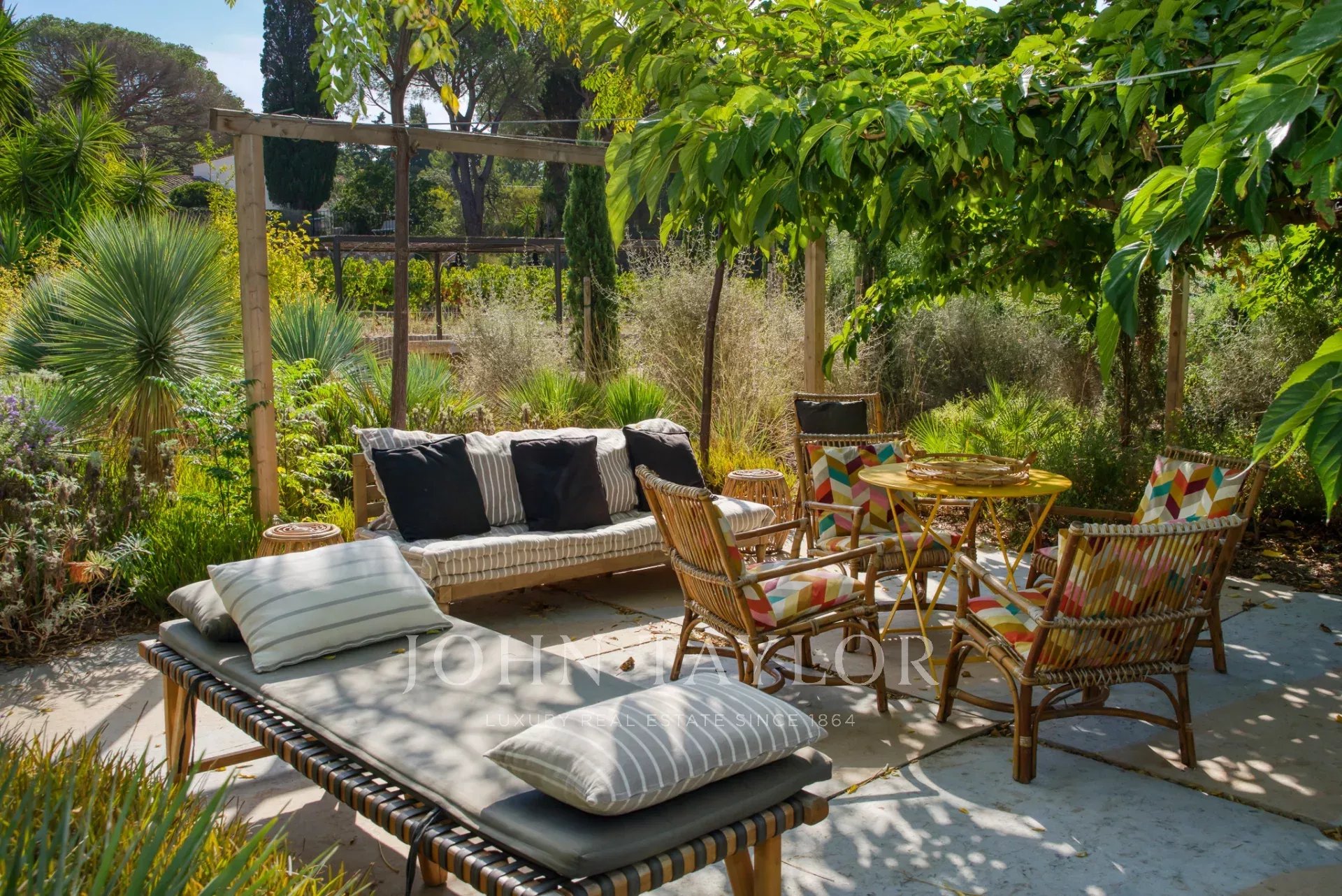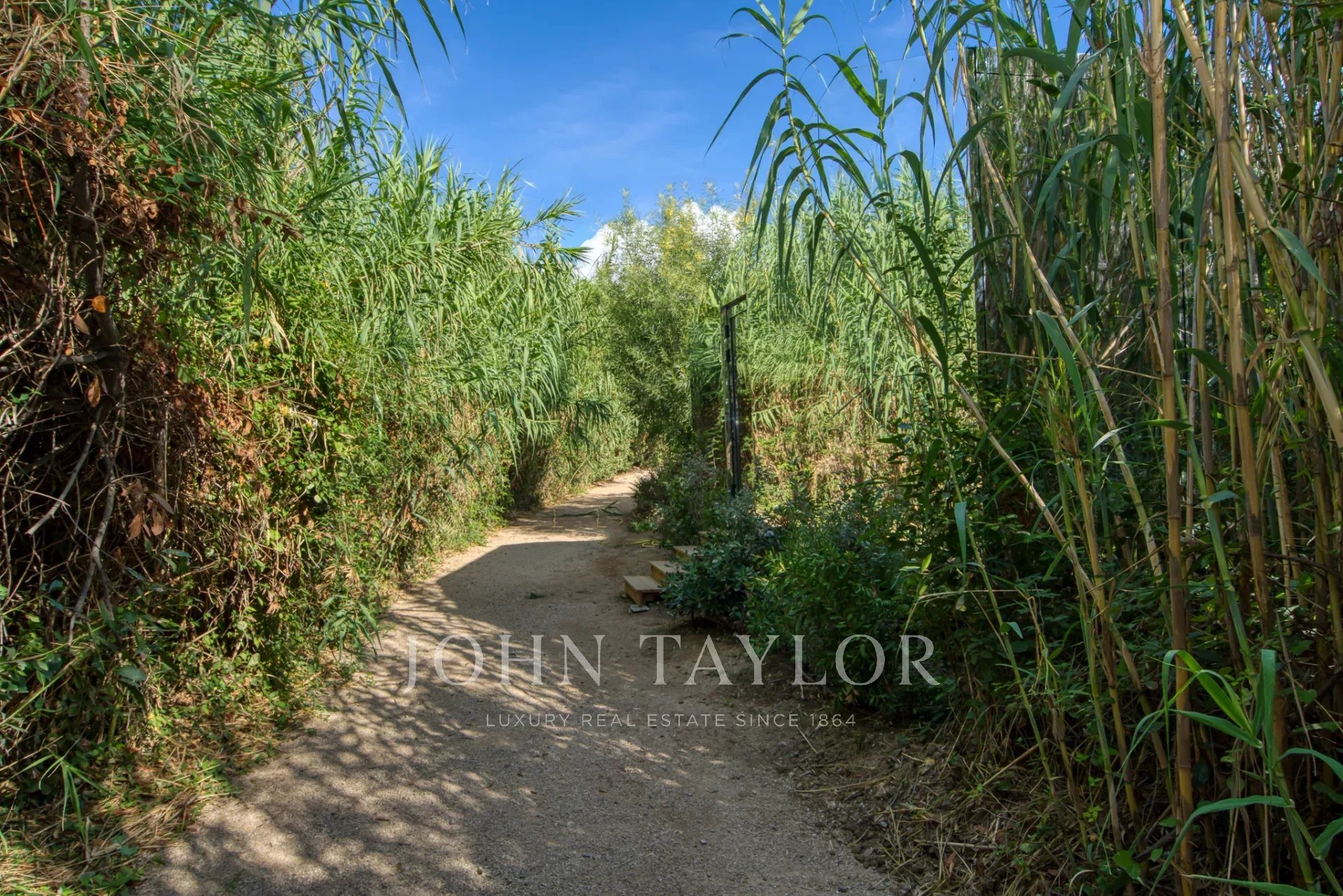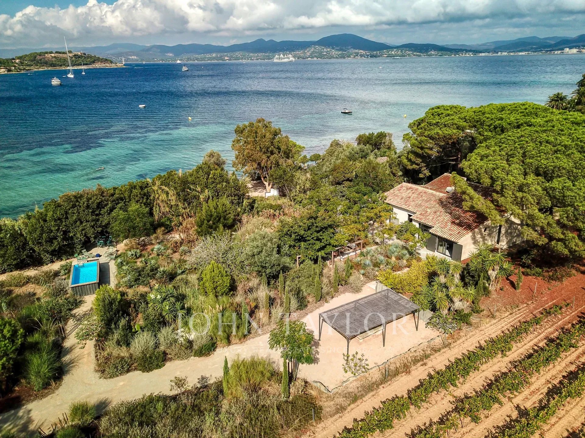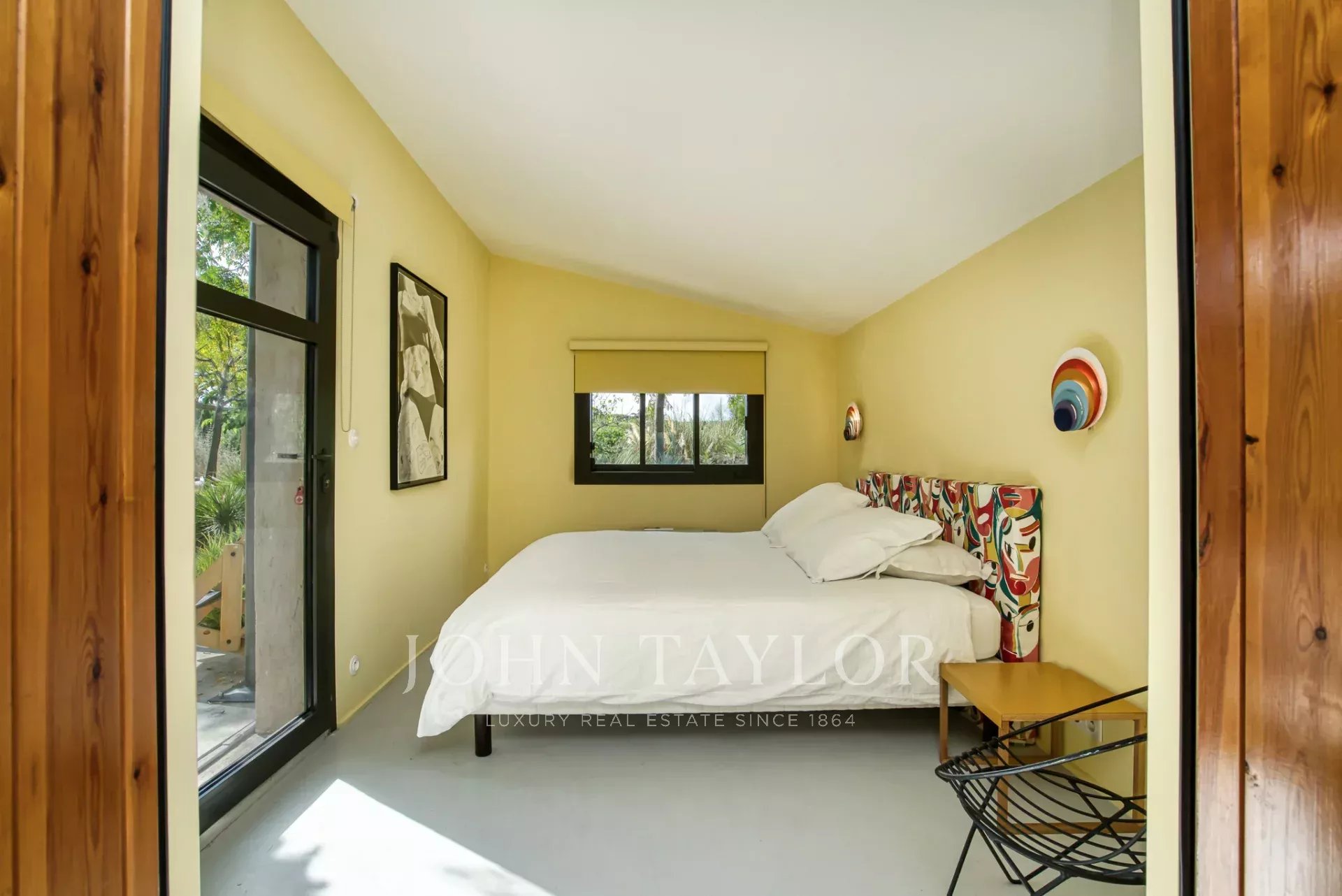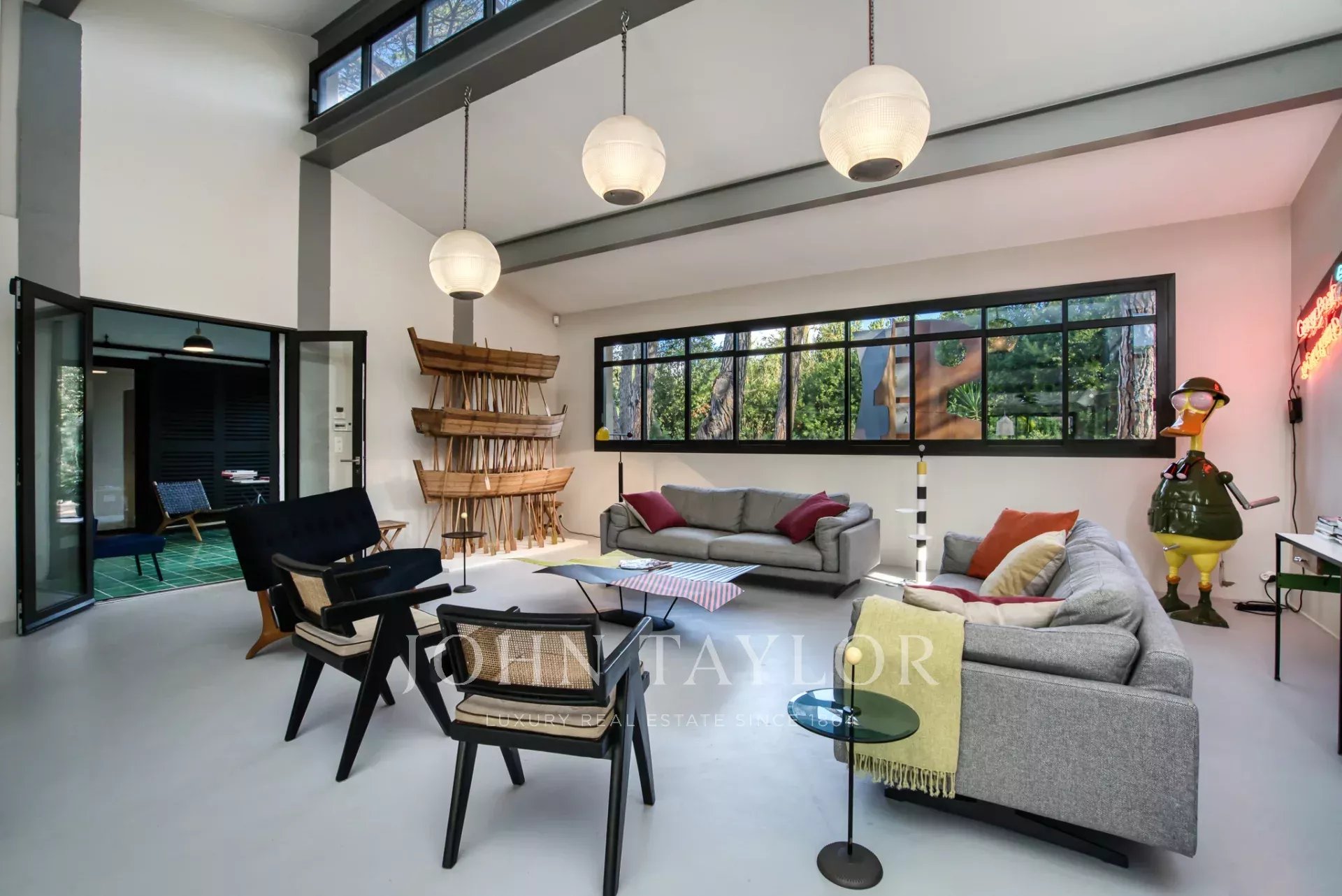 Autrefois un atelier d'artiste, cette propriété minutieusement rénovée de 220 m2 respire le caractère et le charme. Entièrement climatisée, elle bénéficie d'un jardin luxuriant s'étendant sur environ 5000 m2, créé avec soin par les renommés paysagistes "Essard et Maurieres", offrant un accès exclusif à la baie des Canoubiers.