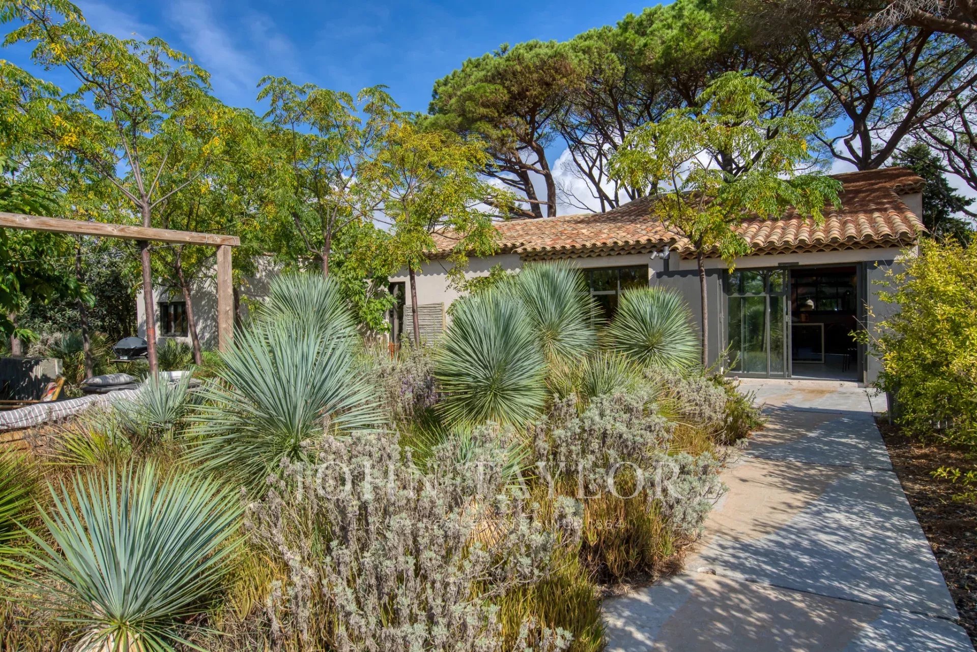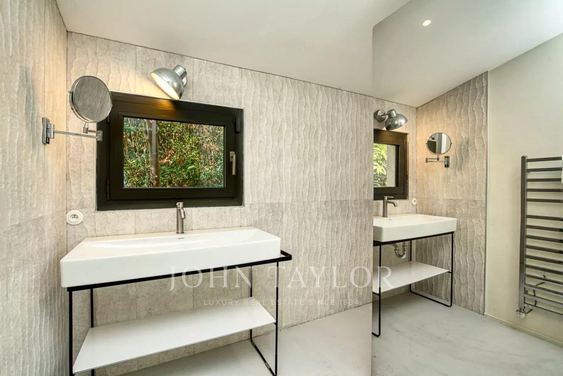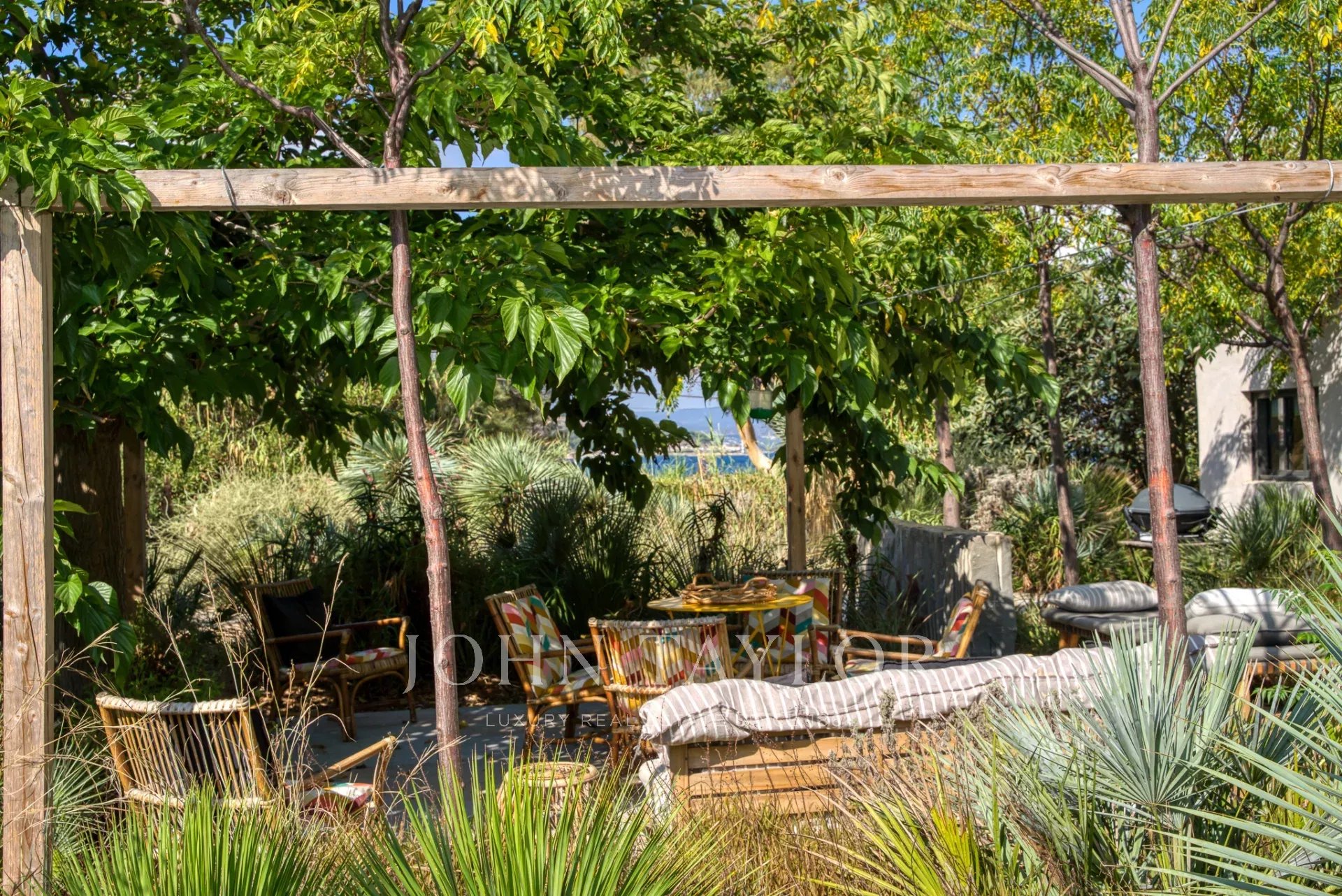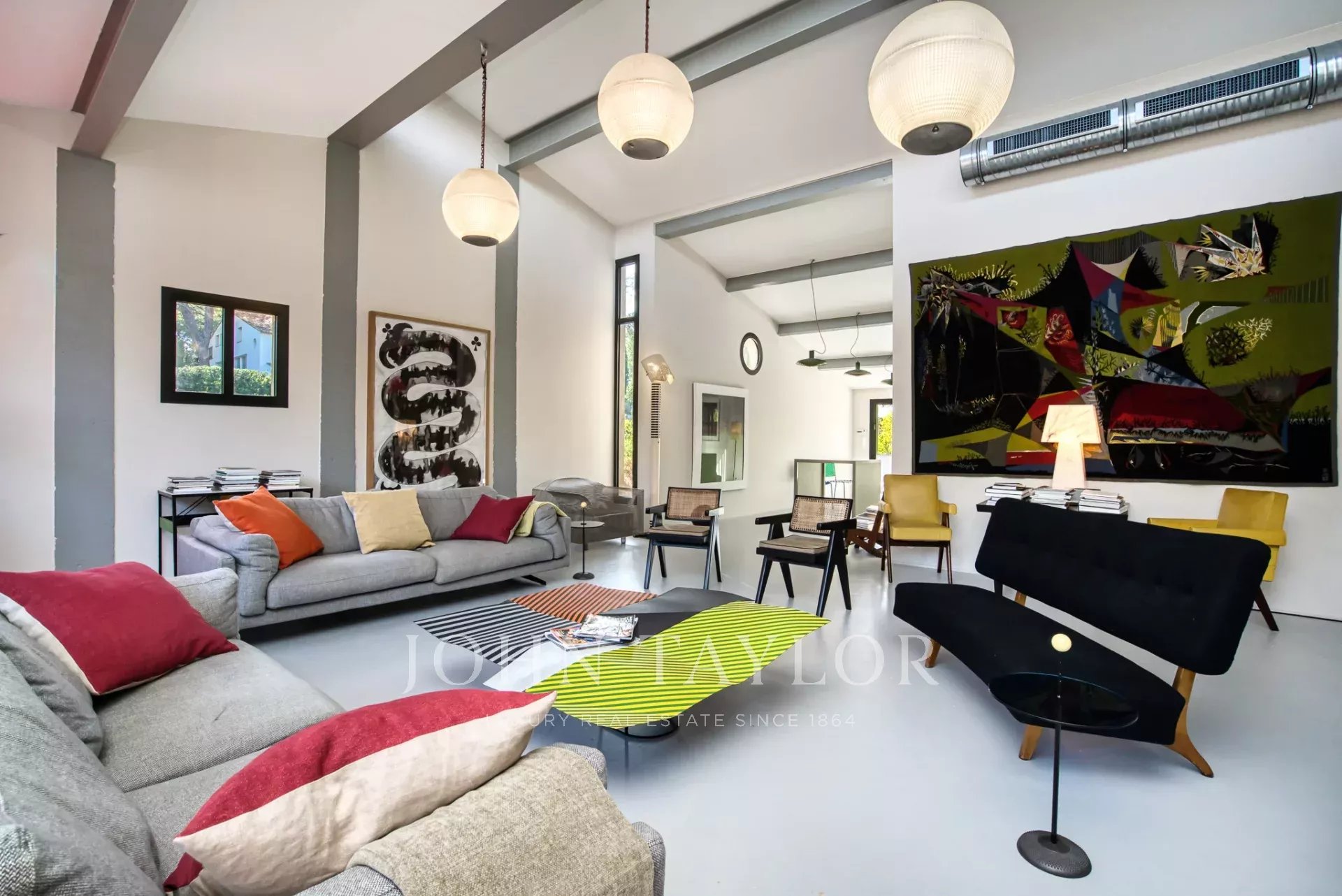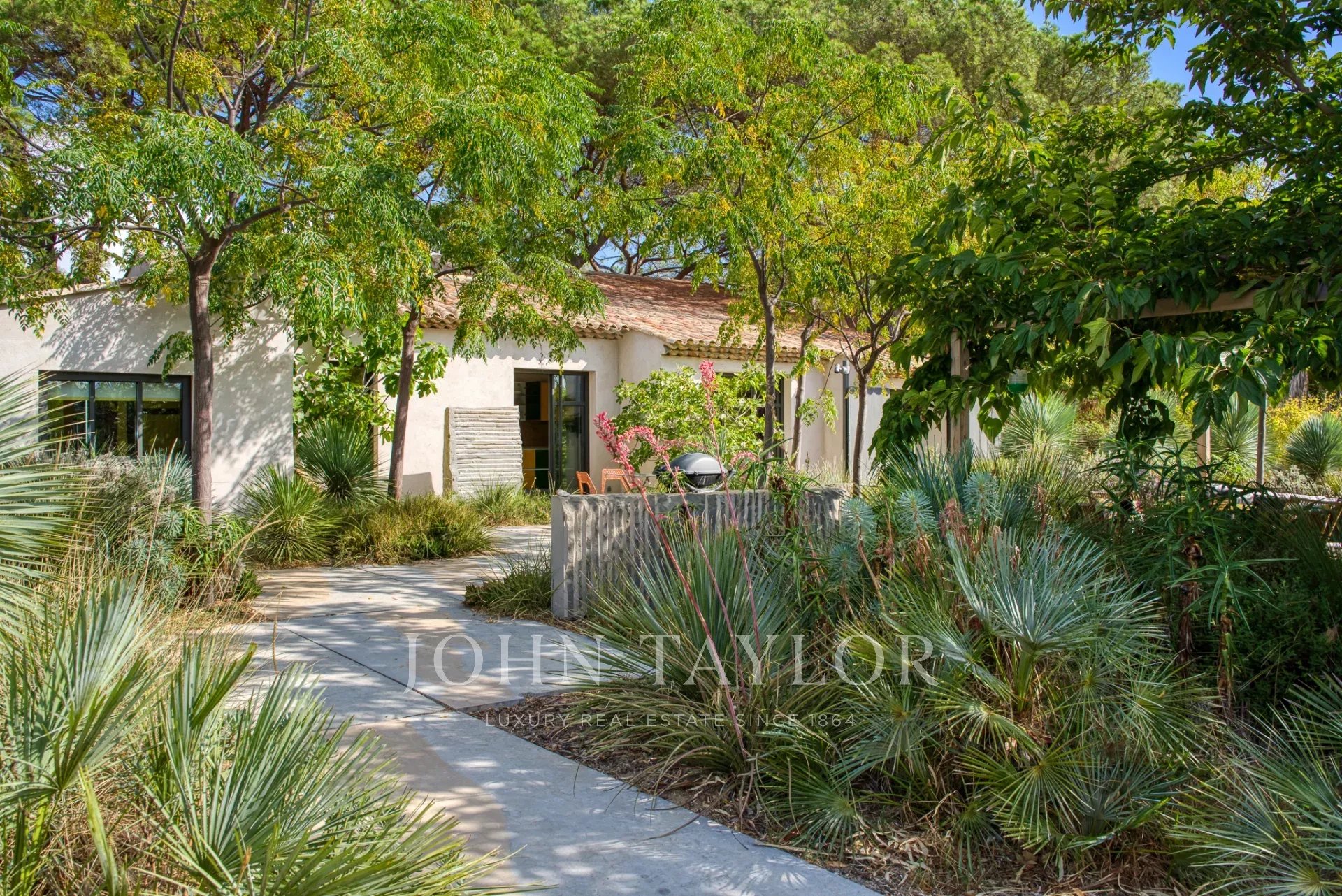 Autrefois un atelier d'artiste, cette propriété minutieusement rénovée de 220 m2 respire le caractère et le charme. Entièrement climatisée, elle bénéficie d'un jardin luxuriant s'étendant sur environ 5000 m2, créé avec soin par les renommés paysagistes "Essard et Maurieres", offrant un accès exclusif à la baie des Canoubiers.