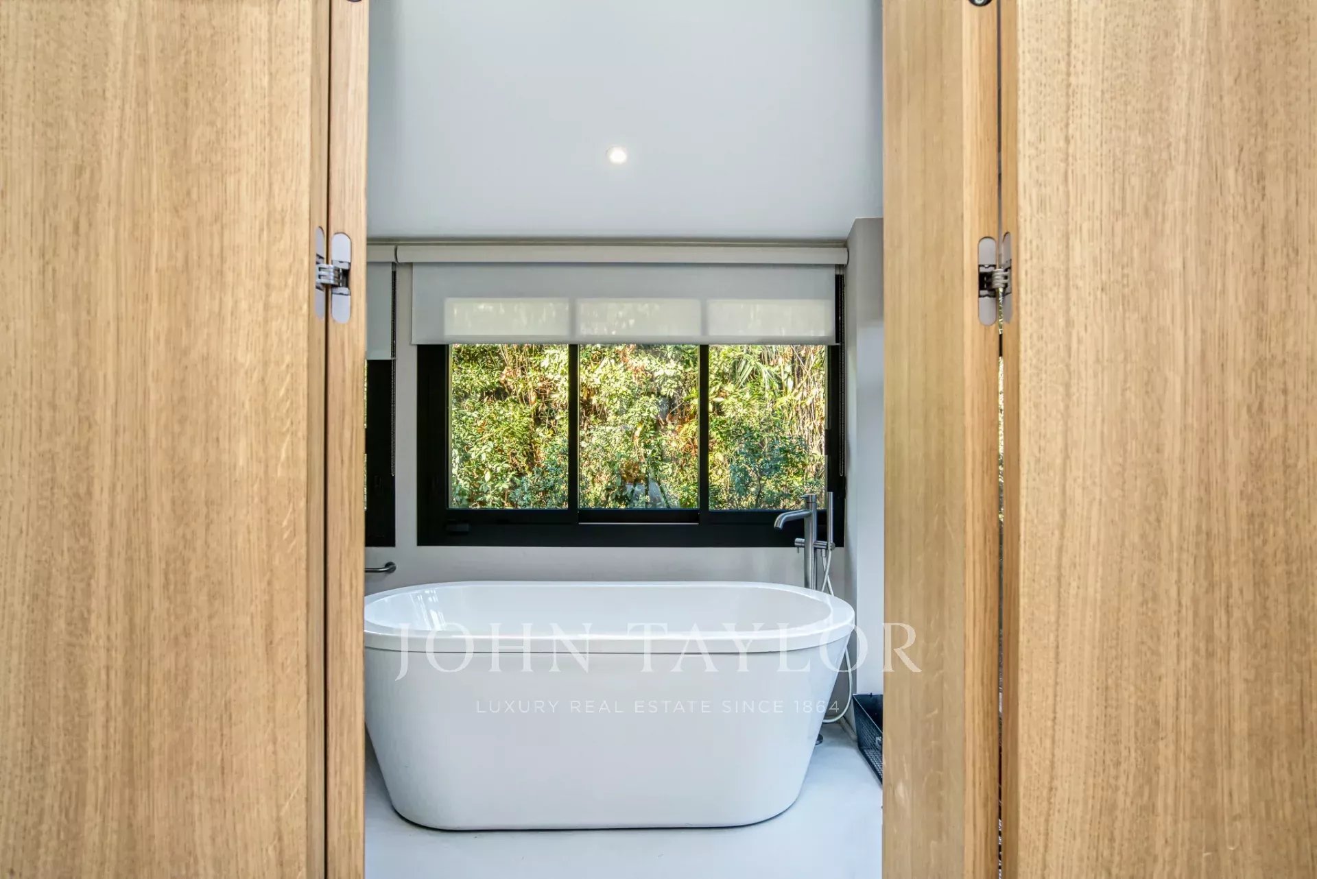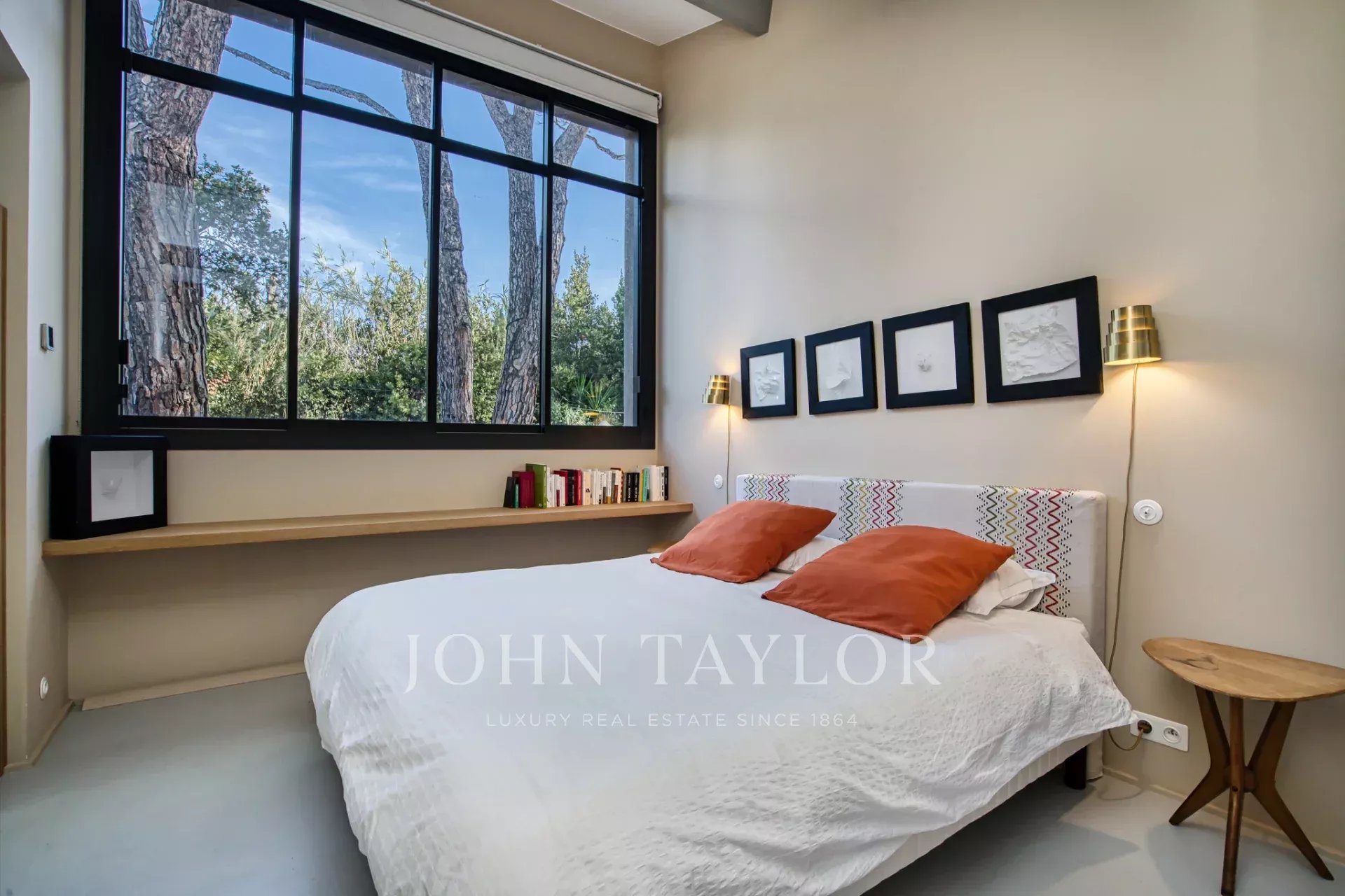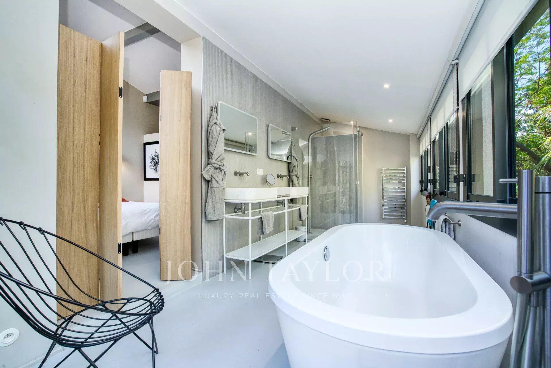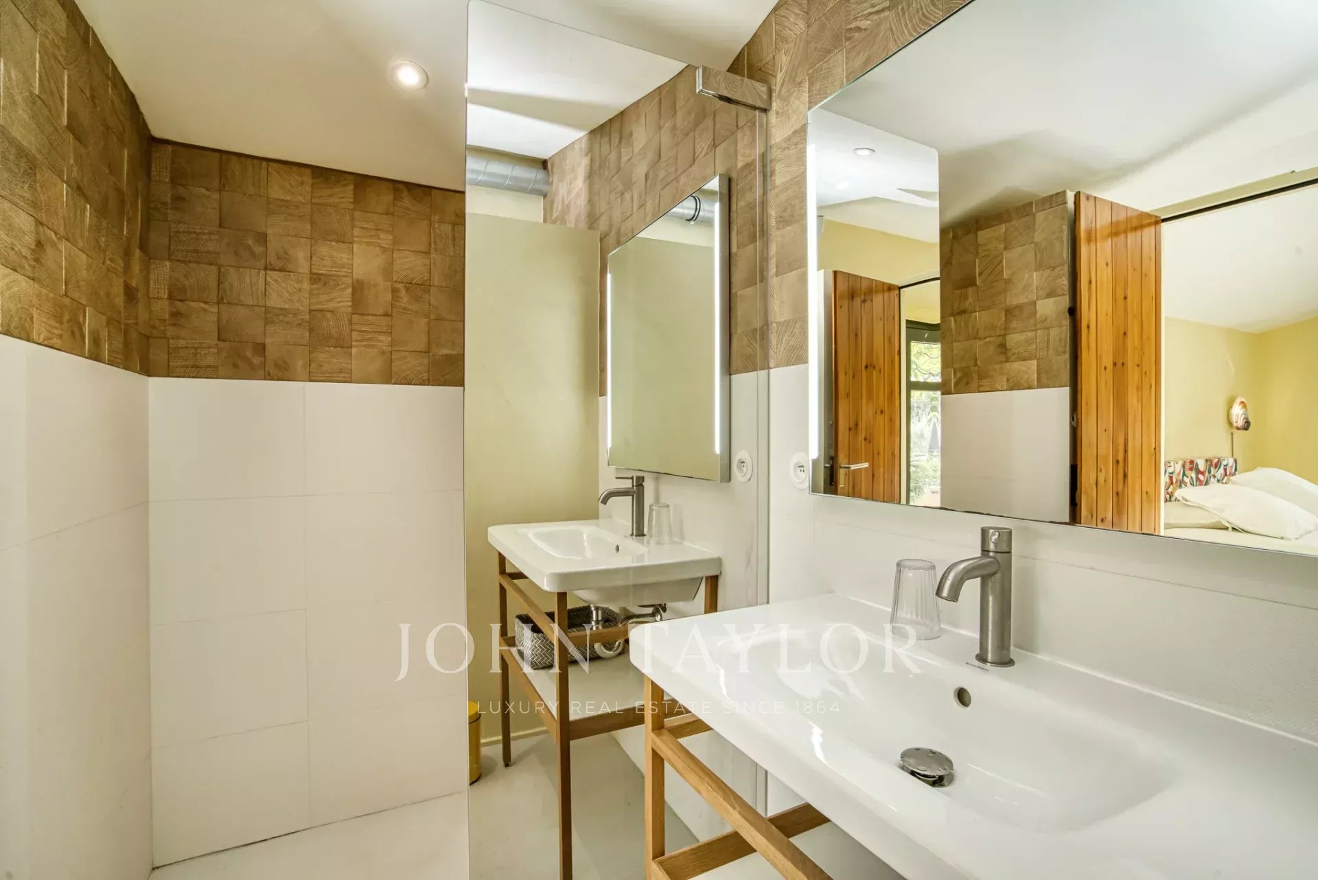 Autrefois un atelier d'artiste, cette propriété minutieusement rénovée de 220 m2 respire le caractère et le charme. Entièrement climatisée, elle bénéficie d'un jardin luxuriant s'étendant sur environ 5000 m2, créé avec soin par les renommés paysagistes "Essard et Maurieres", offrant un accès exclusif à la baie des Canoubiers.