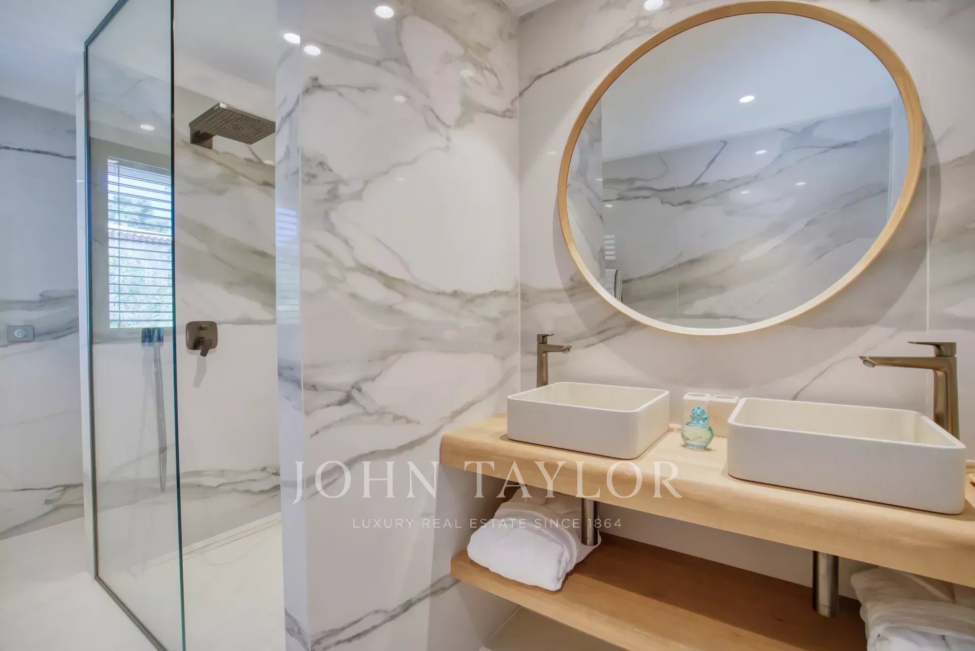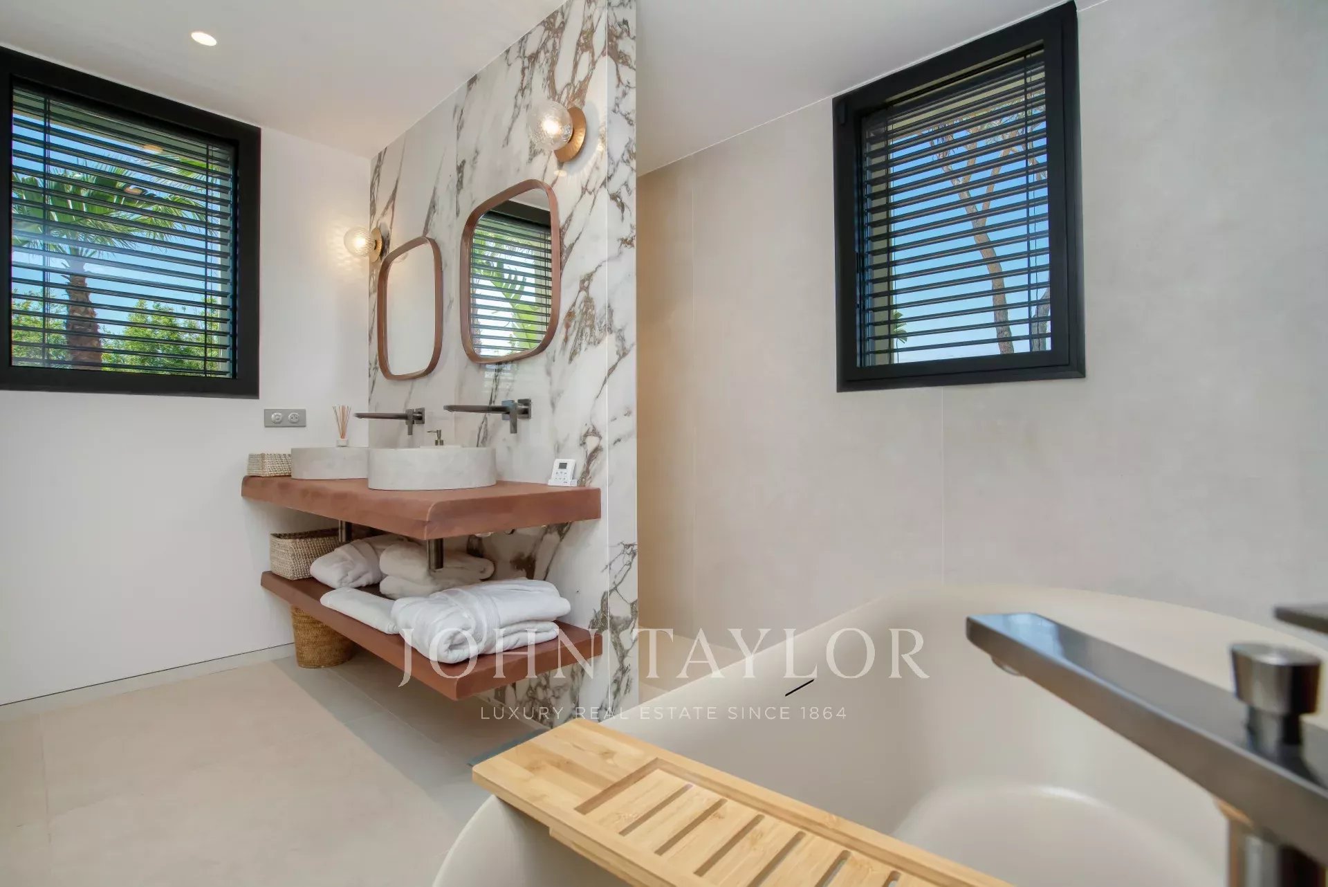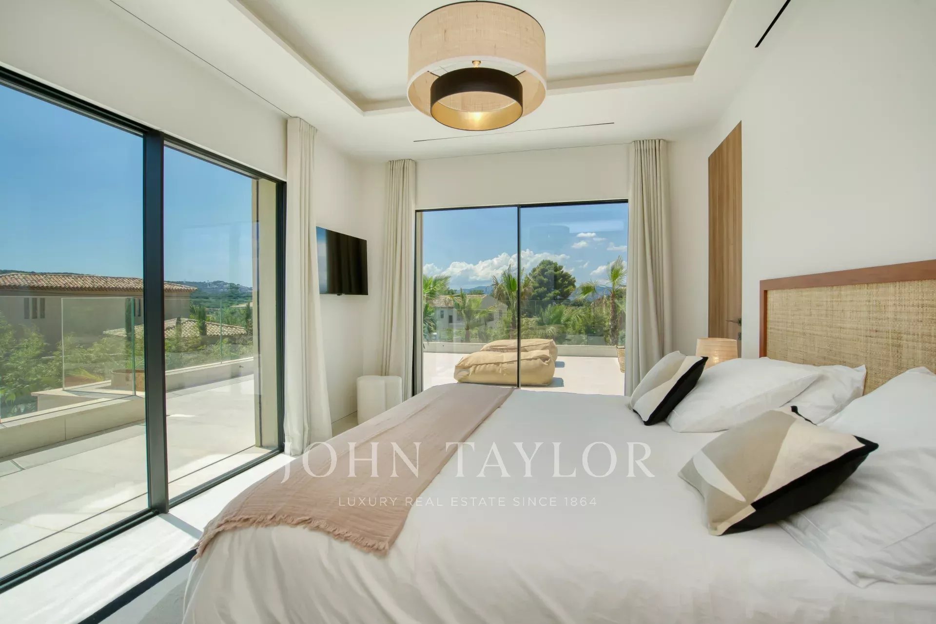 - Chambre 2: Cette chambre dispose d'une terrasse, d'un lit king size (180x200), d'une salle de douche avec double vasque, de toilette ainsi que des placards avec un coffre-fort.