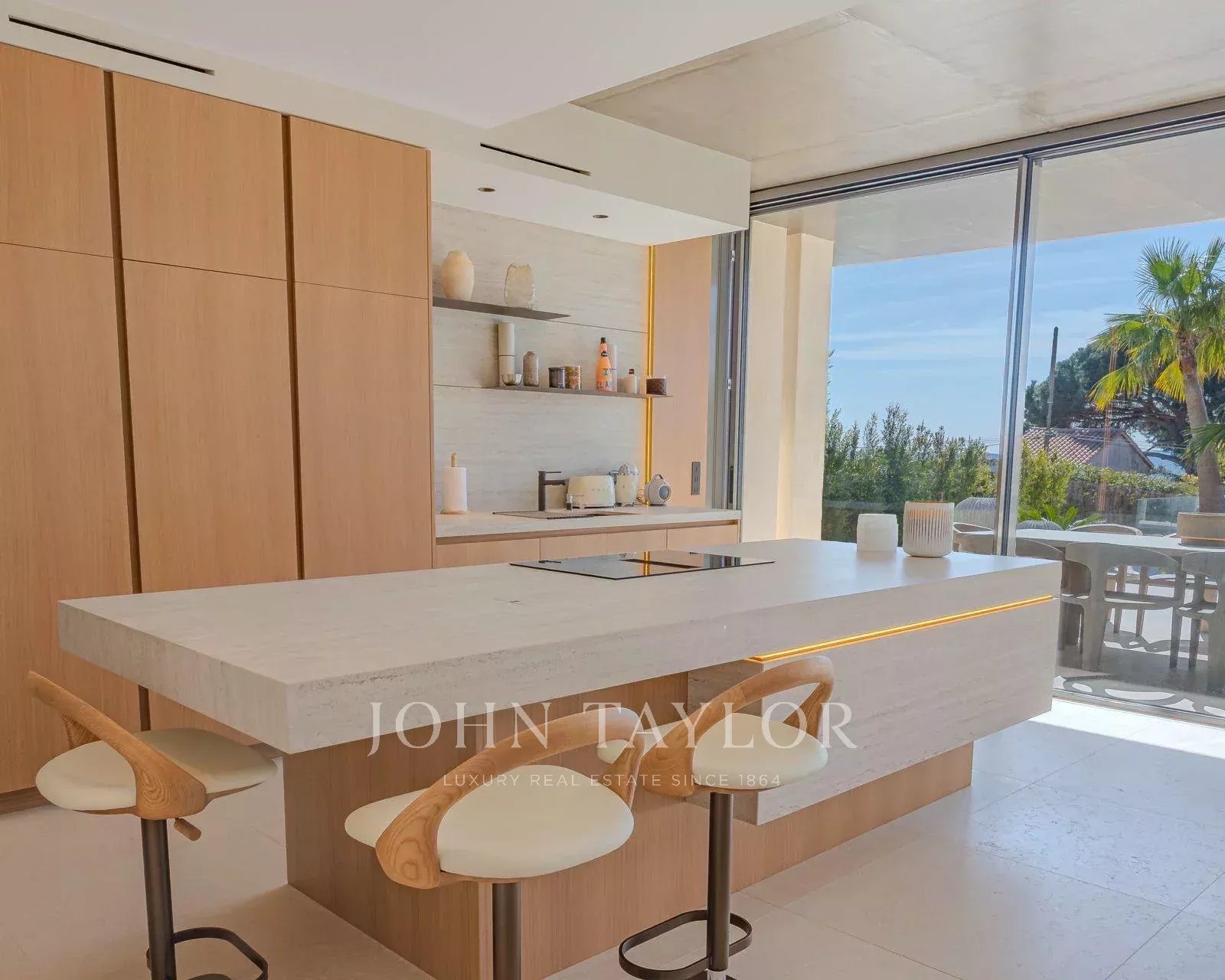 - Une entrée ouvrant sur une vaste pièce à vivre comprenant une cuisine ouverte parfaitement équipée (2 réfrigérateurs, four traditionnel, micro-ondes, espace café, électroménager SMEG), un salon et une salle à manger ouvrant sur une terrasse avec vue mer