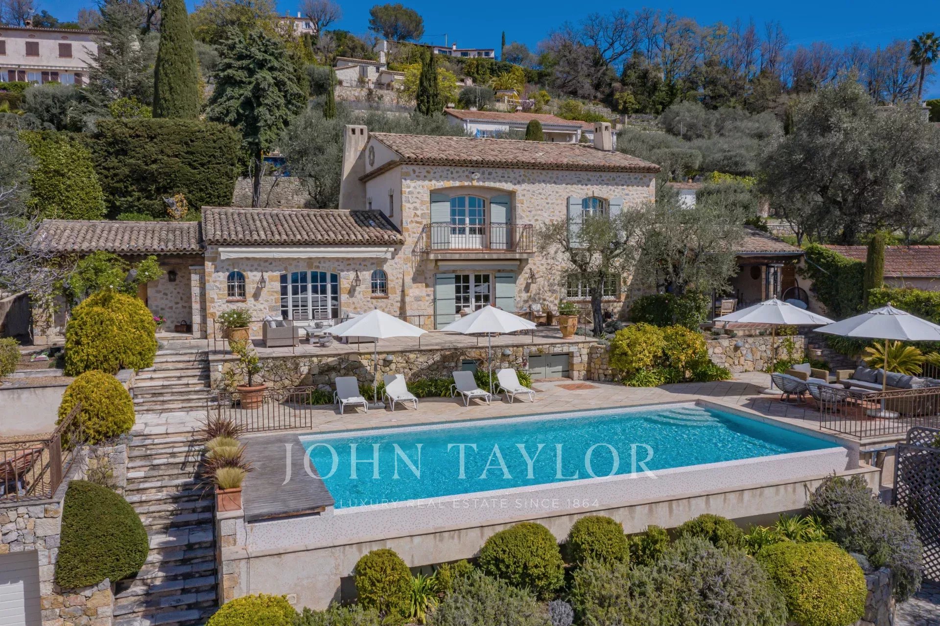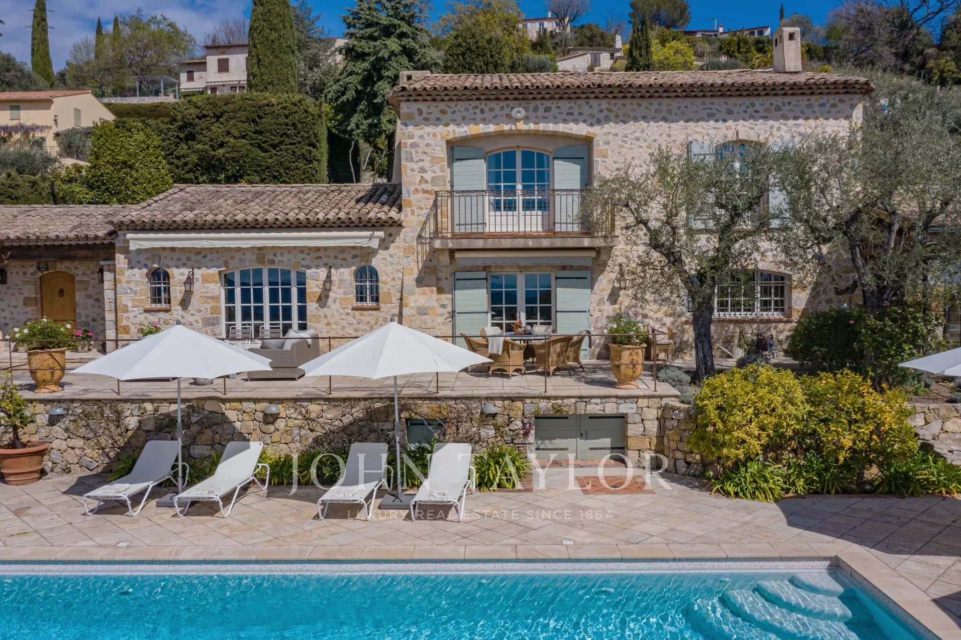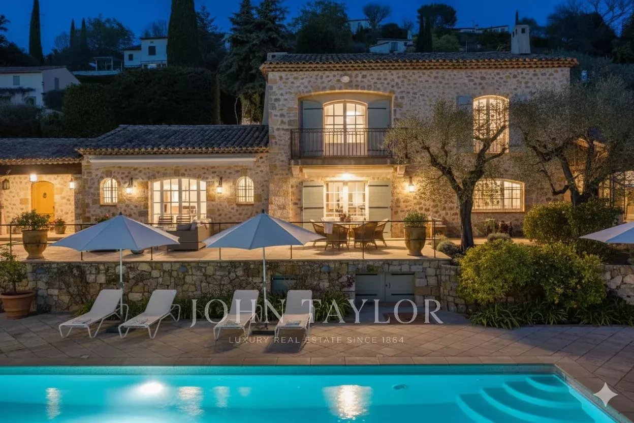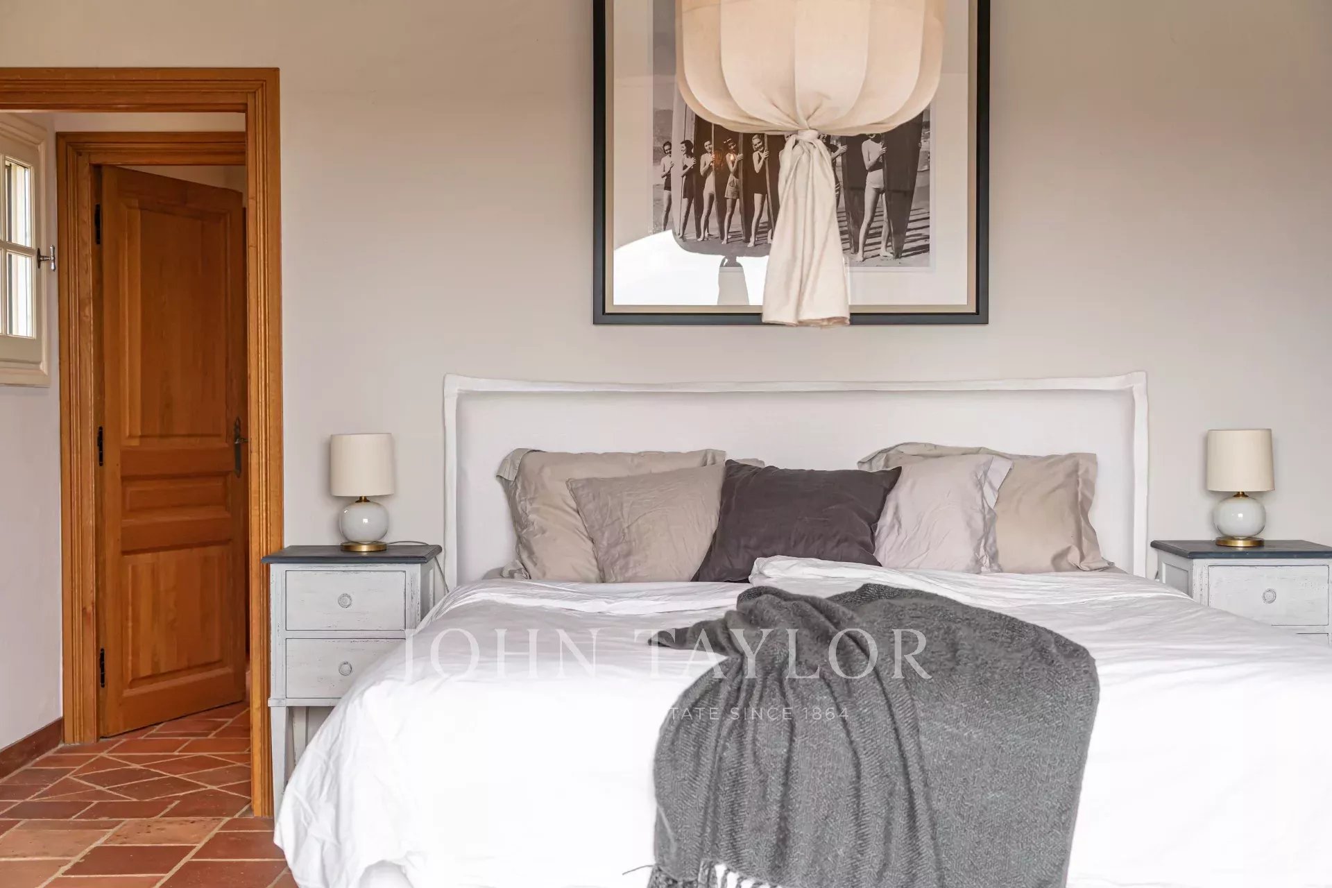 Cette splendide bastide en pierre jouit d'une vue panoramique plein sud au-dessus de la colline et jusqu'à la mer.