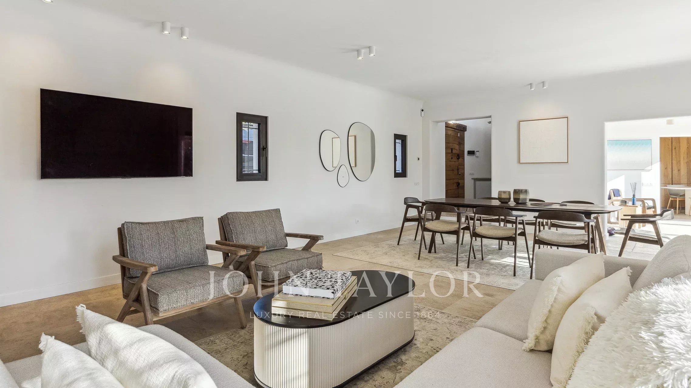 Vaste espace de vie lumineux avec salon TV, cheminée, salle à manger et accès direct au jardin