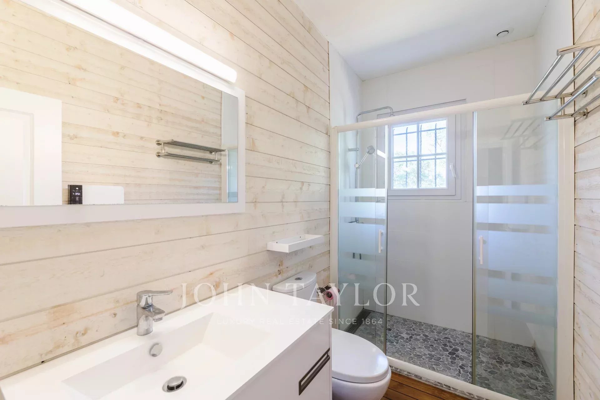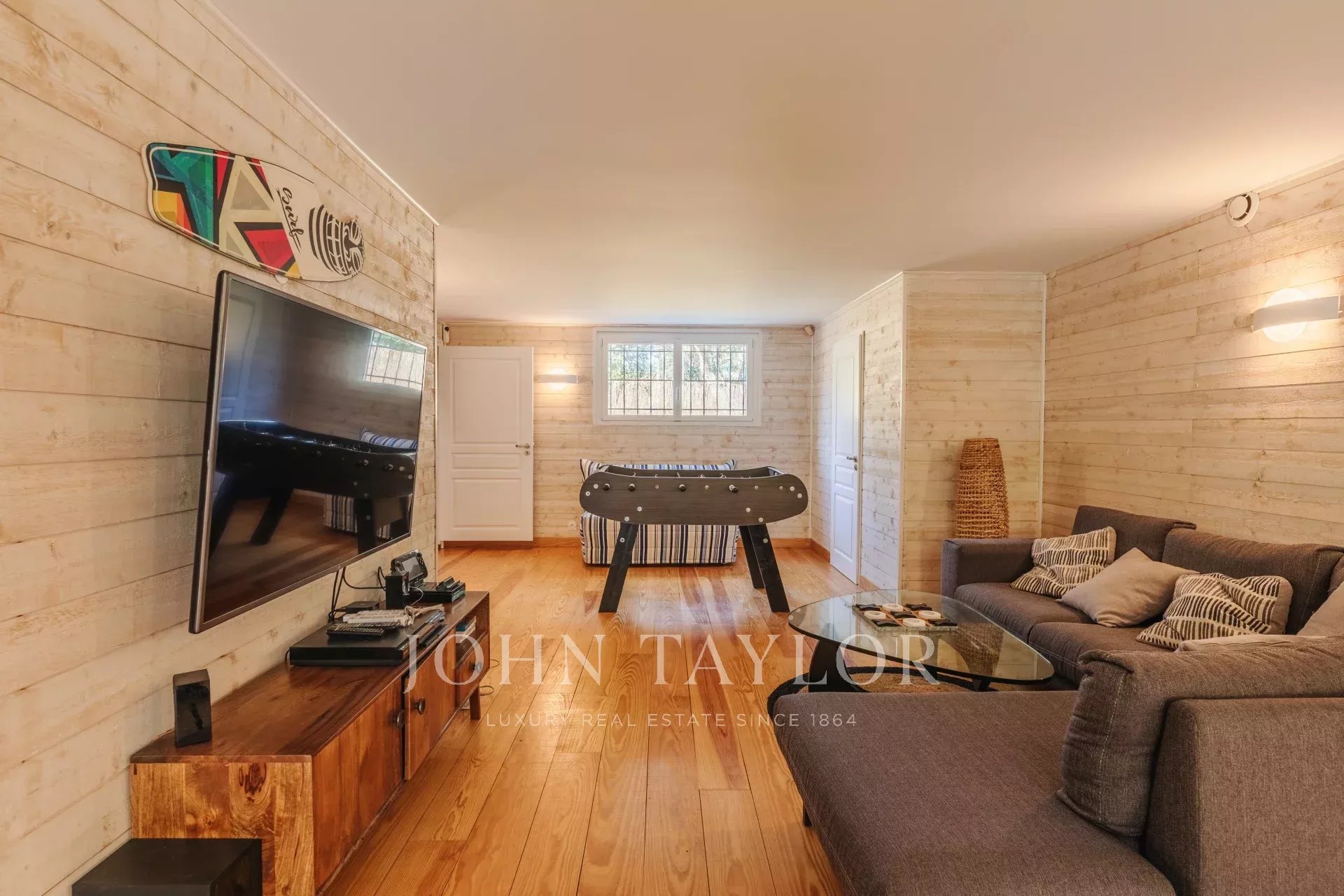 À l'étage, un séjour élégant avec cuisine ouverte et salle à manger s'ouvre sur une terrasse principale. L'espace nuit comprend quatre chambres, dont deux suites avec salles d'eau attenantes.