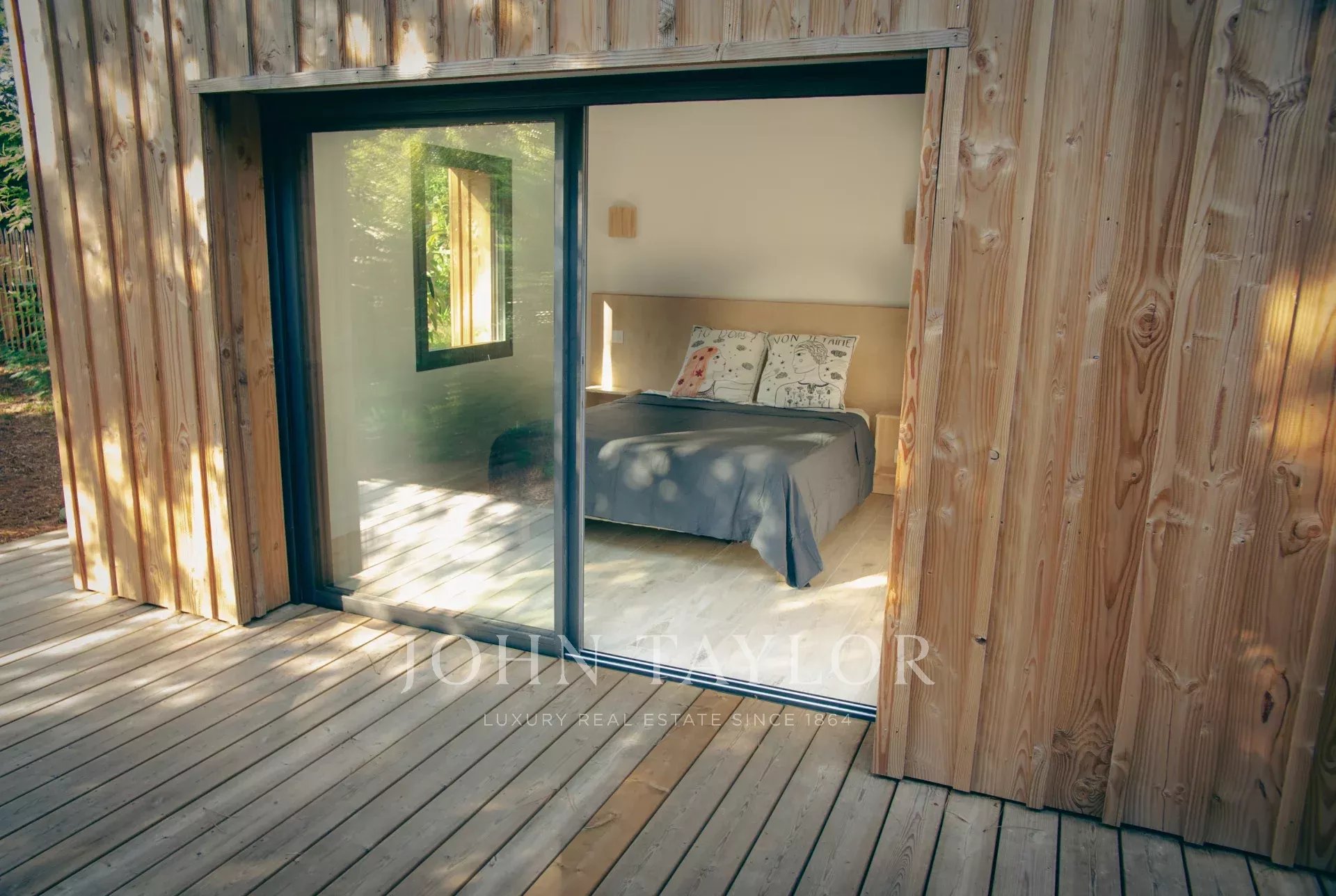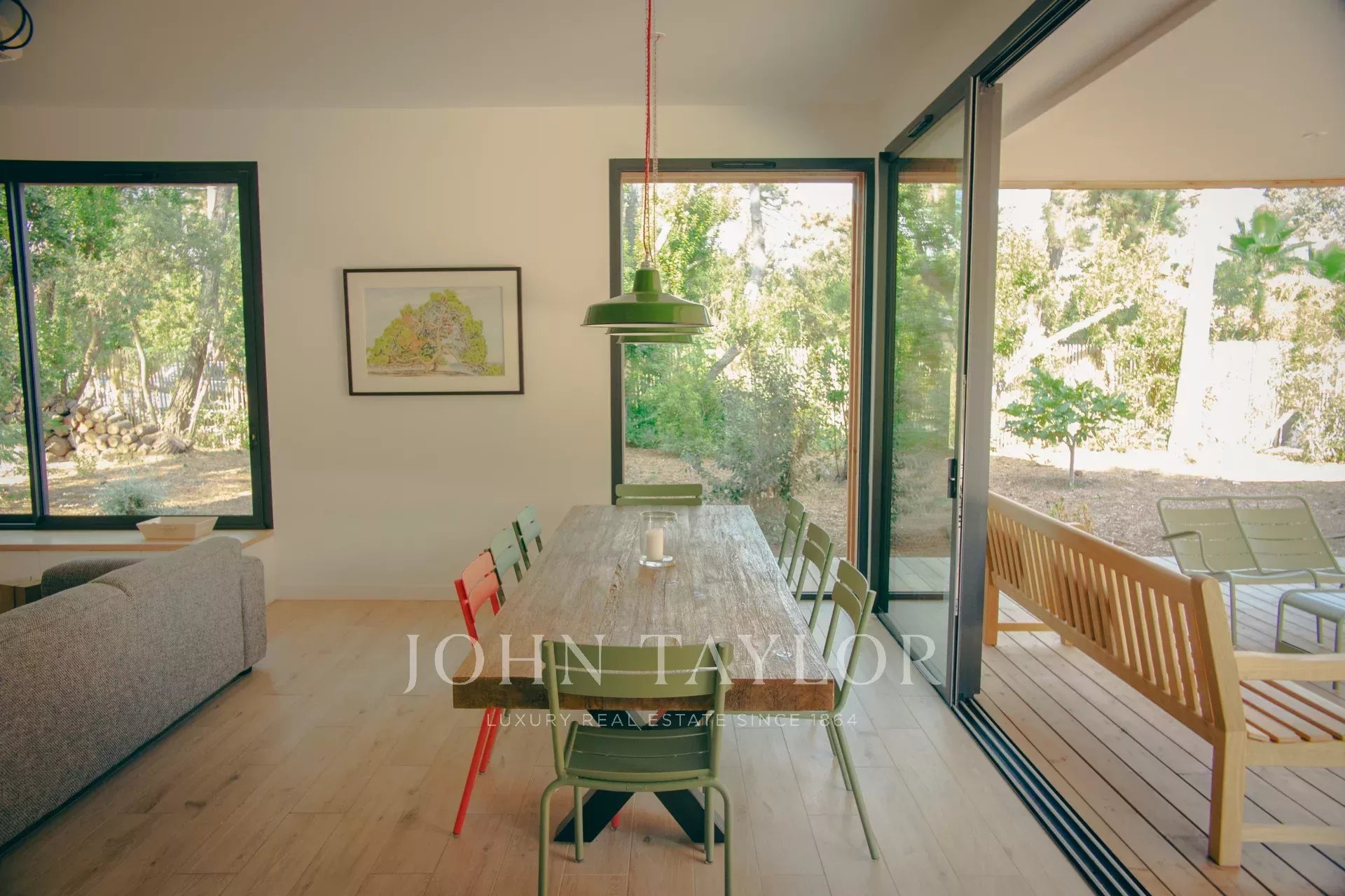 À l'extérieur, une belle terrasse en bois semi-couverte invite aux déjeuners ensoleillés, aux apéritifs conviviaux ou aux parties de pétanque animées.