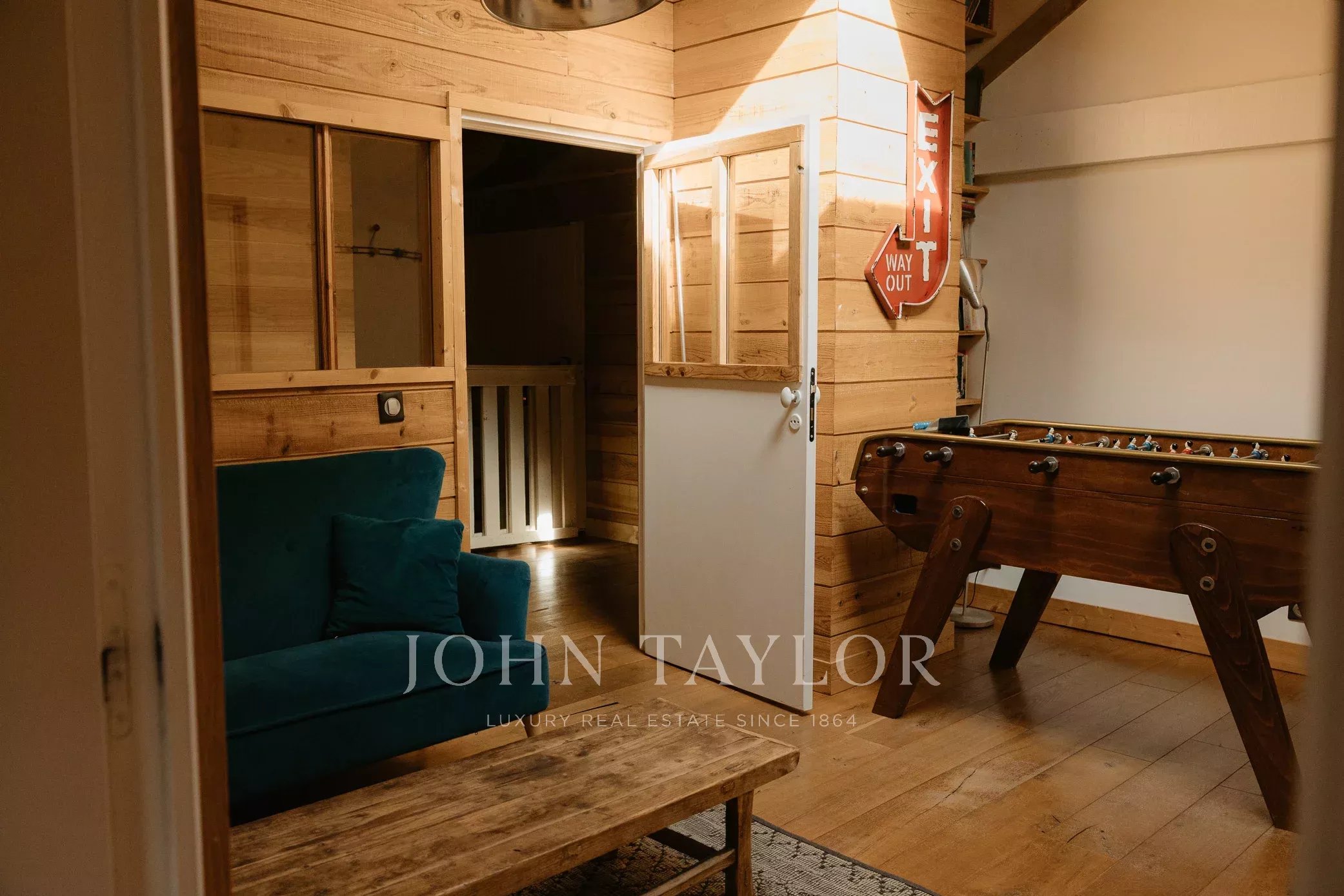 Les extérieurs, véritables havres de paix, sont une invitation à la douceur de vivre. La piscine chauffée, lovée au cœur d’un jardin verdoyant, promet des instants de relaxation inoubliables à l'abri des regards. À la nuit tombée, le braséro devient le lieu privilégié pour des soirées chaleureuses, tandis que le terrain de pétanque ajoute une touche de convivialité typiquement locale. Les enfants, quant à eux, trouveront leur bonheur dans une salle de jeux pensée pour éveiller leur imagination.