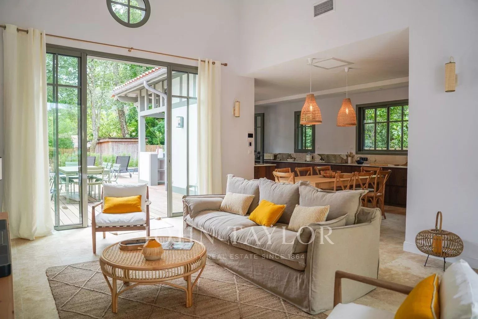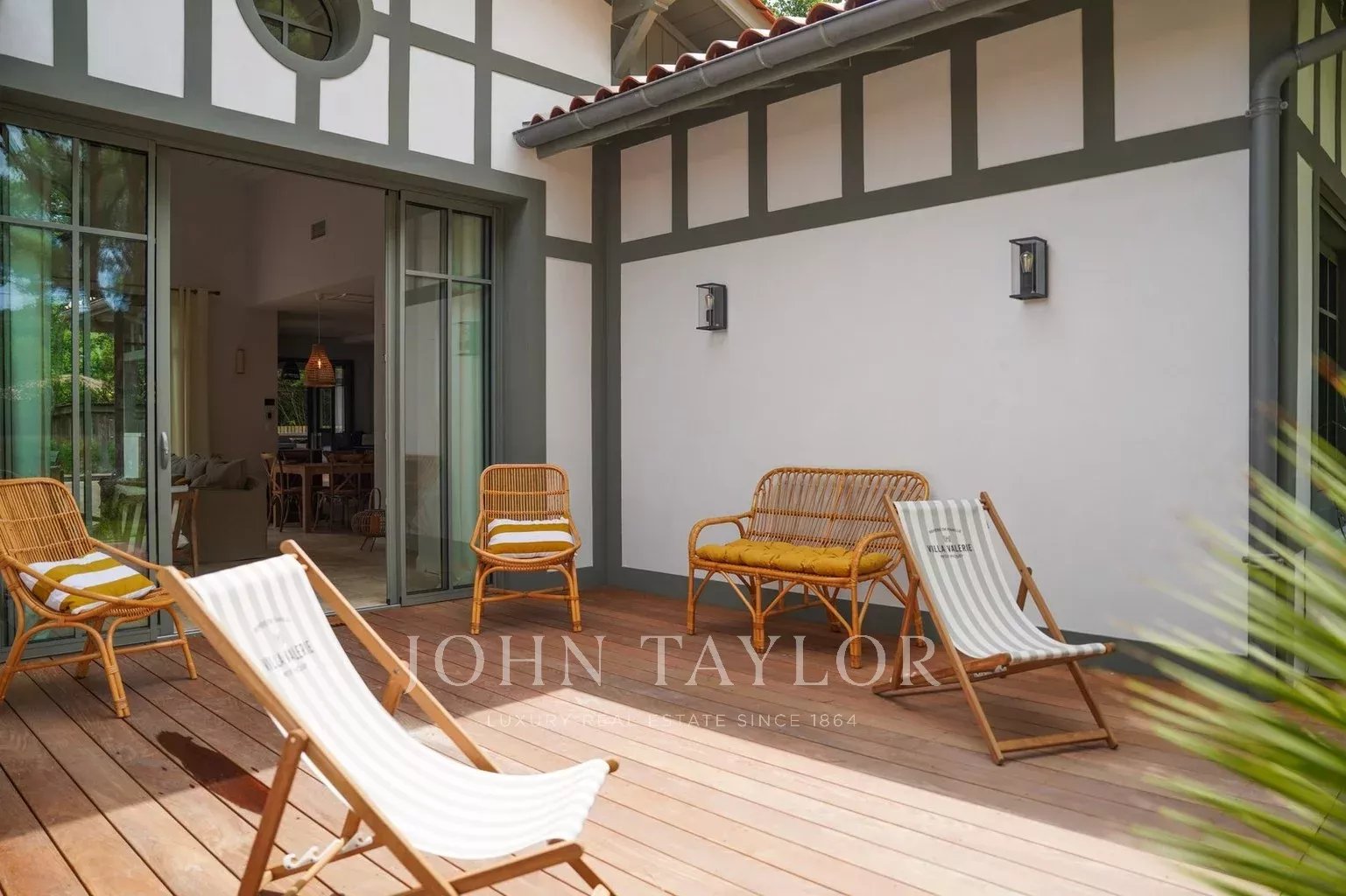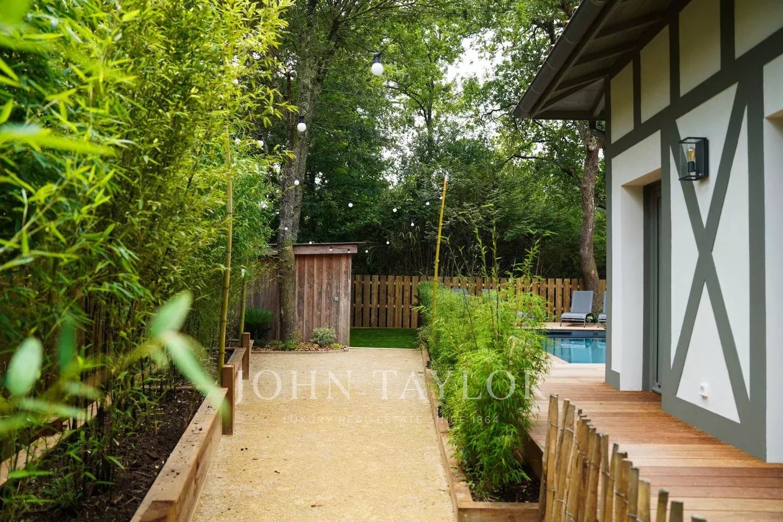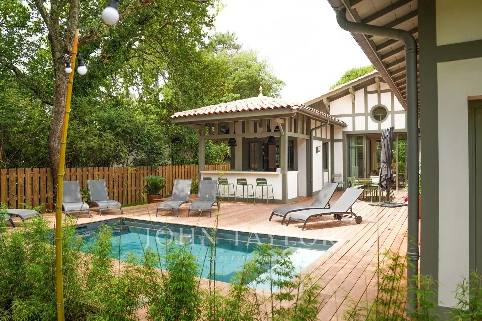 Deux terrasses exposées est et ouest permettent de profiter du soleil à toute heure de la journée. Les extérieurs proposent une piscine chauffée de 6 x 2,5 m sécurisée par volet roulant immergé, une cuisine d’été avec plancha et évier, un WC extérieur ainsi qu’un terrain de pétanque éclairé par des lumières guinguette. Le mobilier de jardin FERMOB comprend une grande table pour 10 à 12 personnes, des bains de soleil et un salon de jardin.